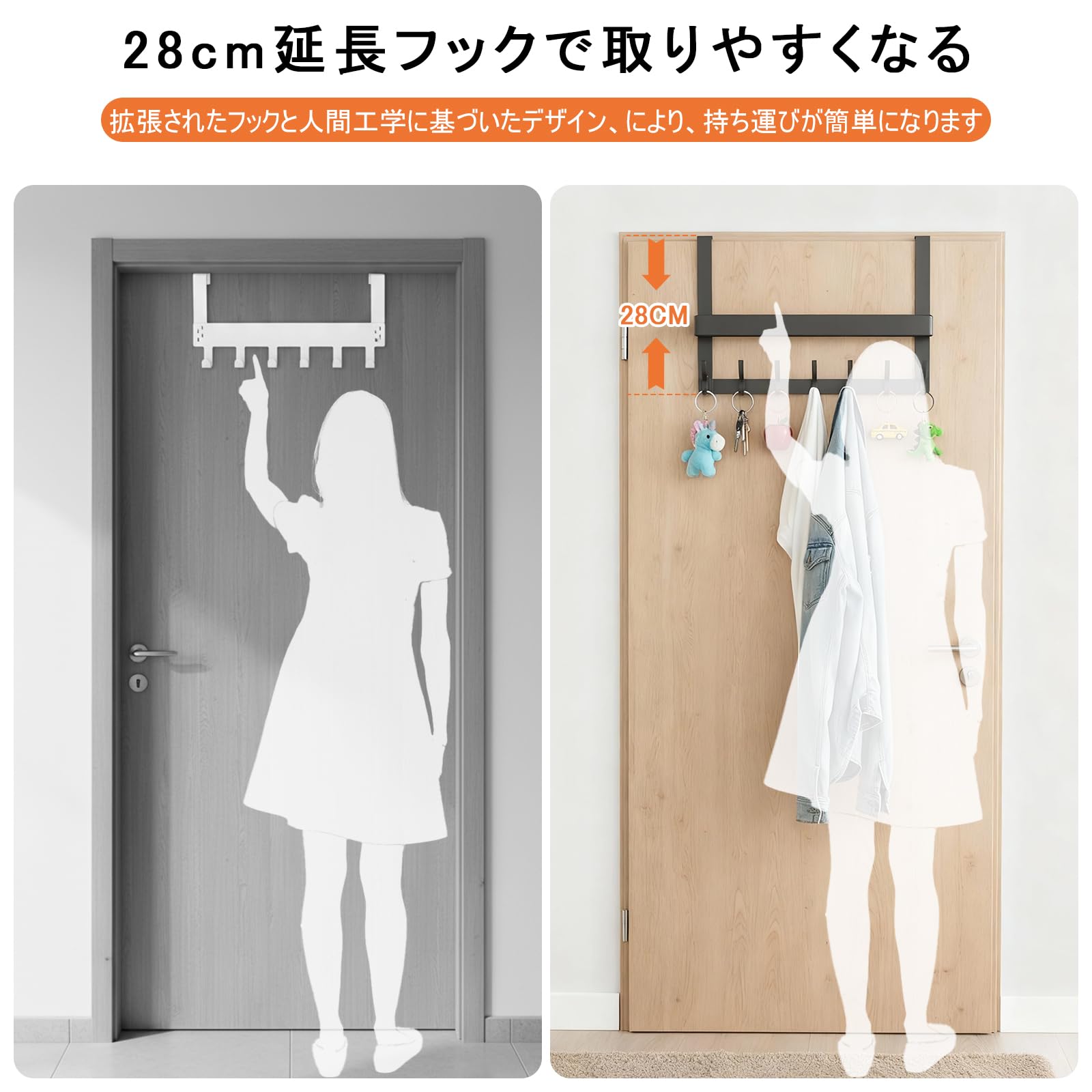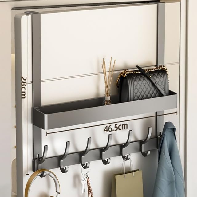 ドアハンガー ドア掛けフック 玄関掛け ドアハンガーワイド 強い耐荷重 吊り下げ 省スペース 穴あけ不要 長さ46.5cm幅8.5cm 高さ28cm 7連ハンガー 静音 カバン/帽子/服/タオル/傘バッグ掛けフック 玄関/浴室/トイレ/キッチン 収納用