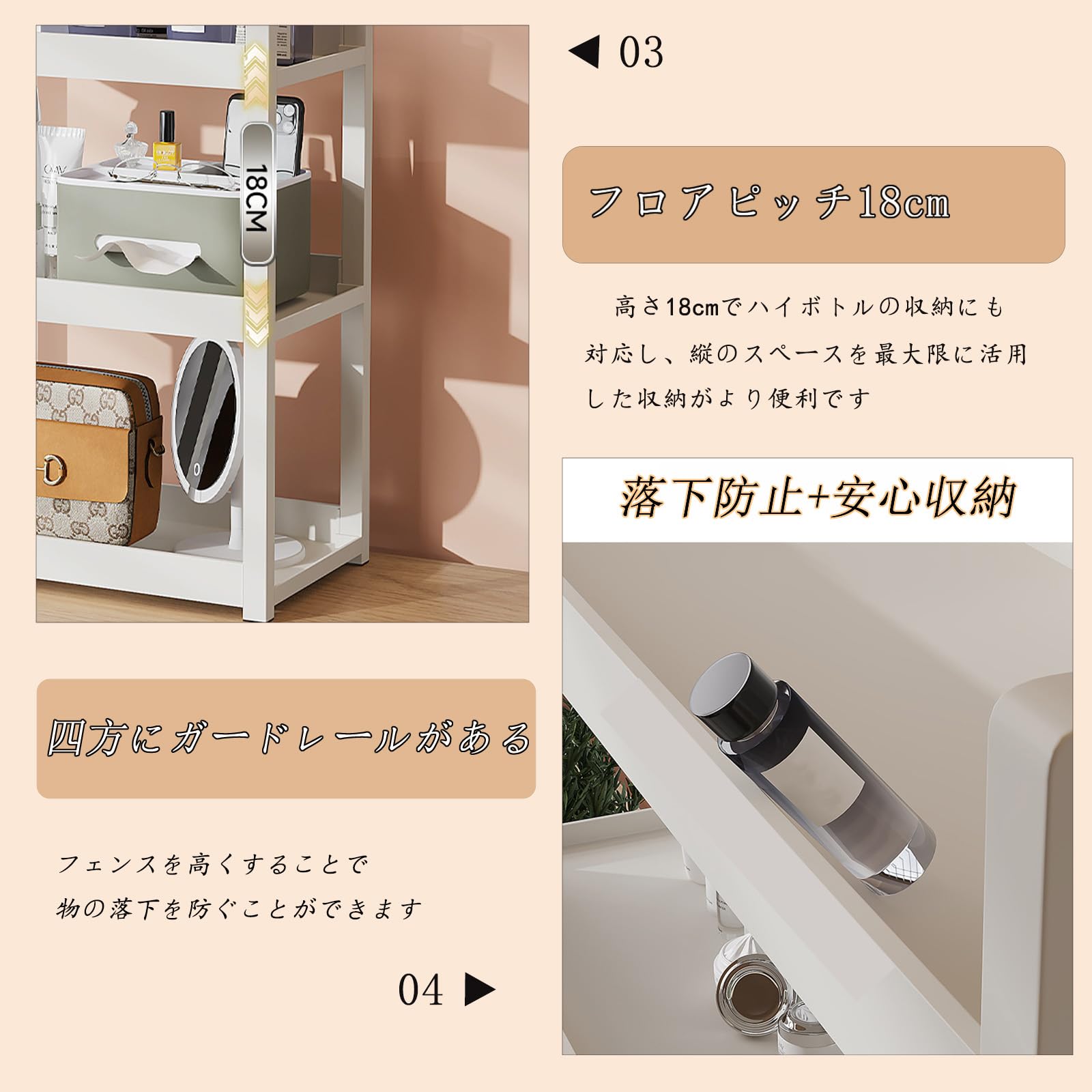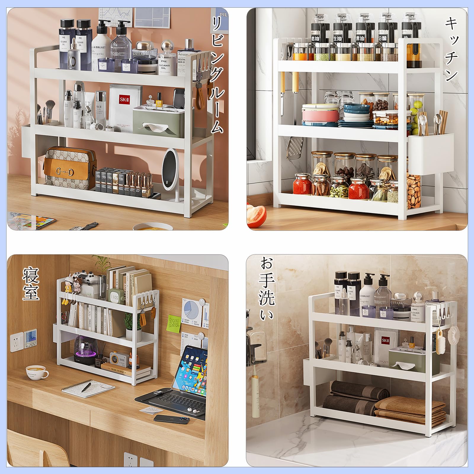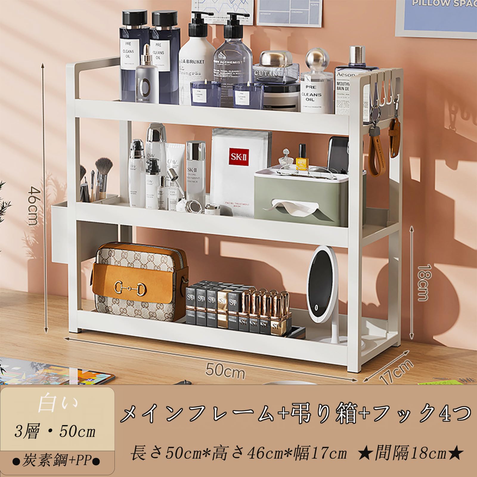 卓上 ラック 卓上棚 デスク上収納ラック 机上 文房具収納 小物収納 学校 書架 組み立て簡単 三段幅50cm×奥行17cm×高さ46cm 調味料収納 多機能 多用途 小物入れ 化粧台 浴室/寮/キッチン収納用 フック付き 白い