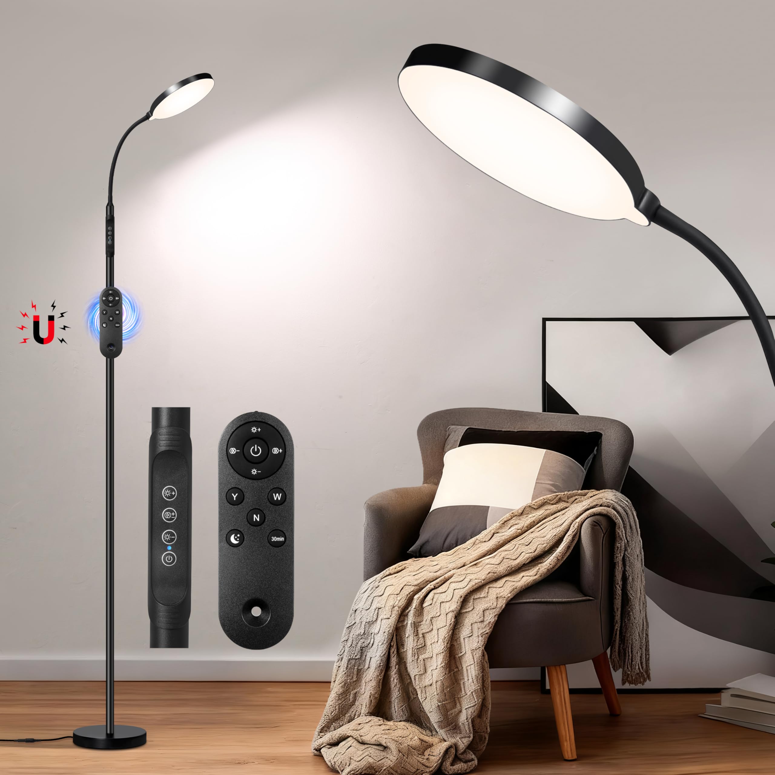 目に優しいフルスペクトルLEDフロアランプ、マグネット式リモコン&ポールコントロール、調節可能なグースネック調光機能(3000K~6500K)、リビングルーム、寝室、オフィス、読書に最適な安定したベース、ブラック