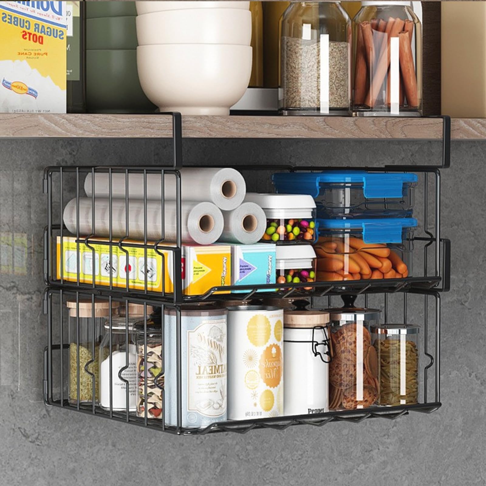 NATTY NING【吊り下げ収納バスケット 折りたたみ可能 積み重ね可能】 穴あけ不要 キッチン収納ラック 省スペース 落下防止設計 戸棚/キッチン収納用 (ブラック, 1個セット)
