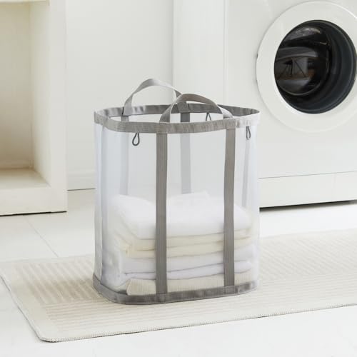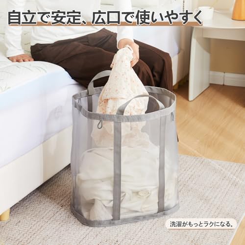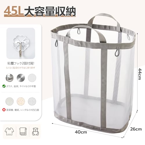 TECHMILLY ランドリーバッグ 折りたたみ 大容量 洗濯カゴ 自立式 軽量 ランドリーバスケット 通気性のよい メッシュ 洗濯バッグ 取っ手付き 粘着フック付き 壁掛け 洗濯物入れ 収納 バッグ ぬいぐるみ収納 旅行 家庭用 キャンプ 長さ40CM幅さ26CM高さ44CM (グレー、1PCS)