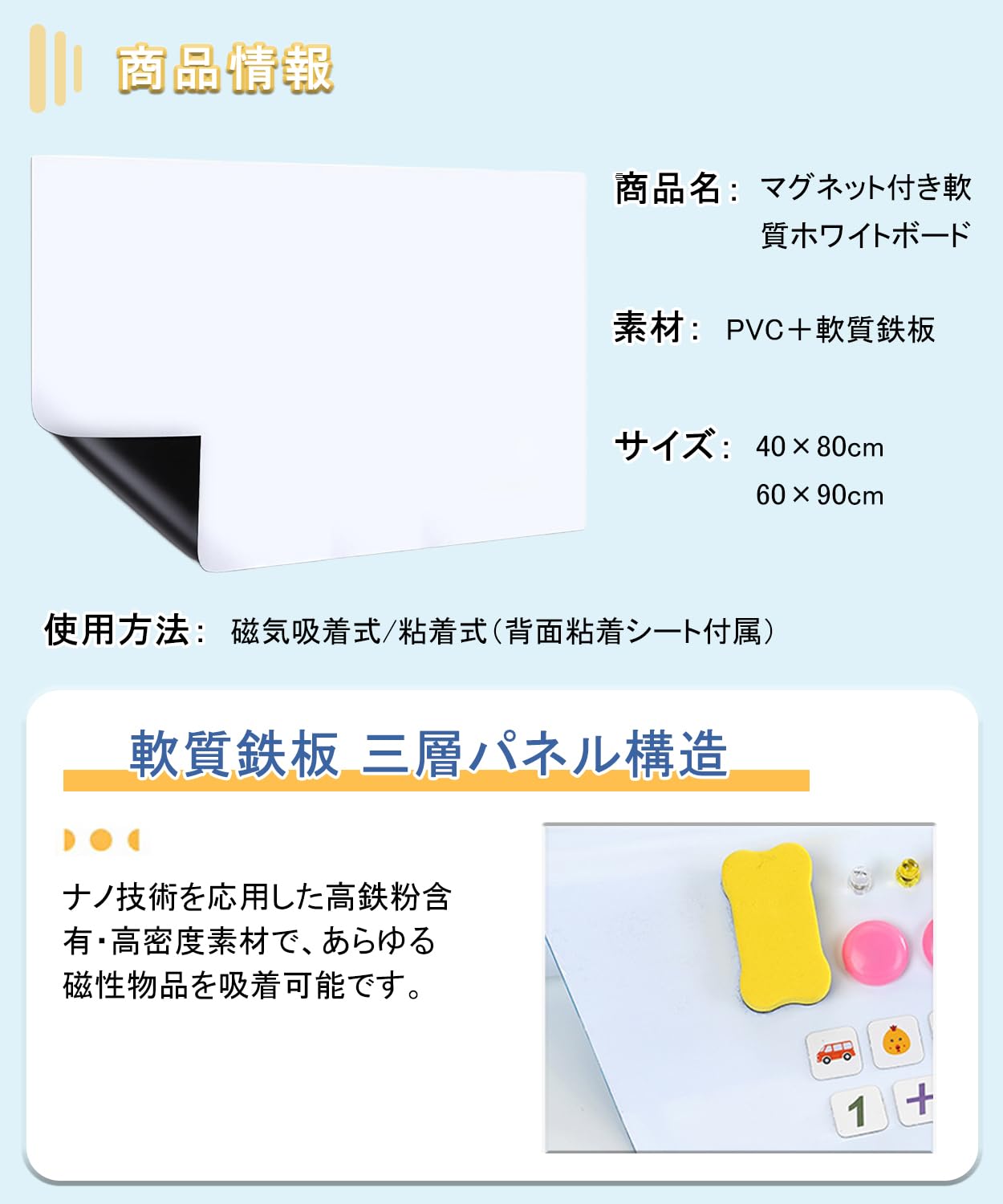 BTtime ホワイトボート ホワイトシート 自由に裁断 取り付け簡単 粘着式 マグネット対応 壁に貼り付け こども落書き/予定表/掲示板/メモー/オフィス用 (60*90cm)