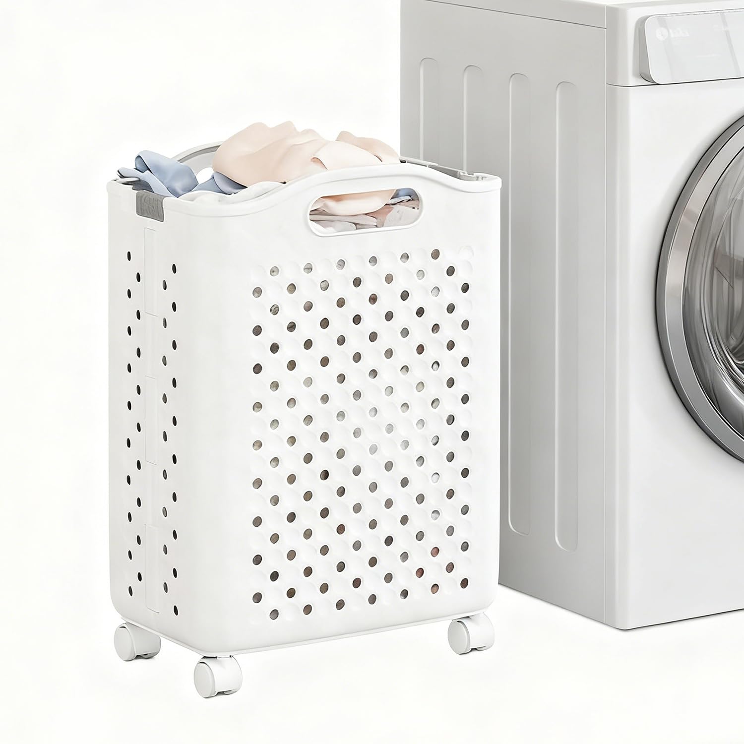 SmartMaster ランドリー バスケット 折り畳み 洗濯かご キャスター付き ランドリーボックス 運びやすく 取っ手付き 32L 大容量 通気性 幅22CM スリム 隙間収納 衣類収納 寝室 脱衣所 おしゃれ 省スペース 組立簡単 PPプラスチック 軽量 防水 ホワイト
