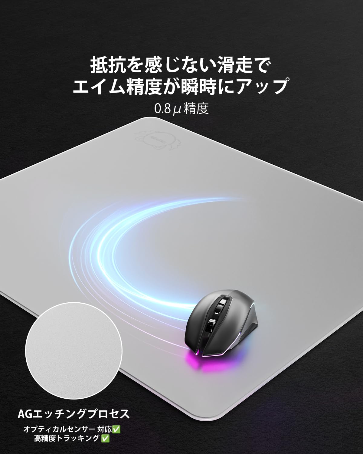 「肌のような触感、新発想のガラスマウスパッド」Tinshyn ゲーミングマウスパッド マウスパッド ガラス 丸み加工の滑り止め底/0.8μ高精度サンドブラスト表面/手入れ簡単/ほこり取り布付き/貼り替え マウスソール付き