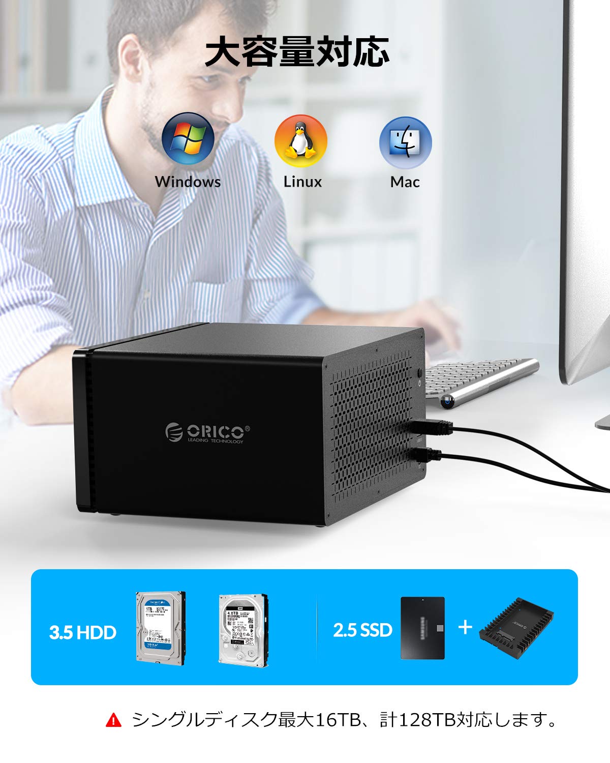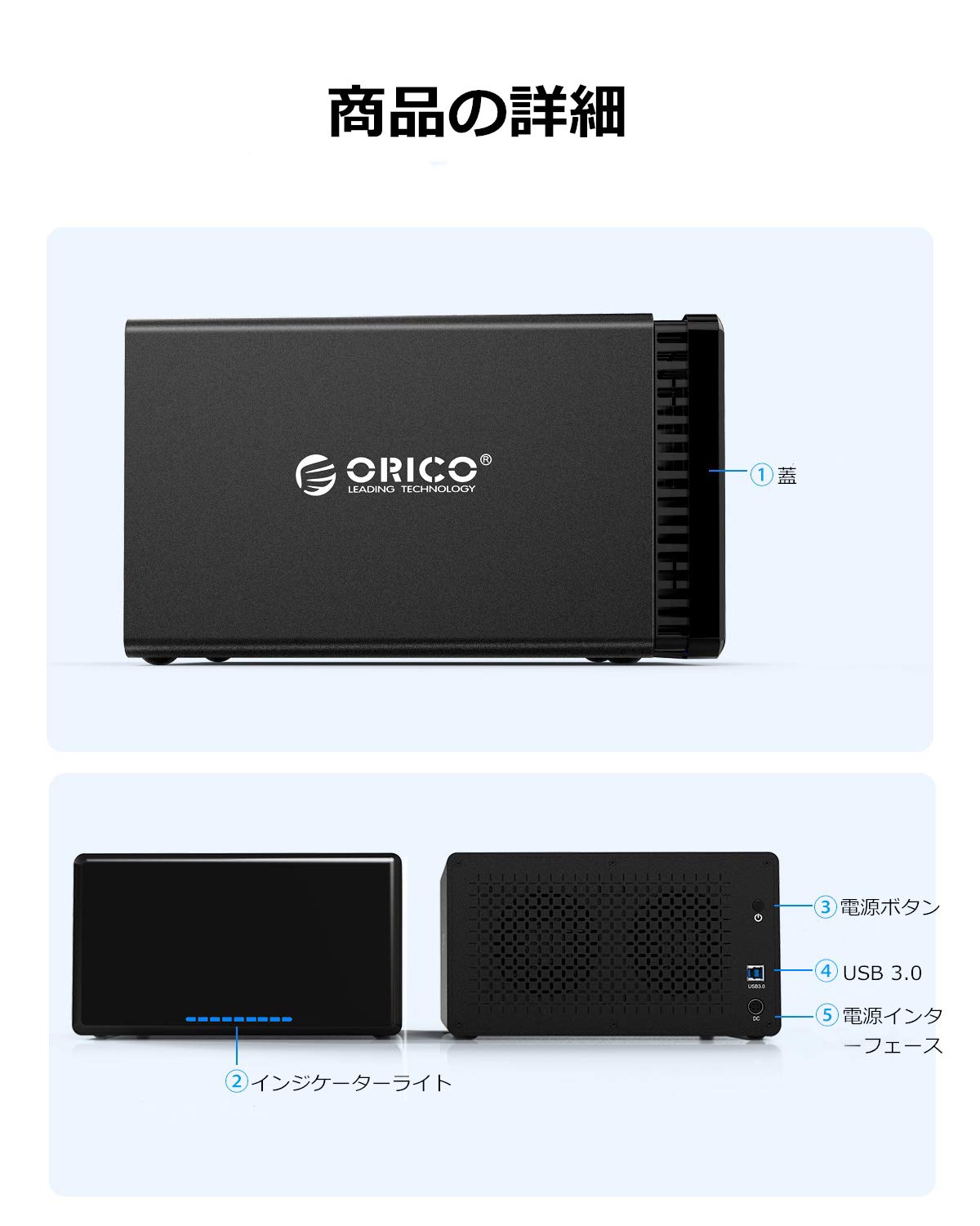 ORICO【RAID機能】HDDケース 5台 22TB*5 USB 3.0接続 8 RAIDモード 3.5インチHDD用 アルミ合金制 HDD 外付けケース プッシュプル取り付け セーフティーロック機能付き 外付けハードディスクケース 9858RU3