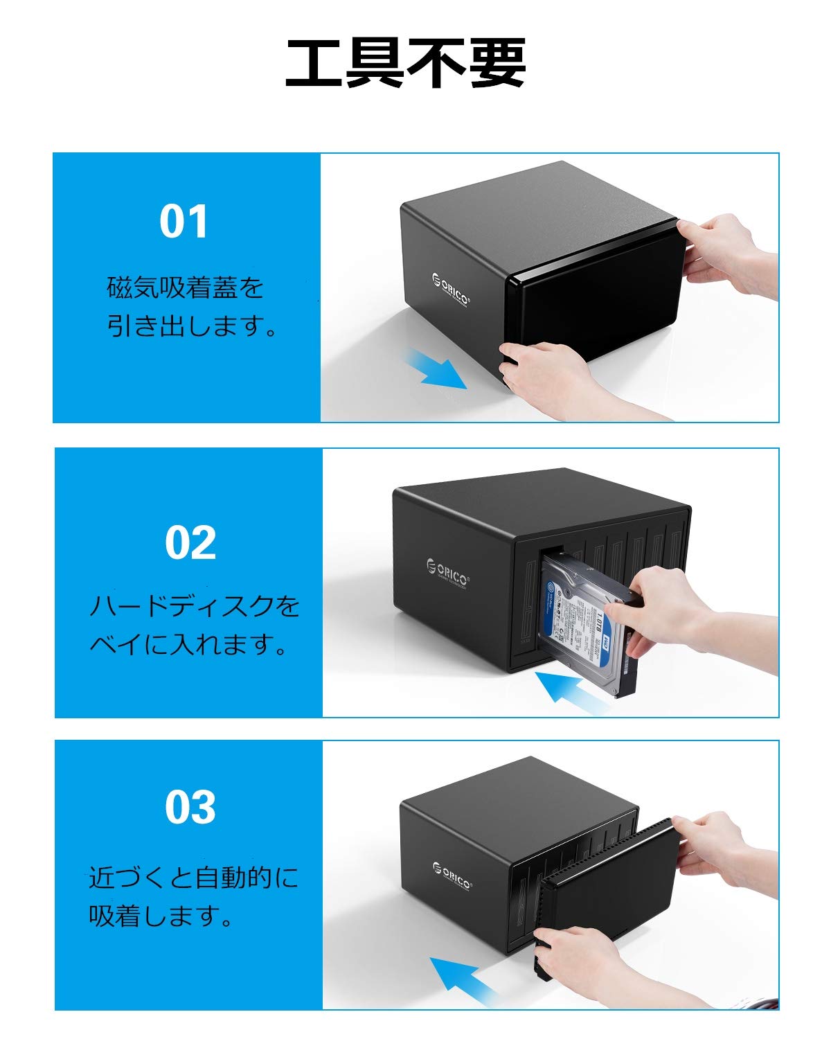 ORICO 3.5インチ HDDケース Type-C接続 ハードディスクケース 磁気吸着デザイン 18TB*5台対応 SATA3.0 5ベイ ドライブケース アダプター付 ABSプラスチック素材 工具不要 自動休眠機能 DS500C3(HDD含めず)