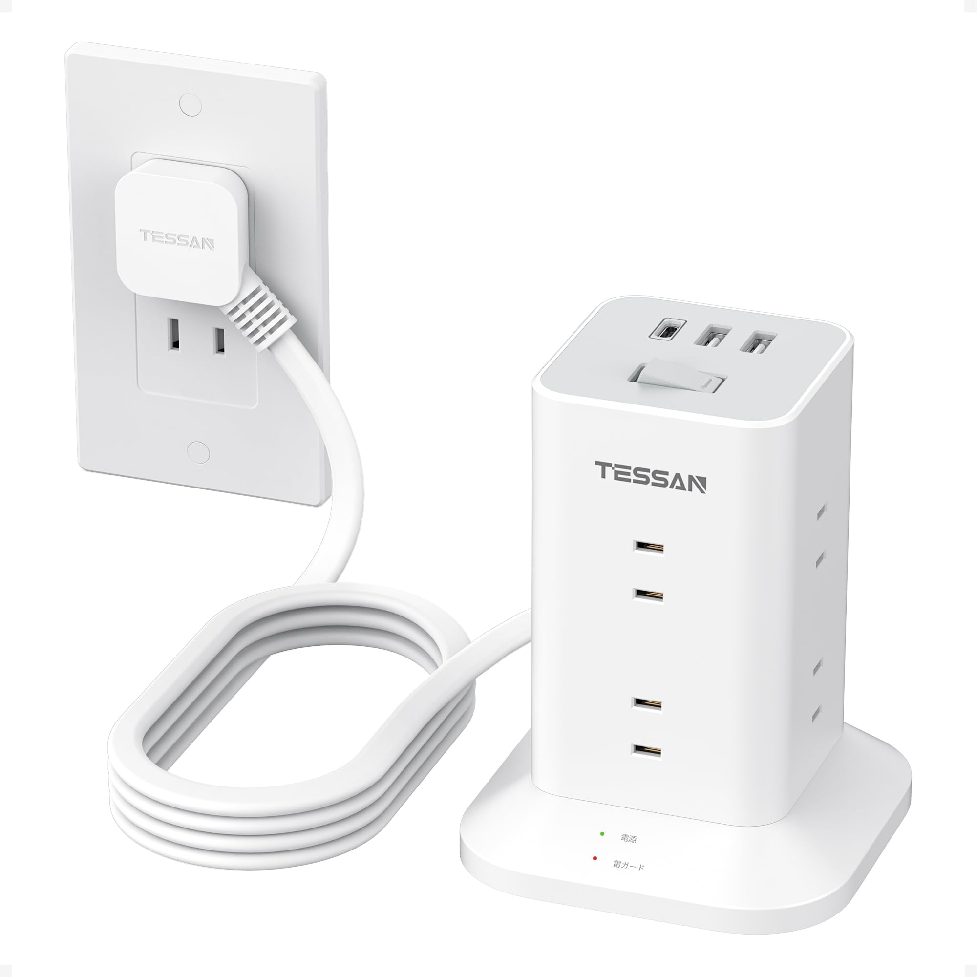 延長コード 10m 電源タップ タワー型 8個AC差込口 3個USBポート TESSAN テーブルタップ 蛸足コンセント 180°スイングプラグ 雷ガード 一括スイッチ 省エネ
