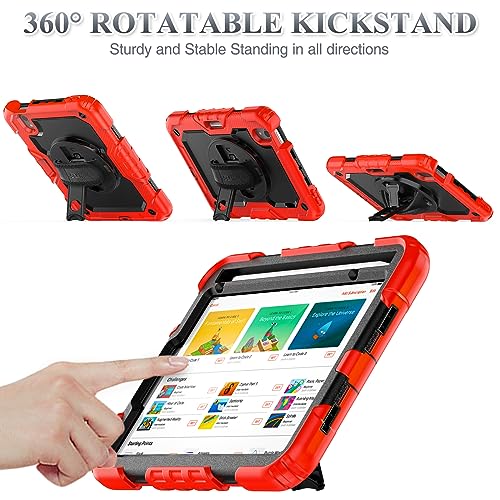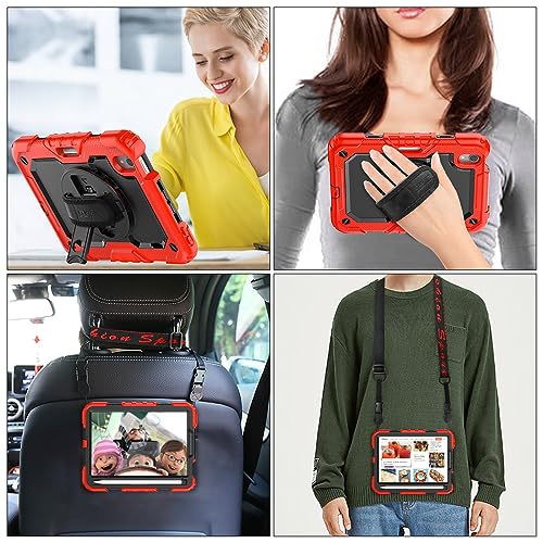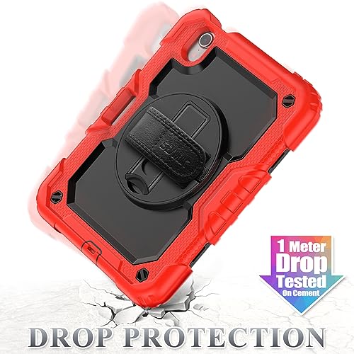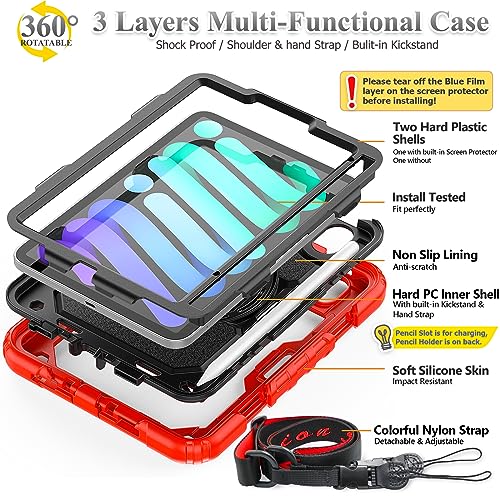 SEYMAC stock iPad mini 7/mini 6専用ケース 耐衝撃 ペンホルダー フィルム付き前面カバー 横置き縦置きスタンド 360度回転ハンドストラップ 肩掛けショルダーストラップ付きmini A17 Pro(レッド)