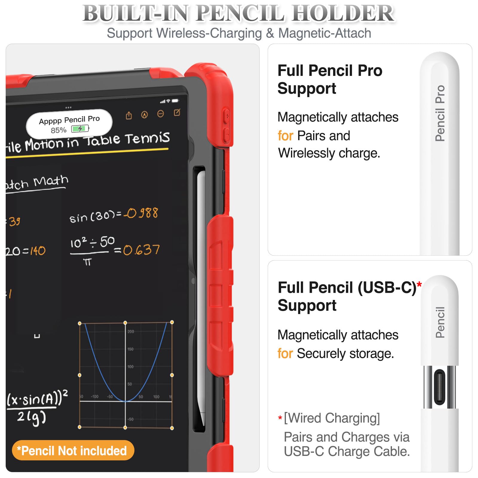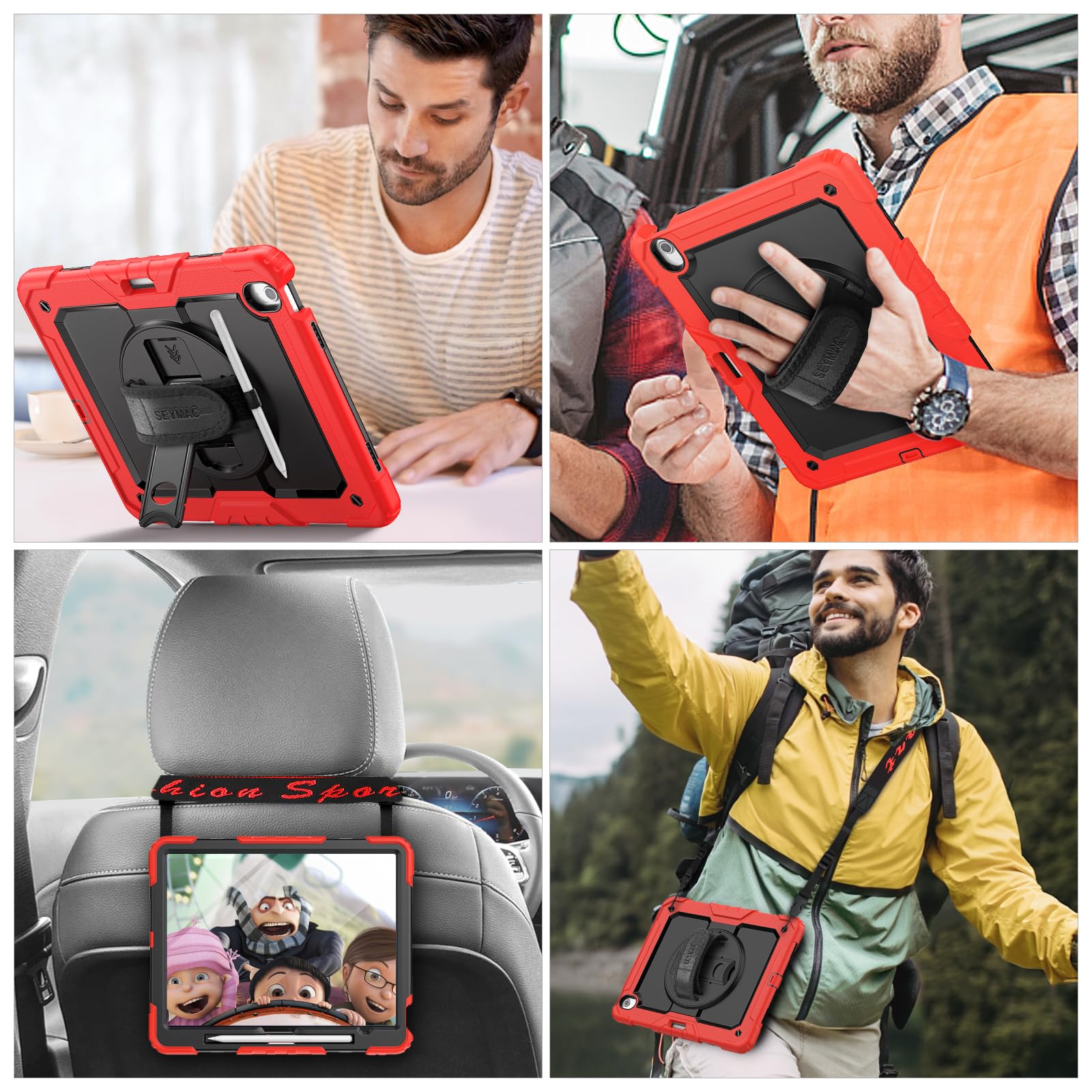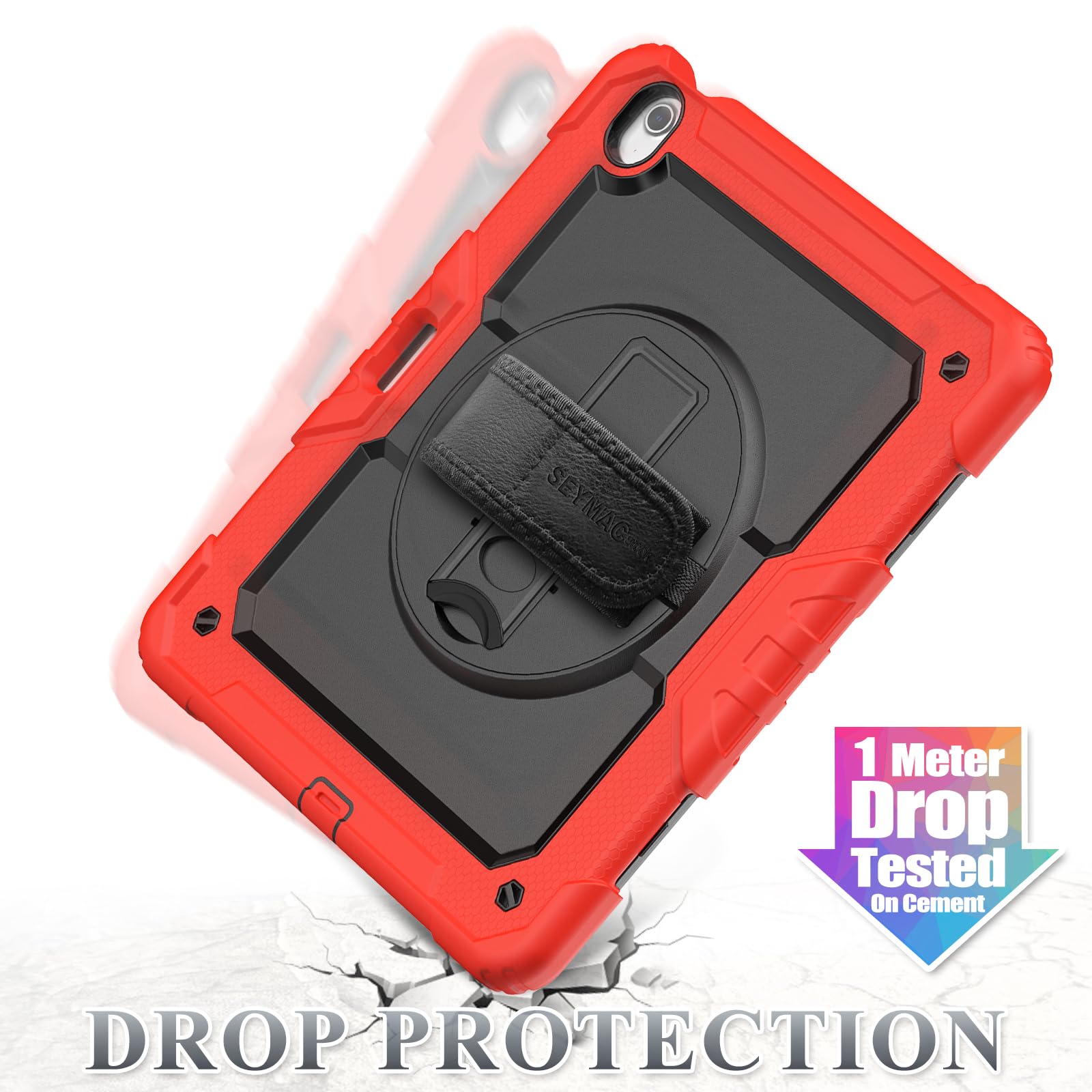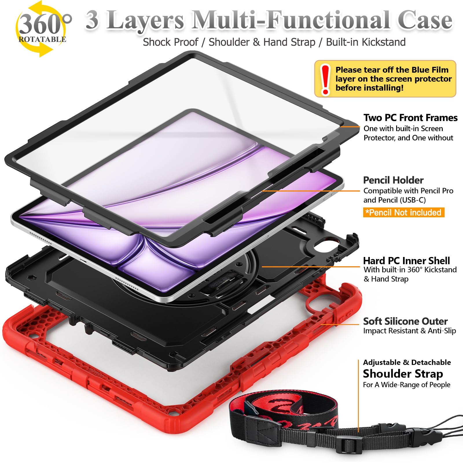 SEYMAC stock 2025年/2024年 13インチiPad Air(M3/M2)耐衝撃ケース 保護フィルム付き ペン収納 360°回転スタンド ハンドストラップ ショルダーストラップ 全面保護カバー iPad Air 13 2025/2024専用型(レッド)