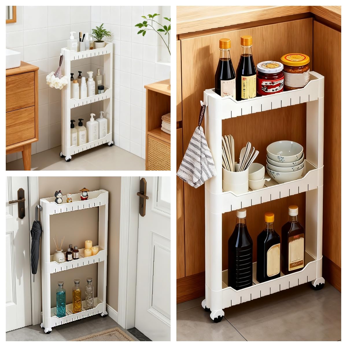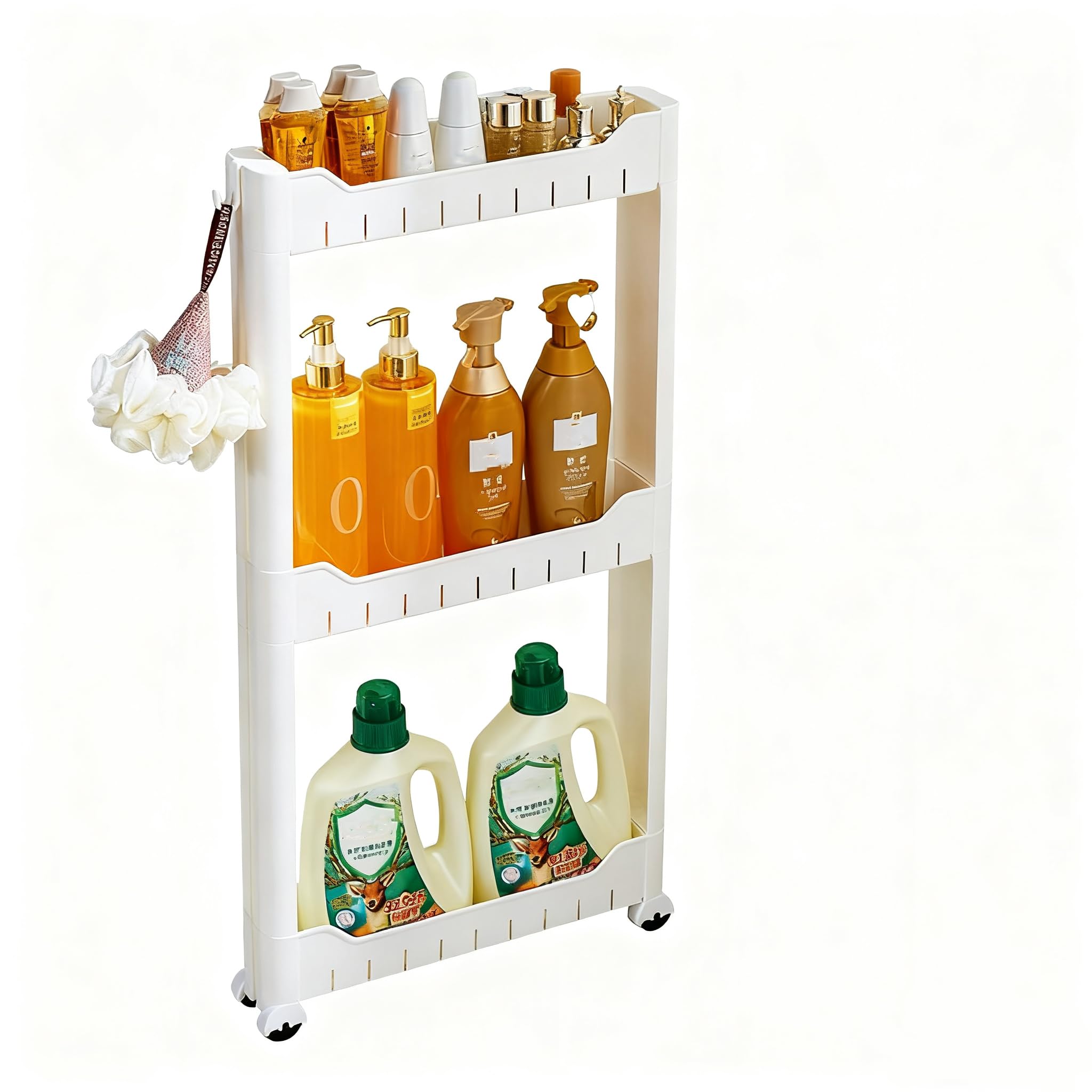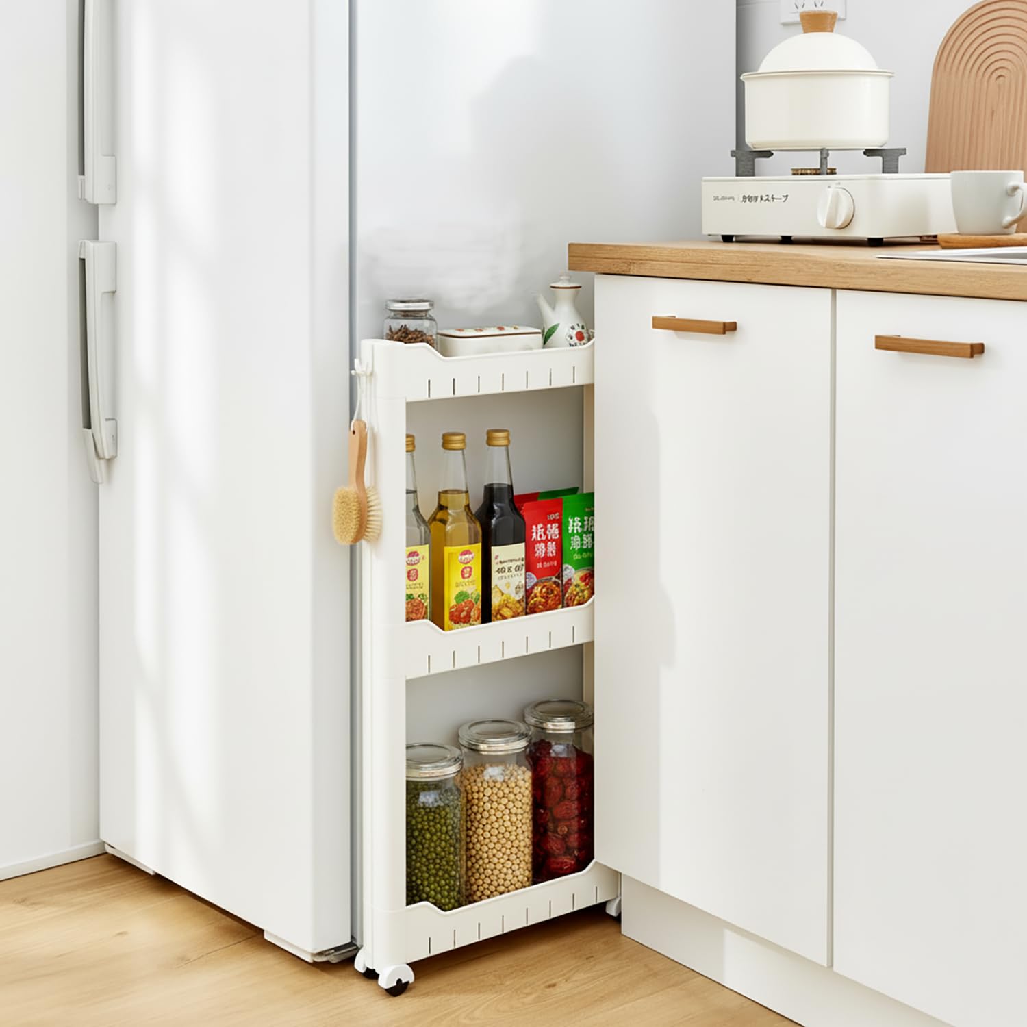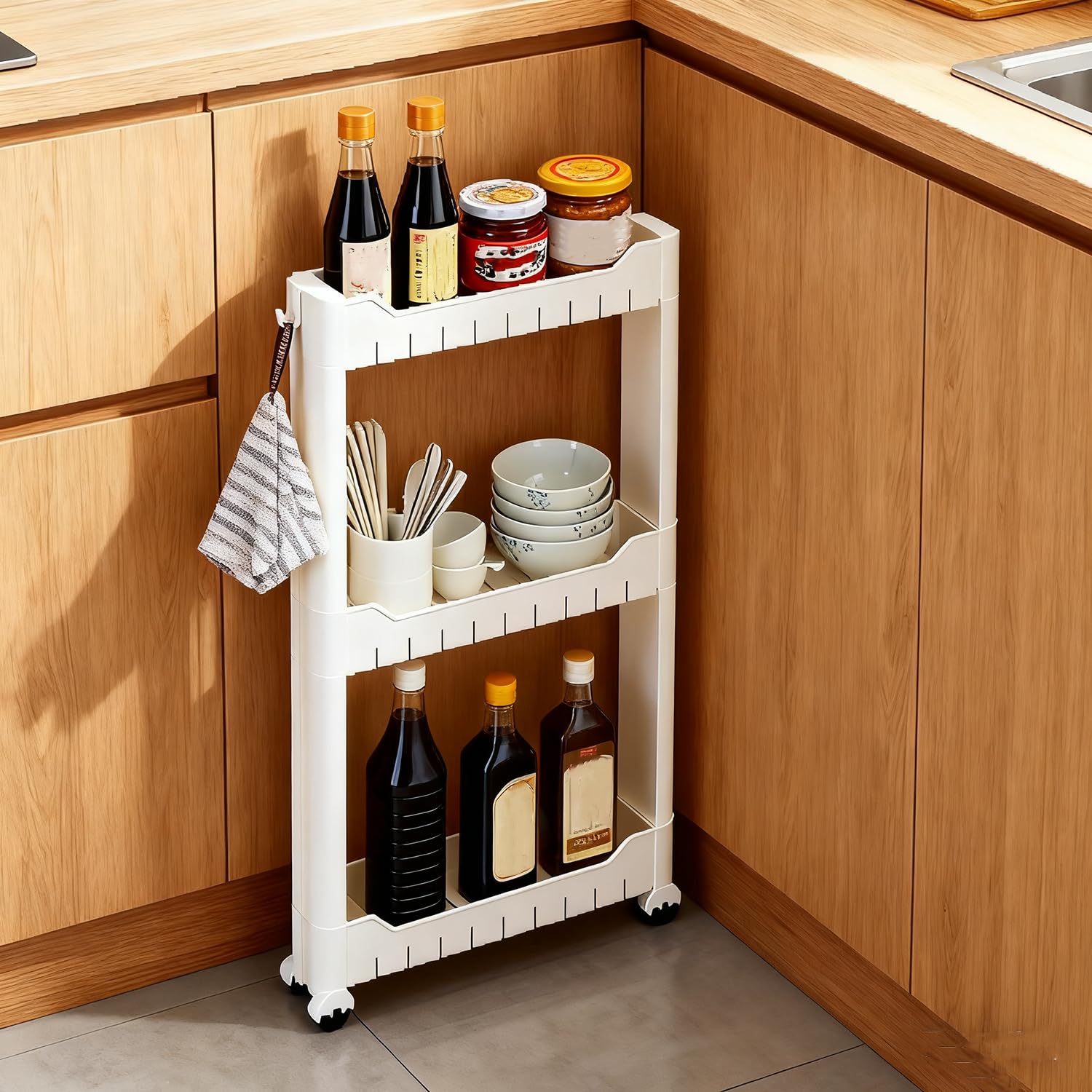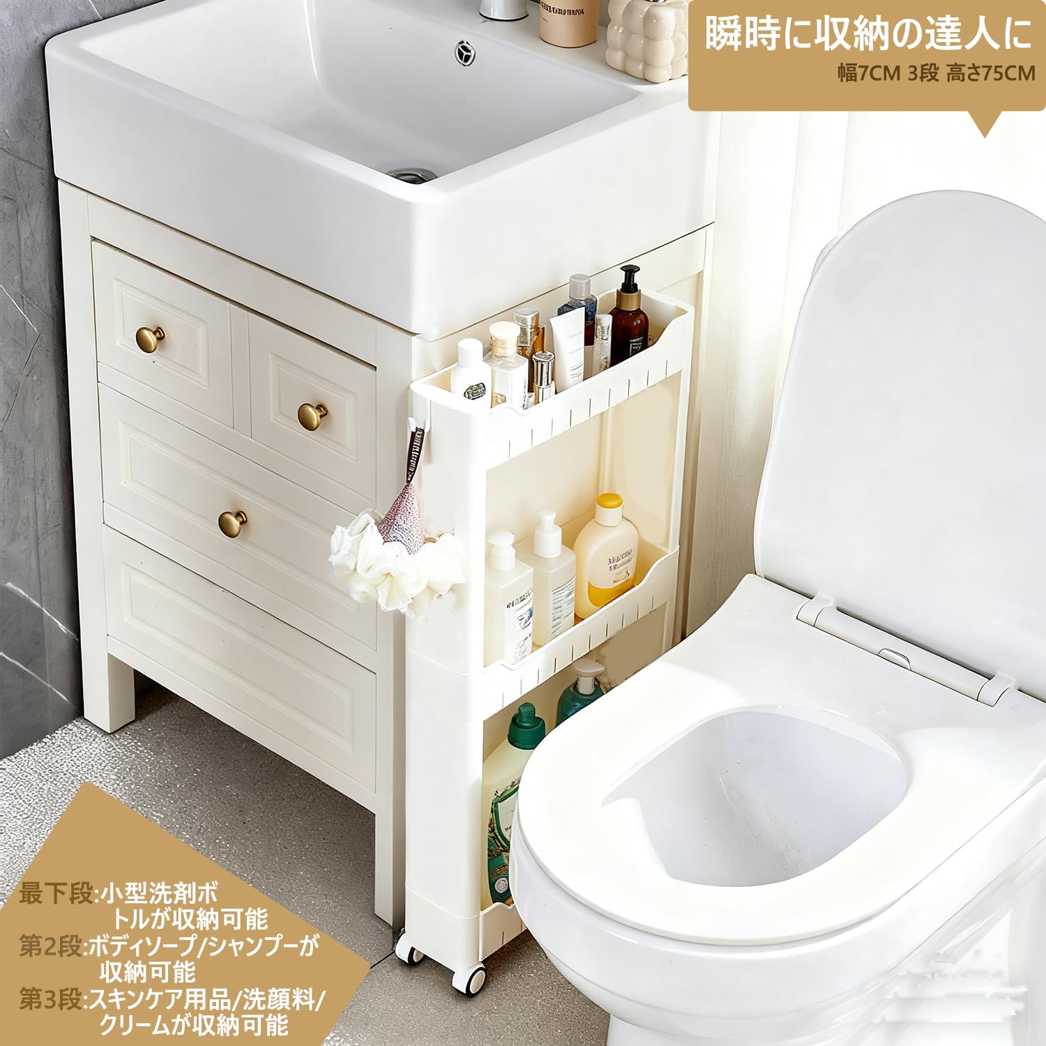 J-tanzl キッチンワゴン 隙間収納 キャスター付き 29cm ペットボトルラック 冷蔵庫横 洗面所 収納 隙間ラック 3段 スリムワゴン 細い棚 調味料棚 キッチンラック ブラック (ホワイト 3層 引き出し付き) [並行輸入品]