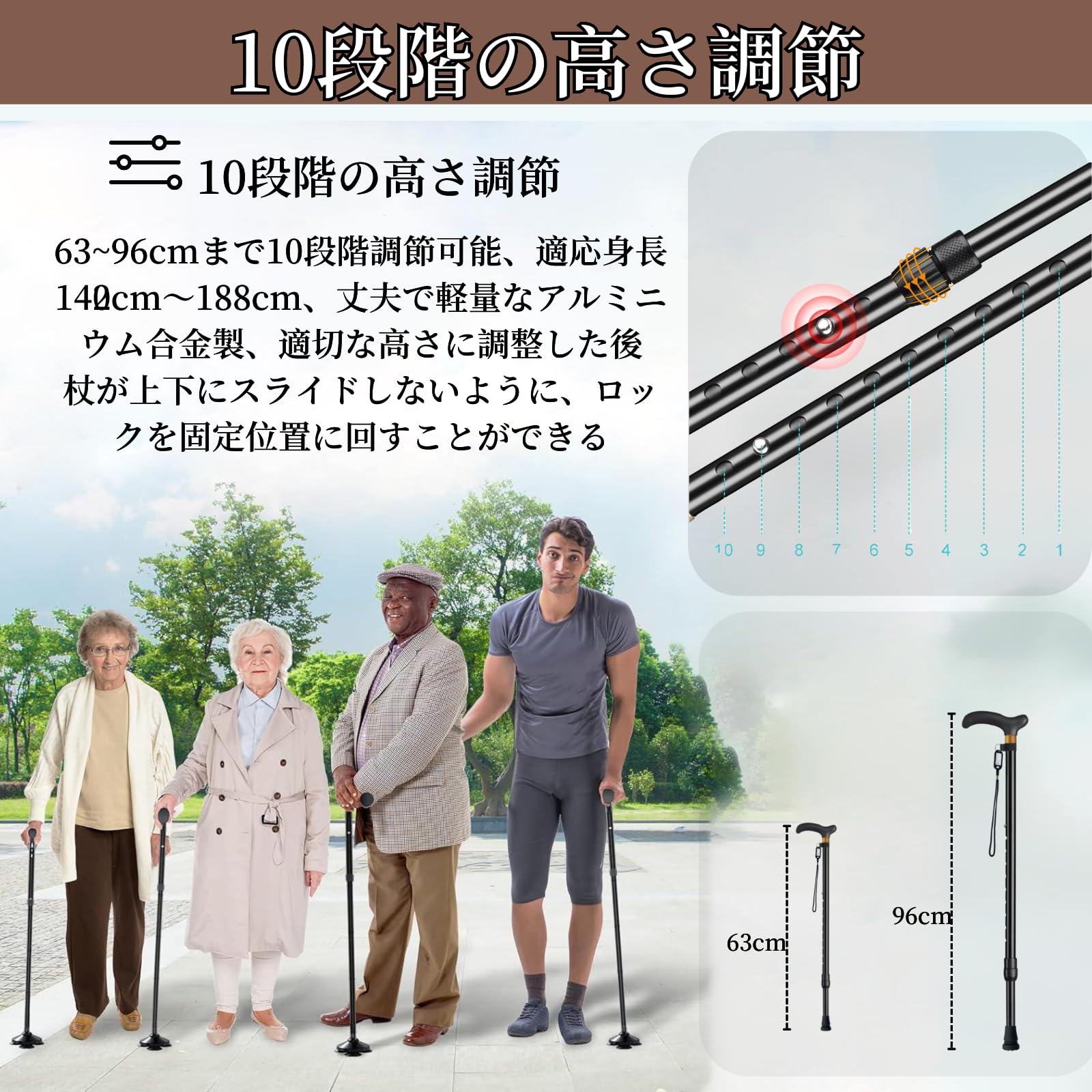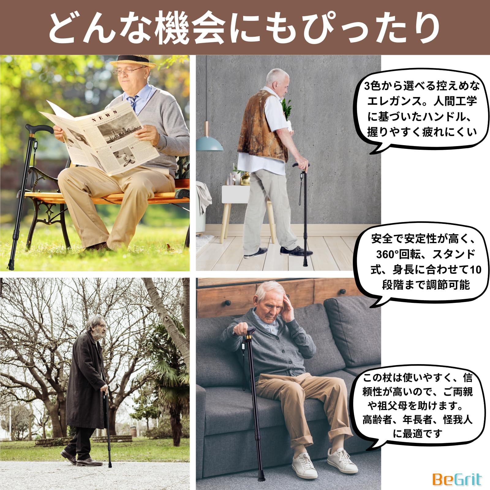 BeGrit伸縮ステッキ 杖 一本杖 自立式 介護杖 軽量 多機能ステッキつえ 杖 男性用と女性用 アルミ 歩行補助杖 ステッキ 杖 10段階調節 身長130~175cmが似合います 敬老の日プレゼント