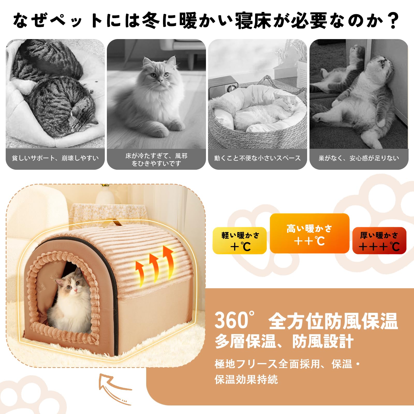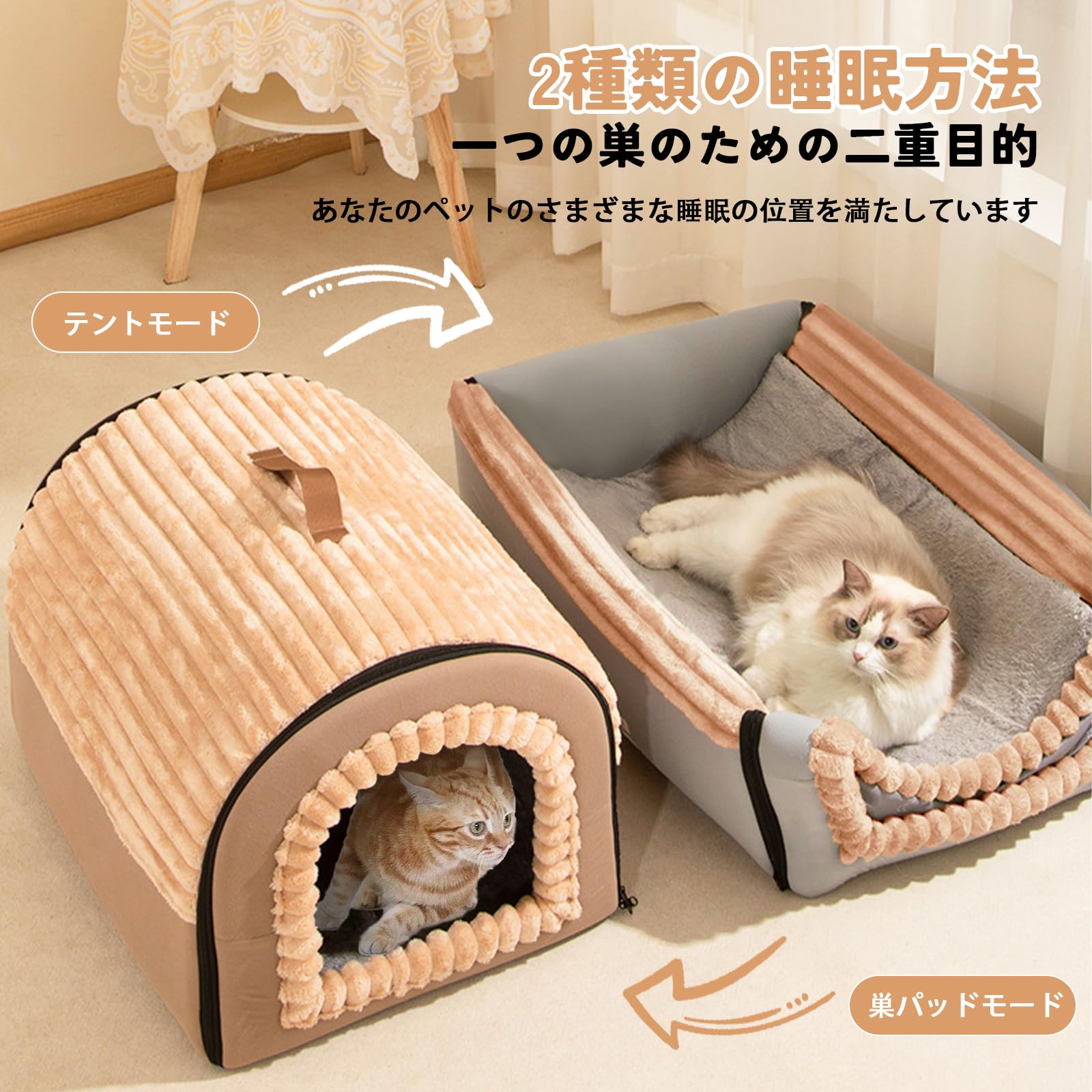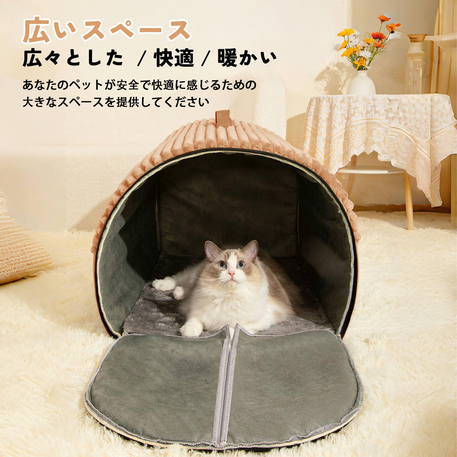 【ふわふわの手触り・ SGS取得品】猫ハウス 猫ベッド ペットベッド 寝袋 キャットハウス ドーム型 折りたたみ式寝マット 猫犬小動物用 室内用 保温防寒 冬寒さ対策 おしゃれ 立体サポート 暖かいぐっすり眠れる休憩所 9kg以内対応 (キャメル, L)