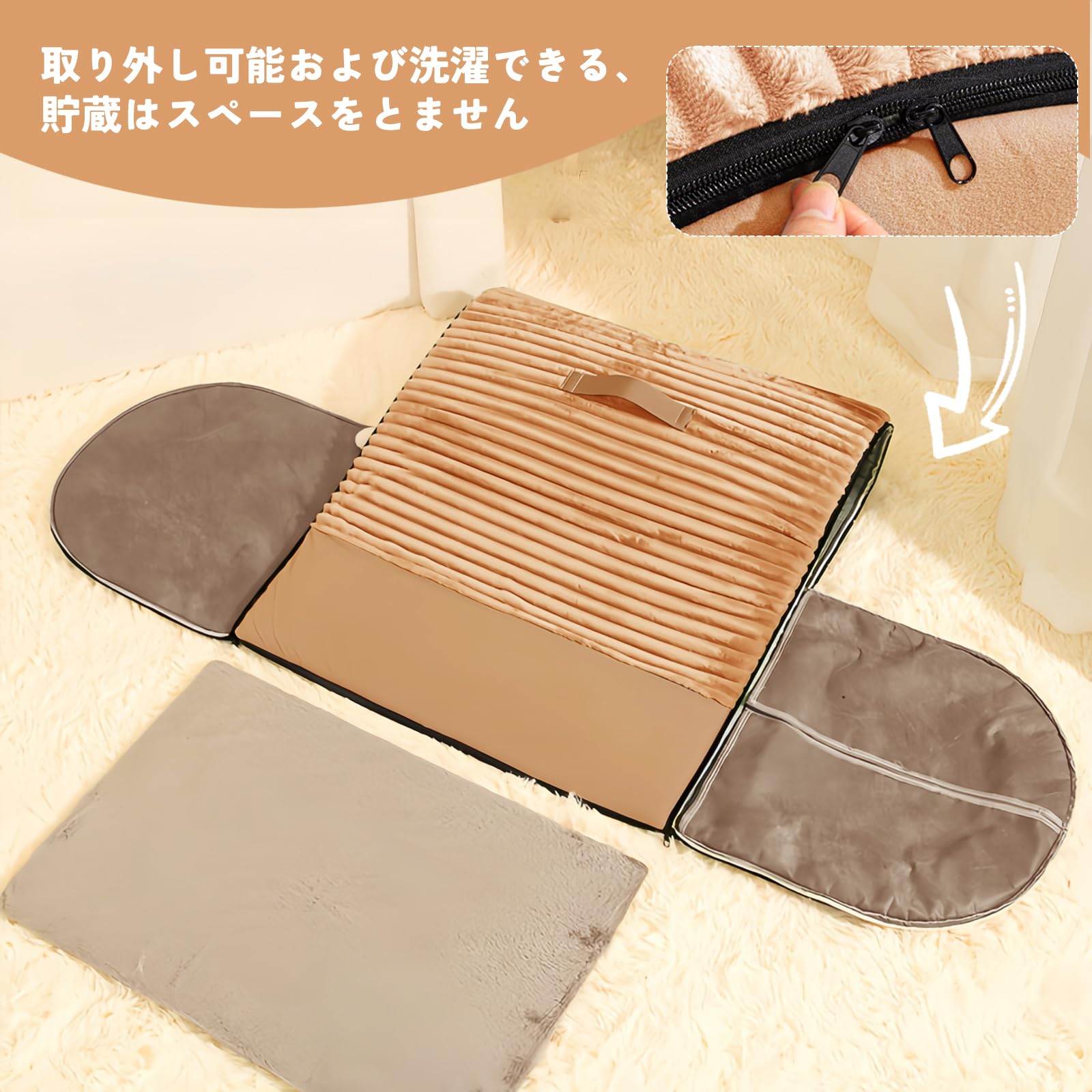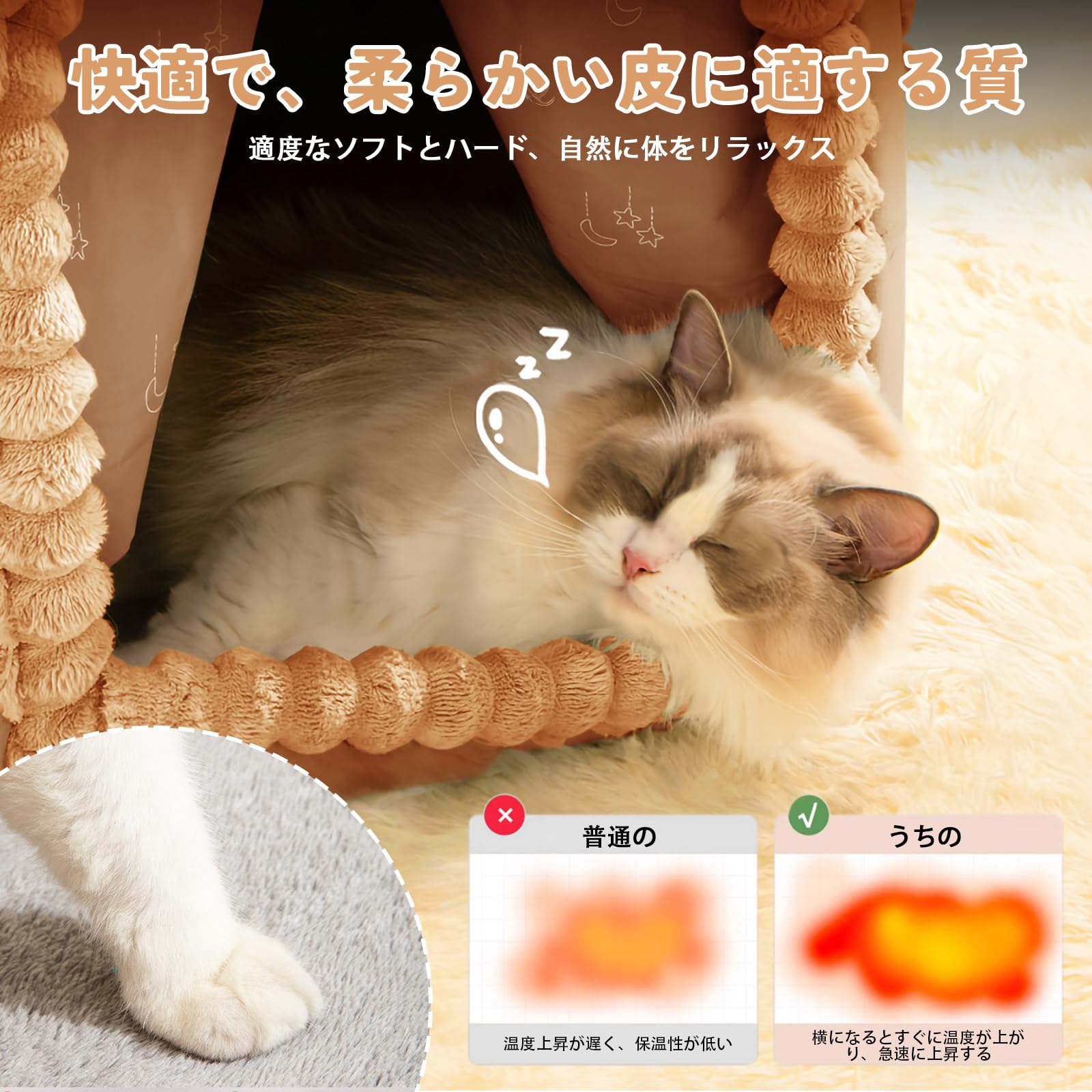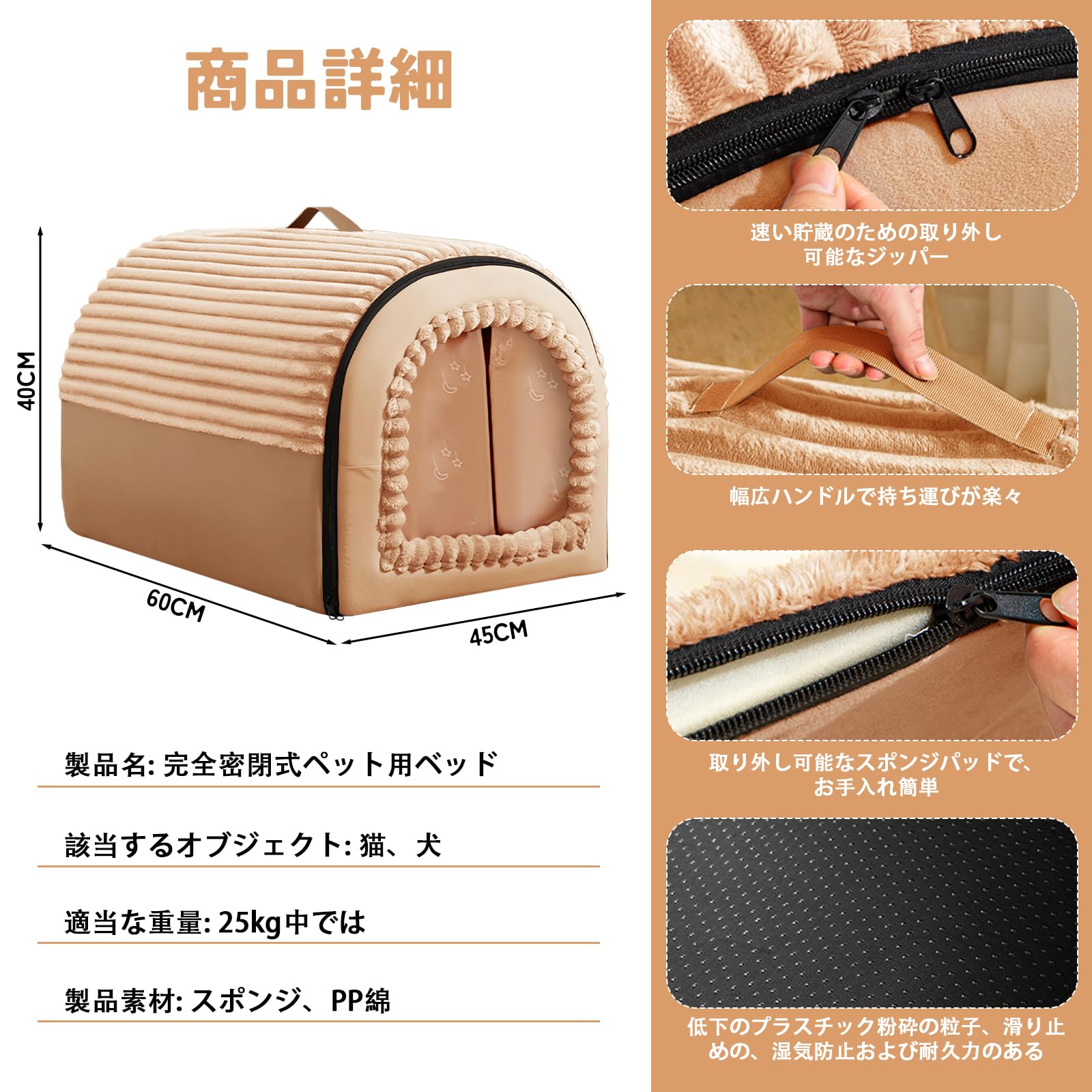 【ふわふわの手触り・ SGS取得品】猫ハウス 猫ベッド ペットベッド 寝袋 キャットハウス ドーム型 折りたたみ式寝マット 猫犬小動物用 室内用 保温防寒 冬寒さ対策 おしゃれ 立体サポート 暖かいぐっすり眠れる休憩所 9kg以内対応 (キャメル, L)