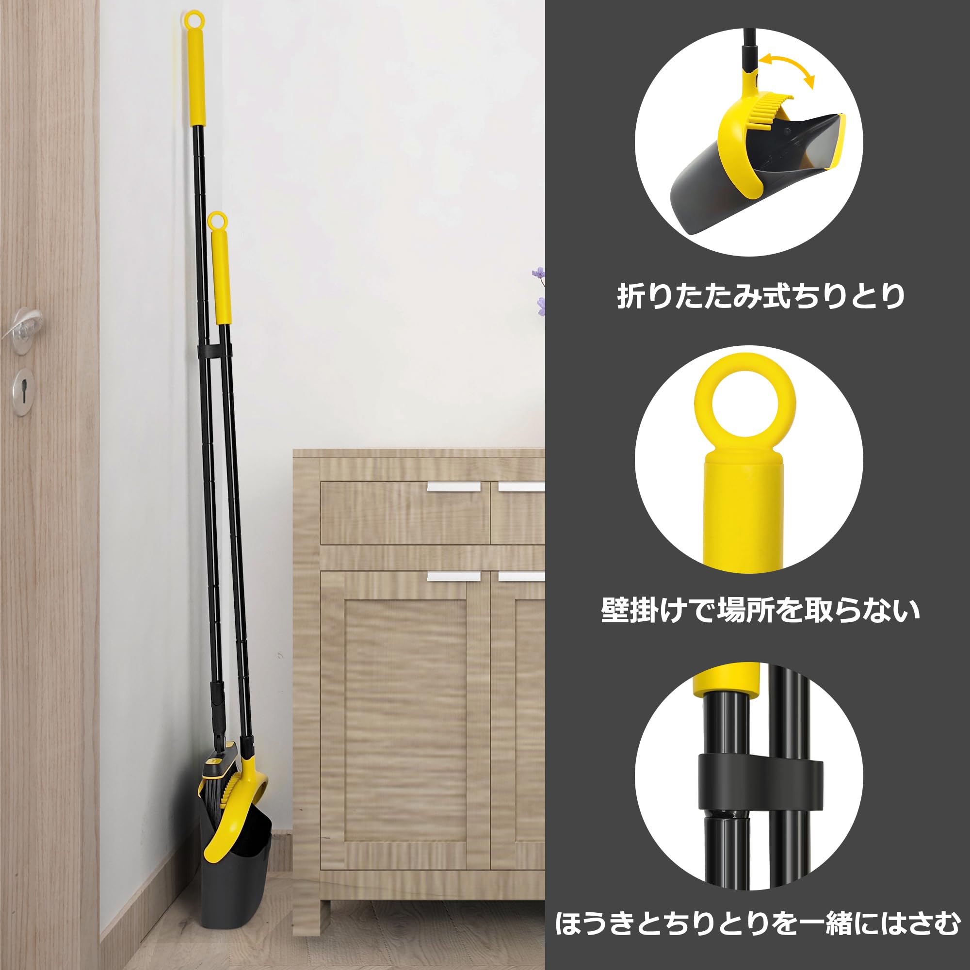 JEHONNほうき ちりとり セット室内 屋外, 138cmロングハンドルホウキ ちりとり セット軽量180度回転自立掃除道具, 防風塵取り室内玄関ホーム庭園ショッガーデニング(黒と黄色い)