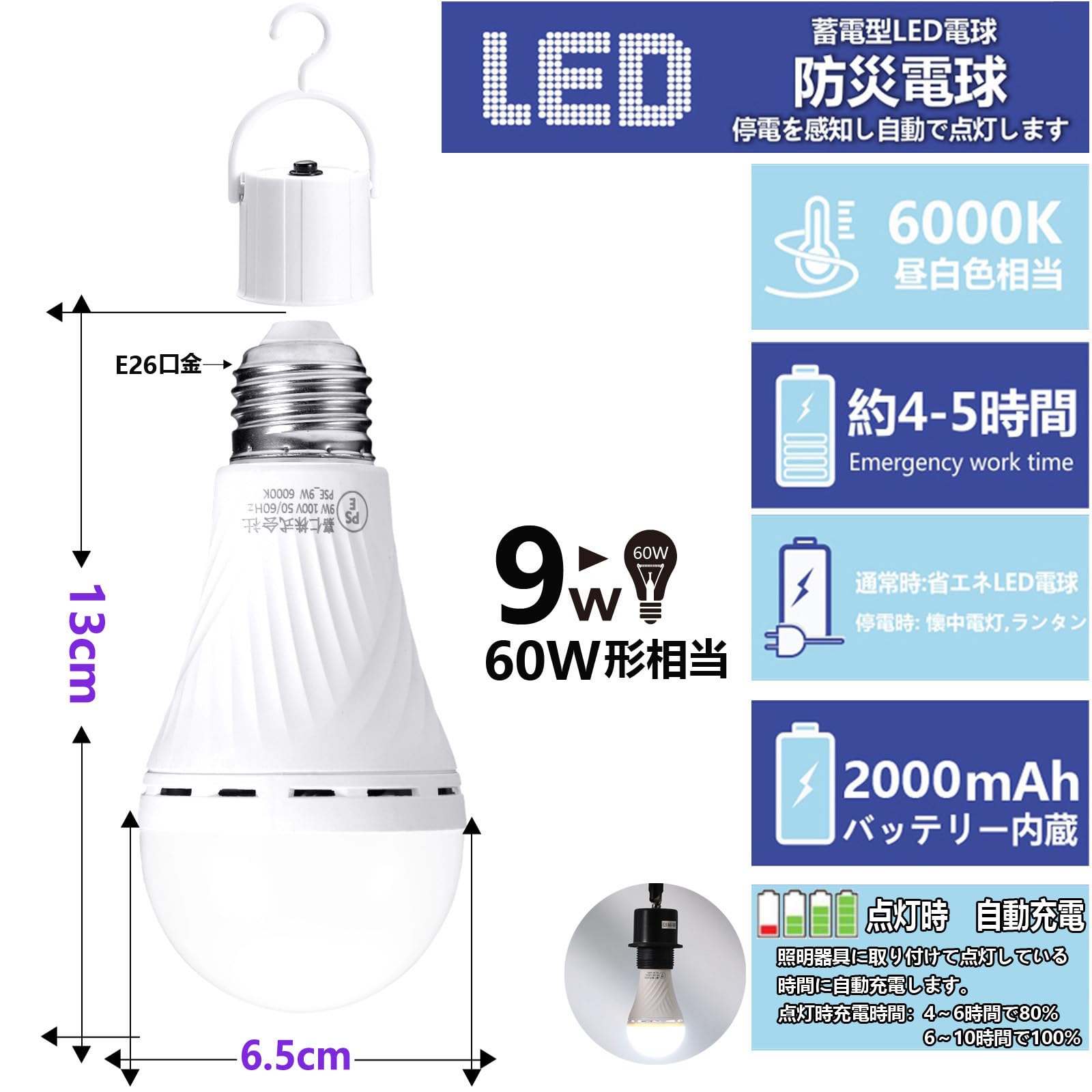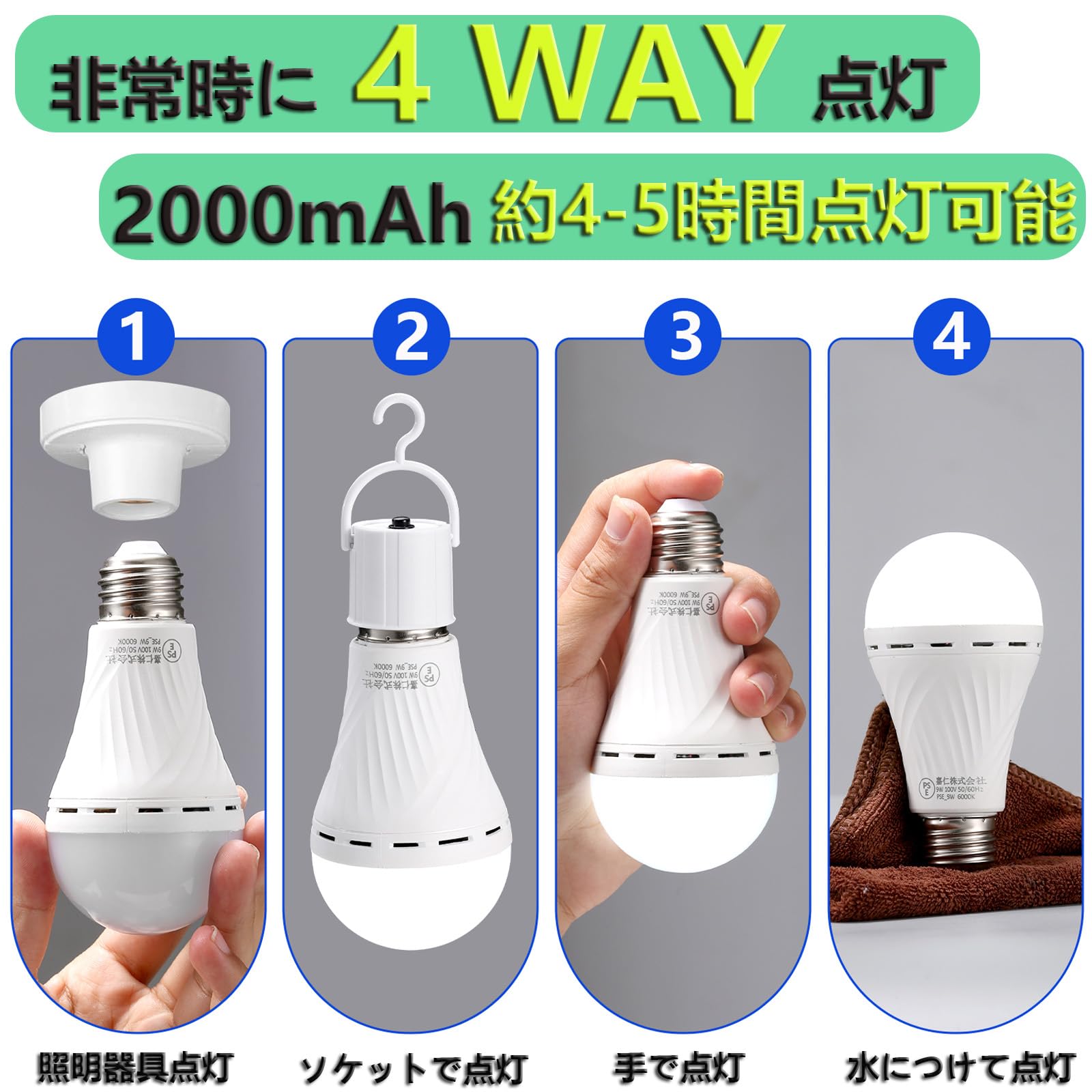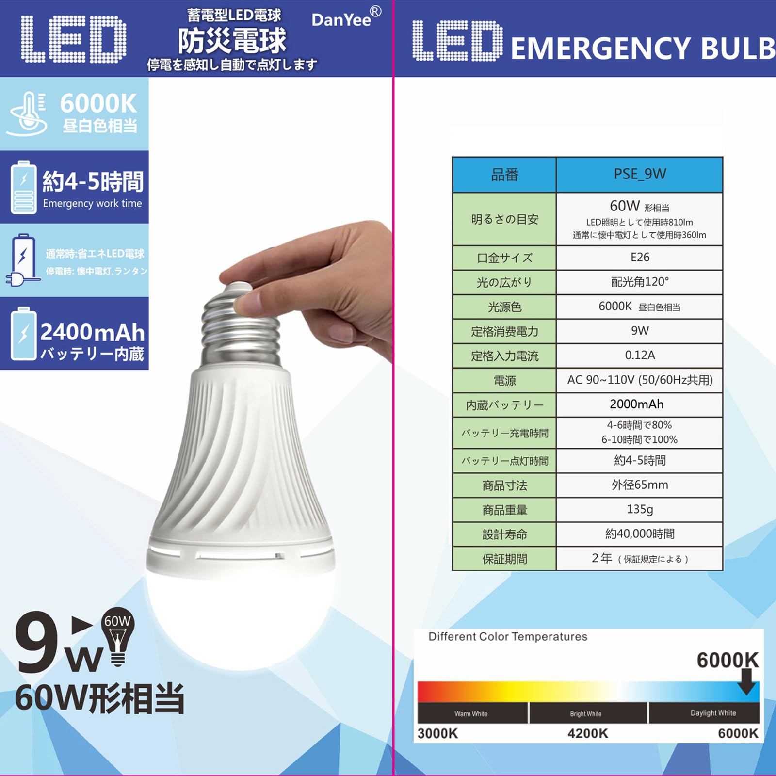 DanYee 防災電球 LED電球 停電時自動点灯ライト E26 60W 相当 2000mAhバッテリー内蔵 810lm 昼白色 蓄電型LED電球 バッテリー 停電感知センサー内蔵 懐中電灯 LED 充電式 ランタン 小型 防災 地震対策 停電対策 (昼白色【4個】)