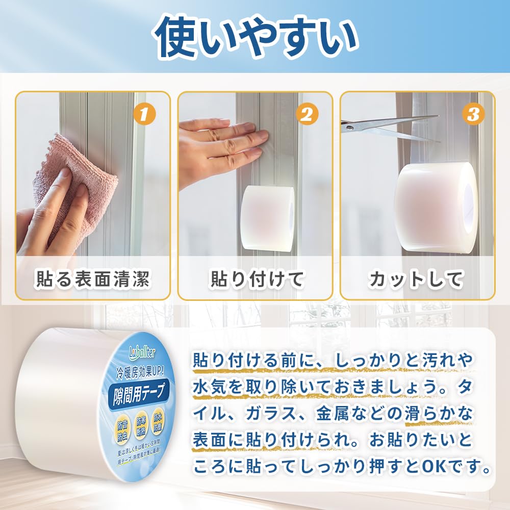 Luballter 隙間テープ 窓 防寒 隙間風防止テープ 長さ25m(幅5cm) 貼るだけ きれいにはがせる 夏涼しく 冬暖かく 窓 断熱 冷気遮断 結露抑制 窓隙間テープ 防水 防風 防音 防虫 多用途 網戸 ドア 玄関 サッシ 台所テープ 透明