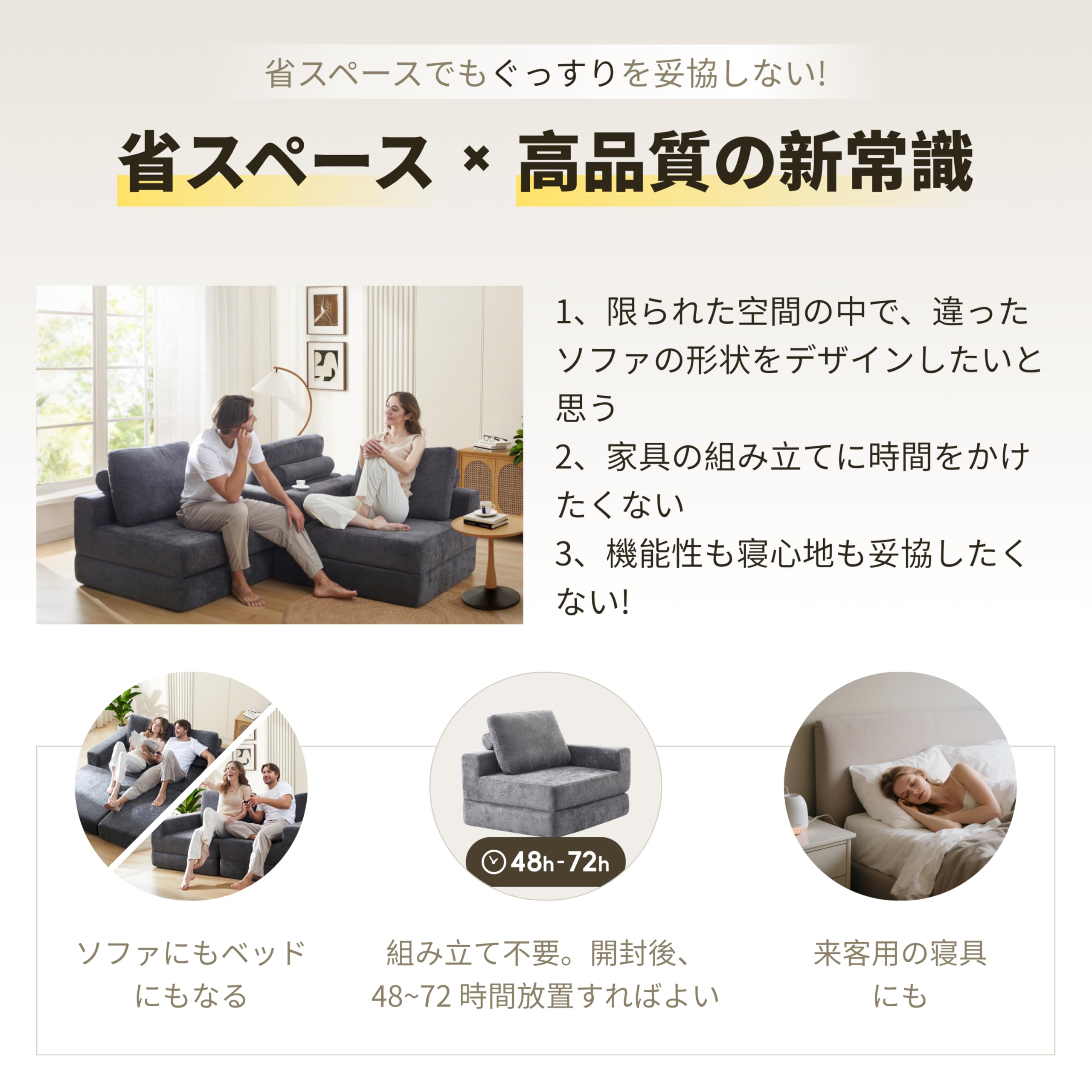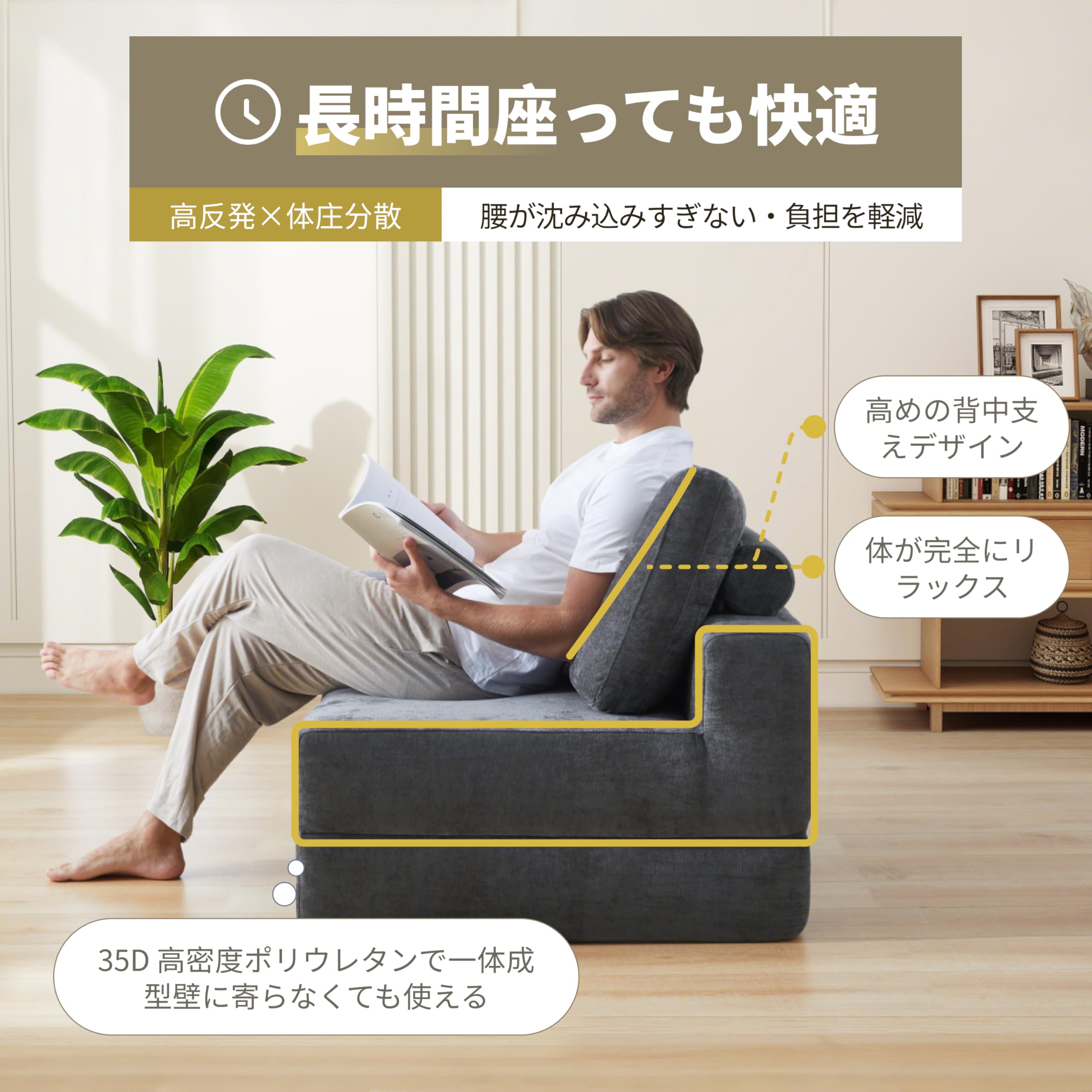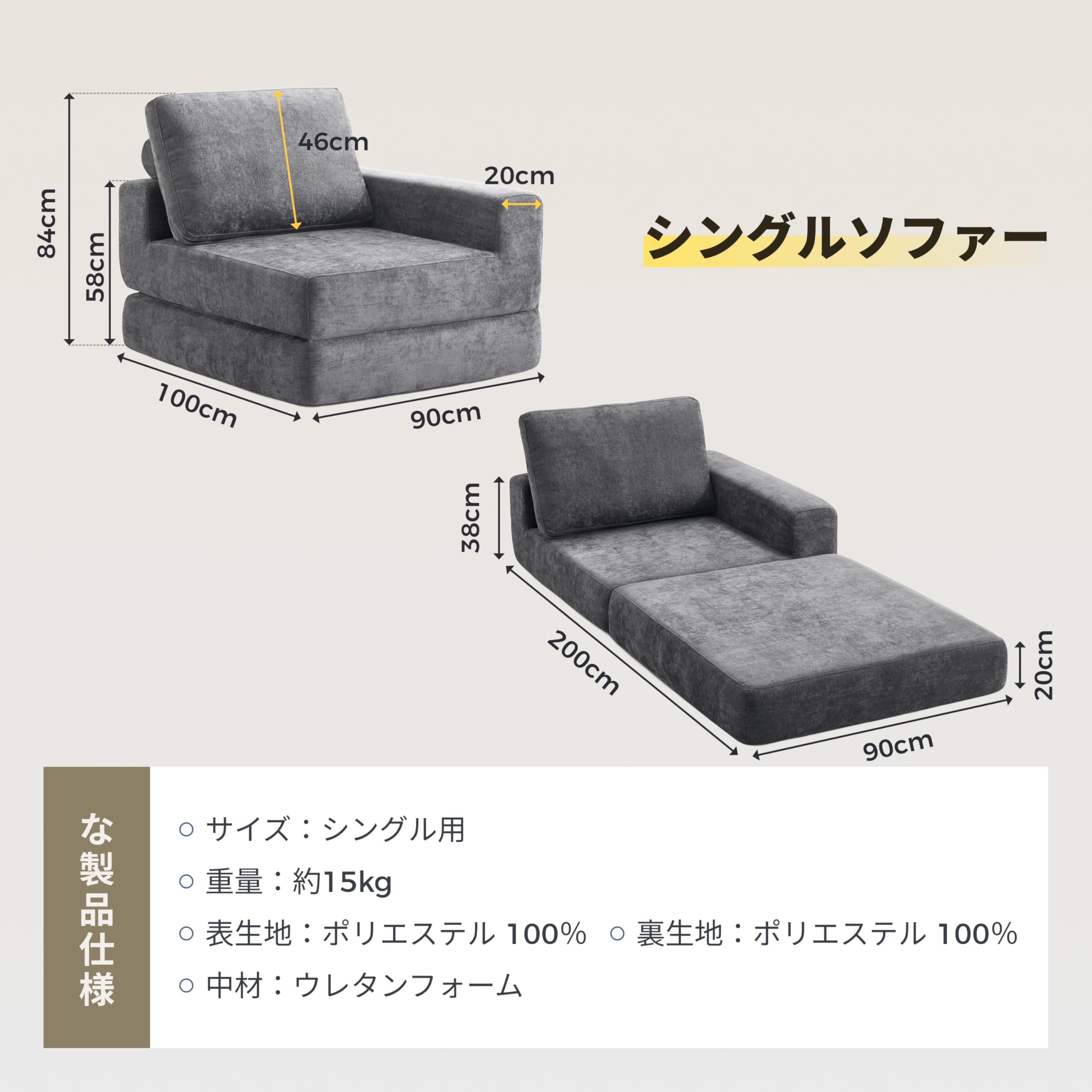 折りたたみ式ソファベッド 一人用 コンパクトソファ ハイバックデザイン 組み立て不要 高反発ウレタン簡単収納 おしゃれ 一人暮らし 来客用 組み合わせ可能 (1, アームレス)