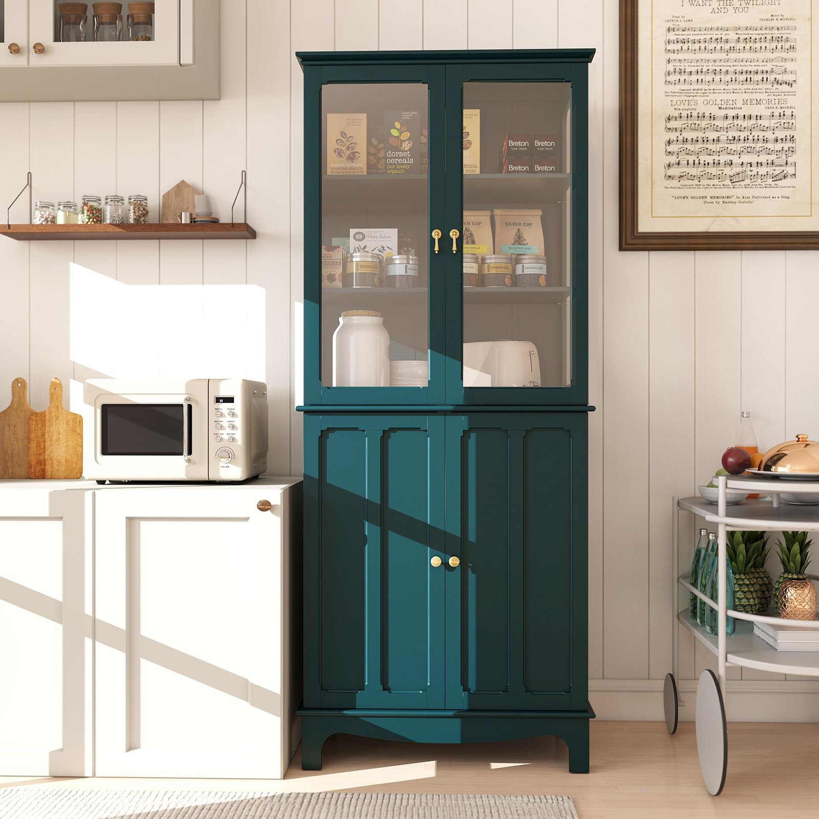 HOLTICO(ホルティコ) 食器棚 キッチンボード ガラスディスプレイ棚 可動棚 幅76×奥行40×高さ183cm 収納 木製 (グリーン)