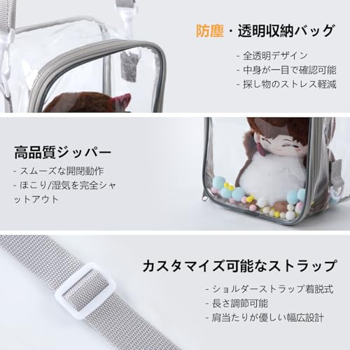 痛バッグ ぬいポーチ 10cm/15cm/20cmサイズ対応 推し活ぬいポーチ 人形の保管場所 全透明 PVCケース 防水・防塵 ジッパー式 ポンポンボール&キーホルダー付 (10cm対応)