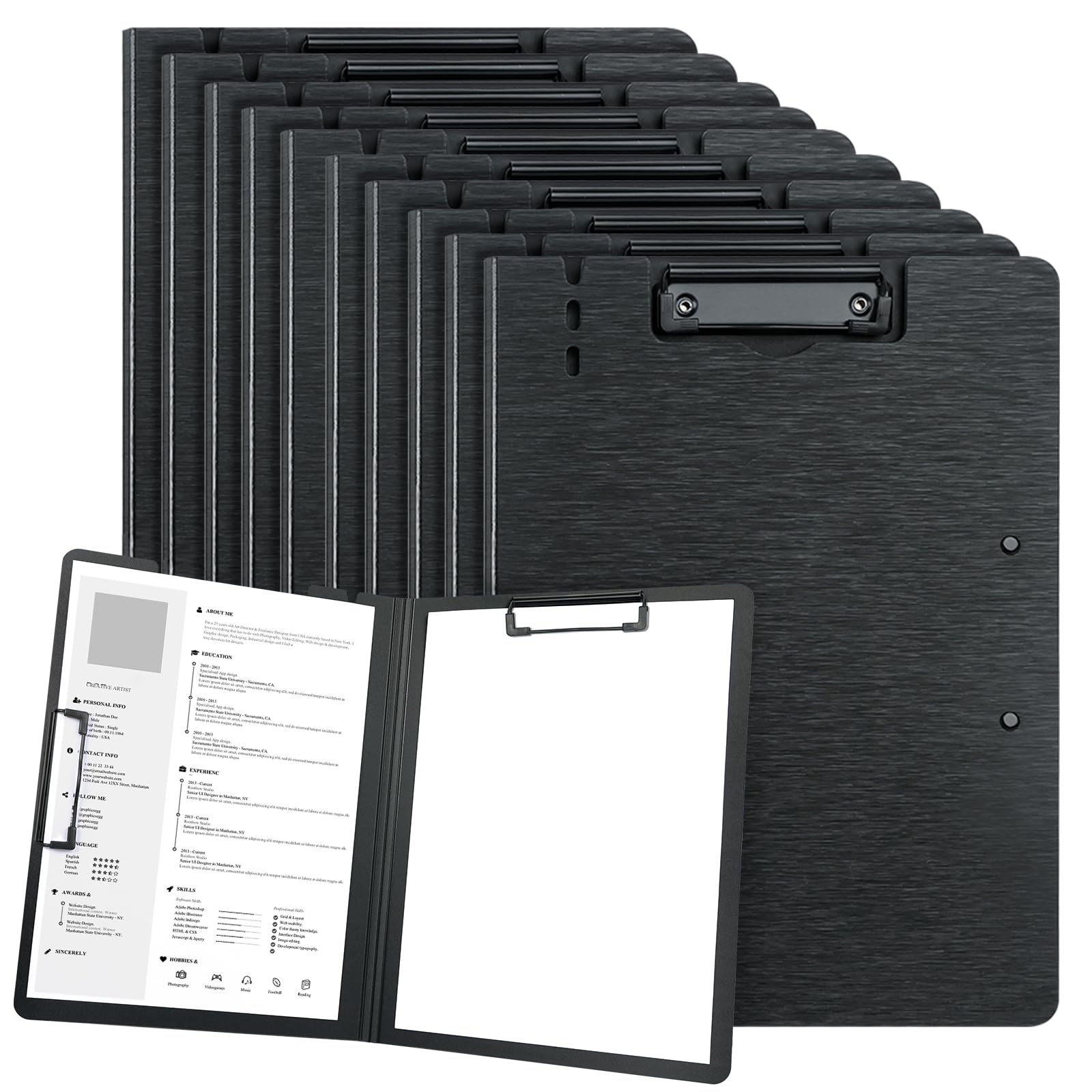 JIDHUHI A4 二つ折 クリップボードフォルダ 10個セット ダブルクリップ 防水・軽量・薄型 書きやすい 会議・ティーチング用 書類整理 ブラック (ダブル固定式クリップ, 10個セット)
