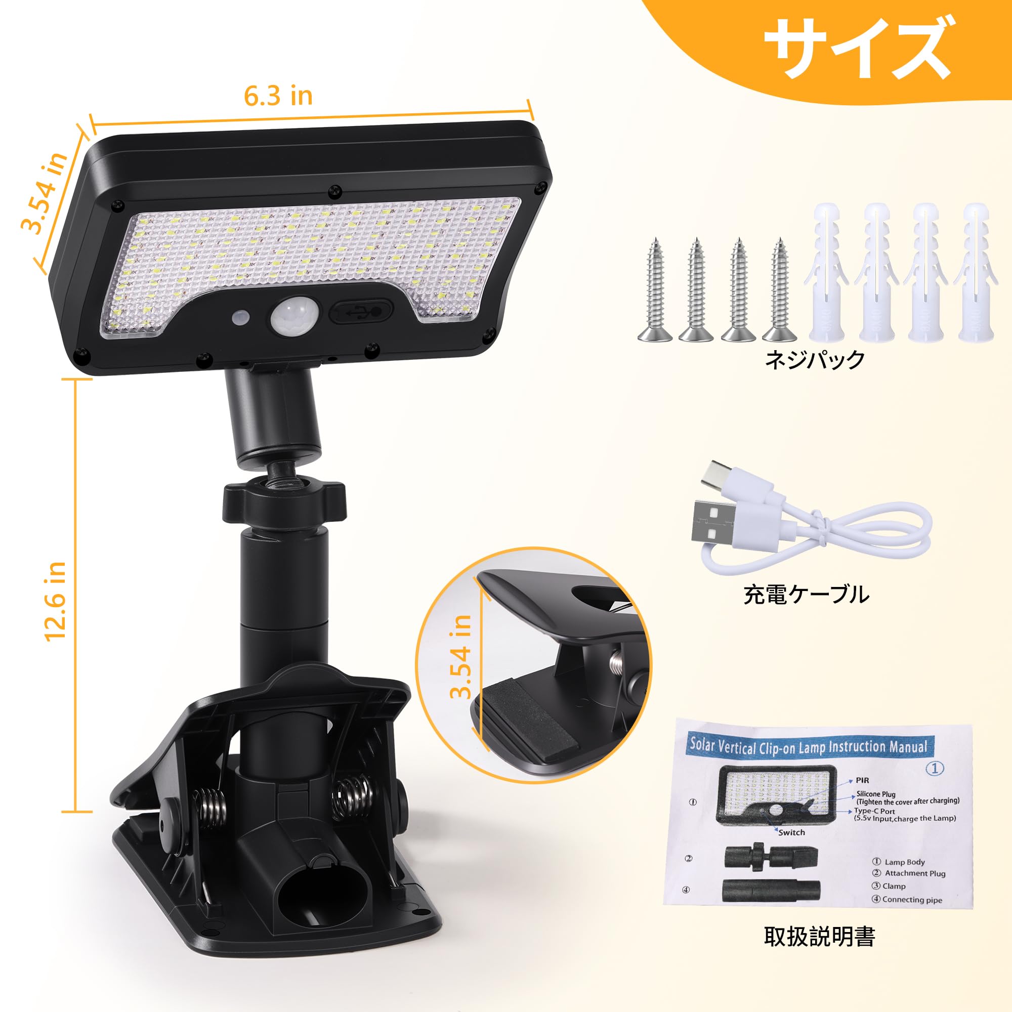 ソーラーライト 屋外 センサーライト 屋外 92LED IP65防水 クリップ式ソーラーライト 360度調整ランプ 1800mAh USB充電 太陽光充電 明暗/人感センサーライト 800ルーメン超高輝度 玄関/駐車場/庭/フェンス/キャンプ用(2個セット 電球色 )