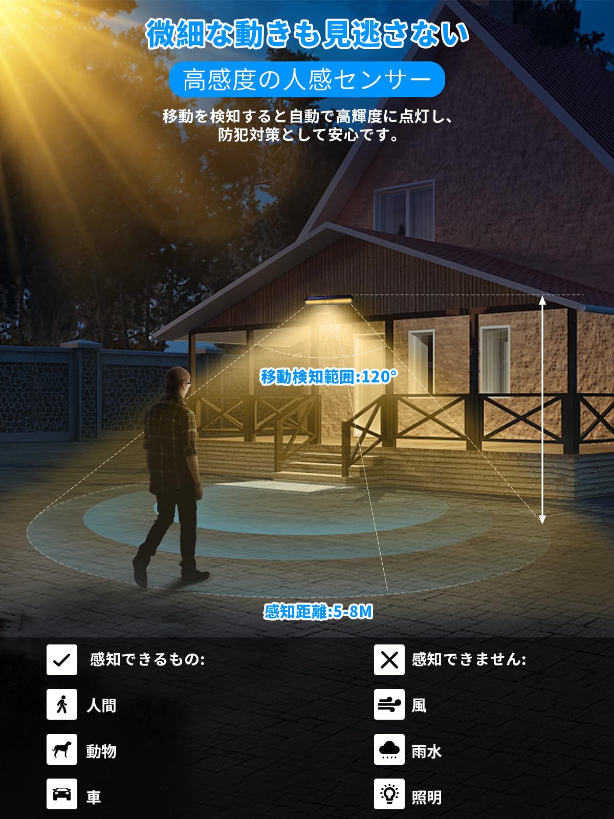 IKAR ソーラーライト 屋外 人感センサー 防水 自動点灯 【333LED 4面発光 分離型】 センサーライト 3つ知能モード 360°角度調整可能 2400mAh大容量電池 超高輝度 防犯 自動点灯/消灯 ガーデン/壁掛け/庭先/表玄関/駐車場/停電時適用 地震 津波 台風 防災対応