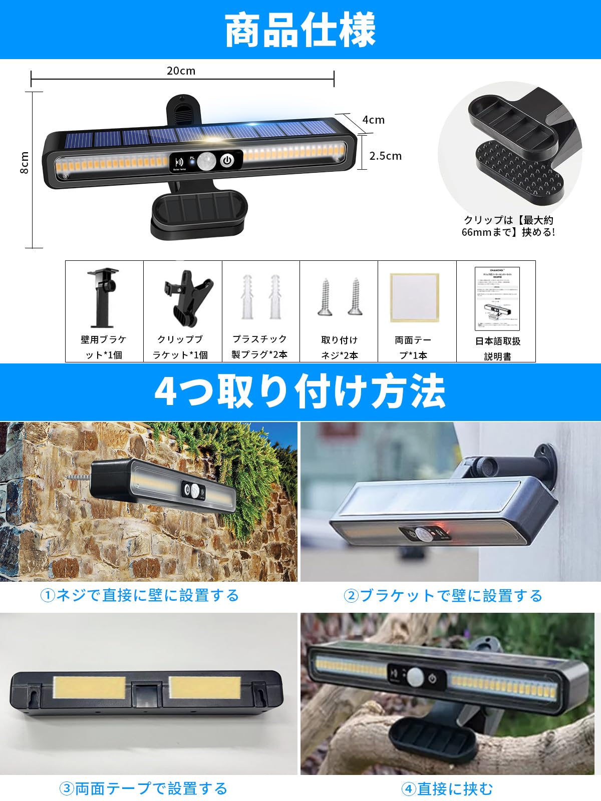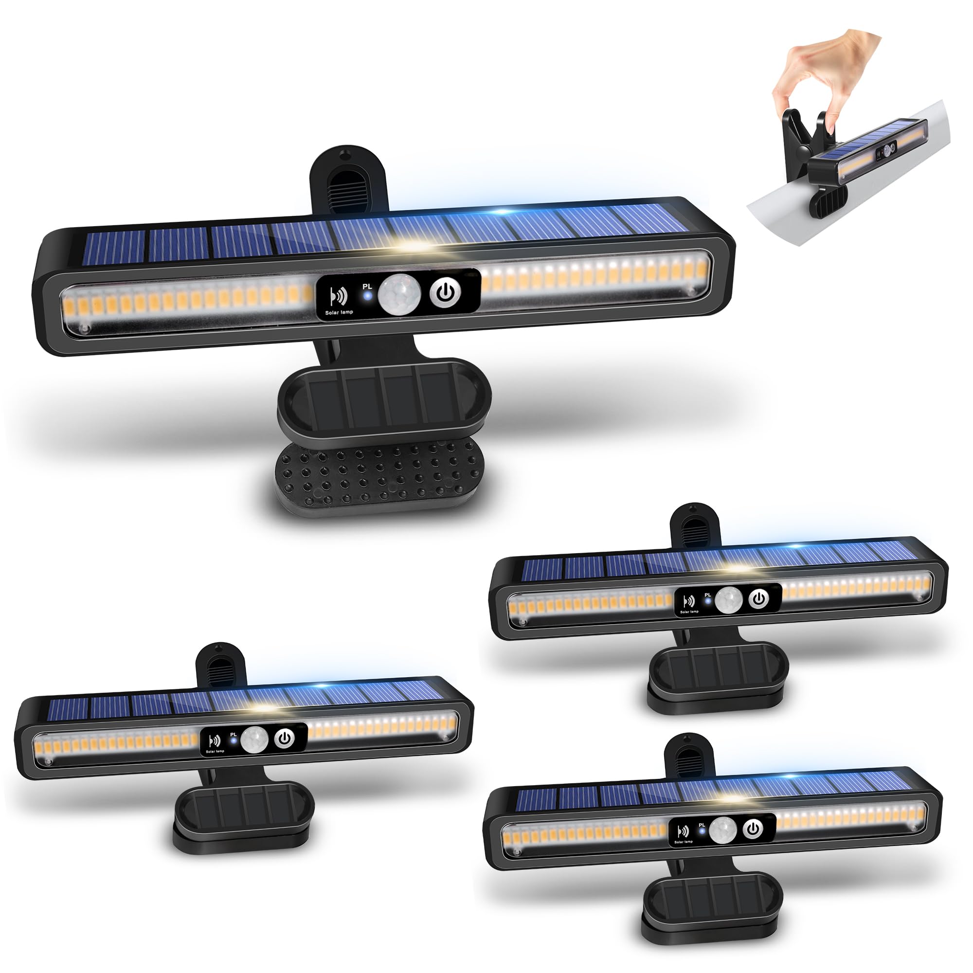 CHAMCHOI センサーライト 屋外 ソーラーライト 屋外 クリップ 人感センサー 防水 防犯らいと 2000mAh 3つ点灯モード センサー照明 自動点灯/消灯 ガーデン ガーデン ウォール 壁掛け式 玄関/駐車場/車道/ガレージ 防犯対策 停電・災害時に適用 IP55防水 太陽光発電 電気代0(4点セット 電球色)