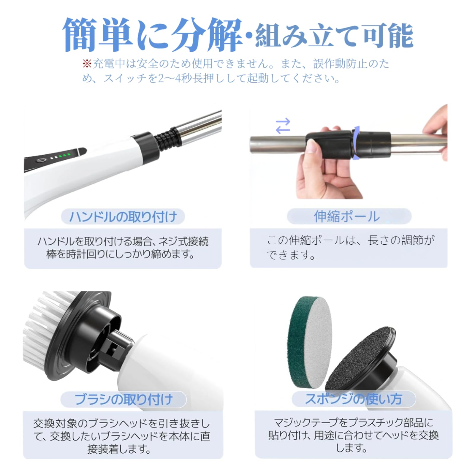 【2026 IPX8防水】 お風呂掃除 ブラシ バスポリッシャー 電動お掃除ブラシ コードレス USB Type-C充電式 8種類替えブラシ 伸縮可能 長さ調節 2段階回転速度 高速回転 軽量 静音 90分連続使用 浴室 浴槽 床 窓 玄関 車磨き 年末大掃除 日本語説明書付き