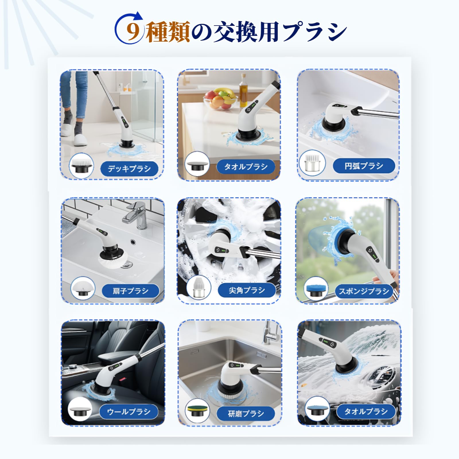 【2025 IPX8防水】 お風呂掃除 ブラシ バスポリッシャー 電動お掃除ブラシ コードレス USB Type-C充電式 8種類替えブラシ 伸縮可能 長さ調節 2段階回転速度 高速回転 軽量 静音 90分連続使用 浴室 浴槽 床 窓 玄関 車磨き 年末大掃除 日本語説明書付き
