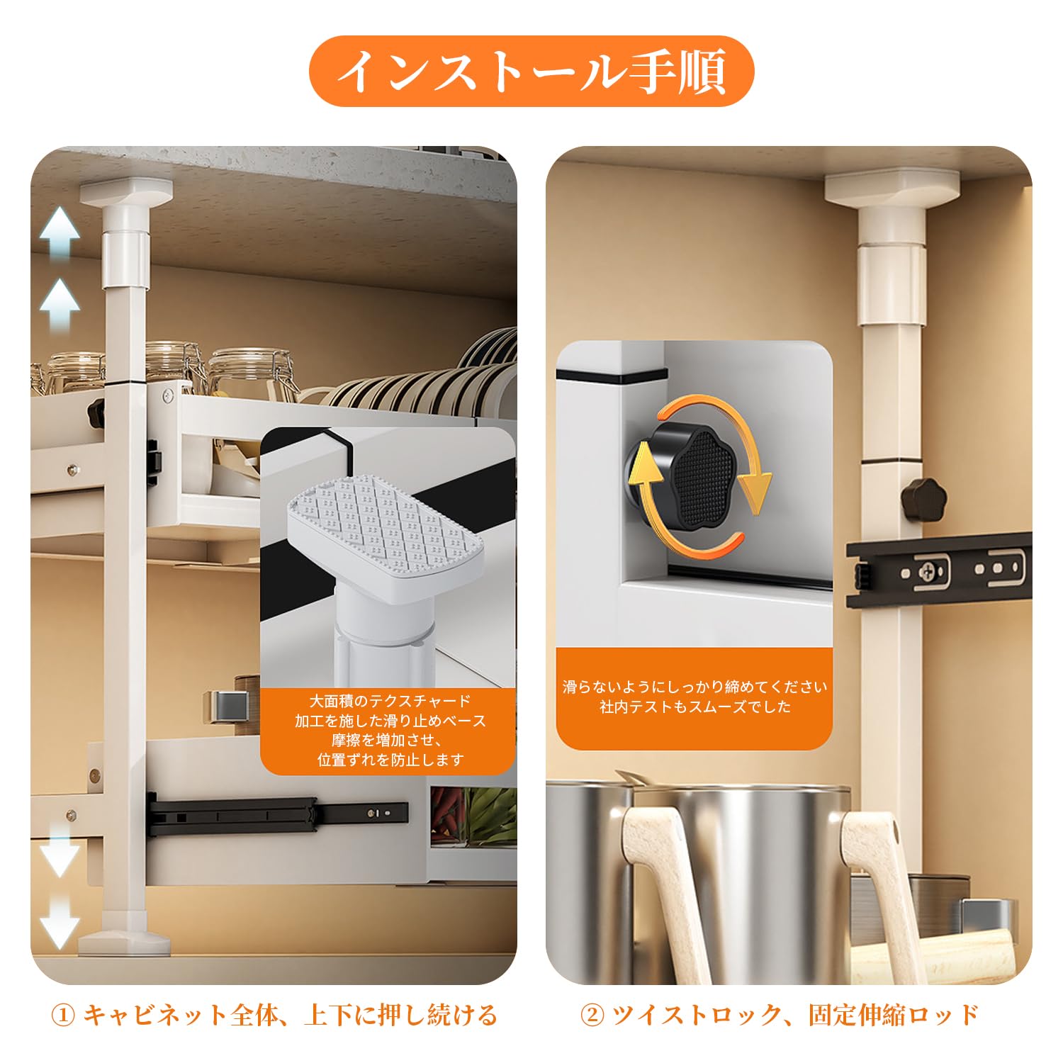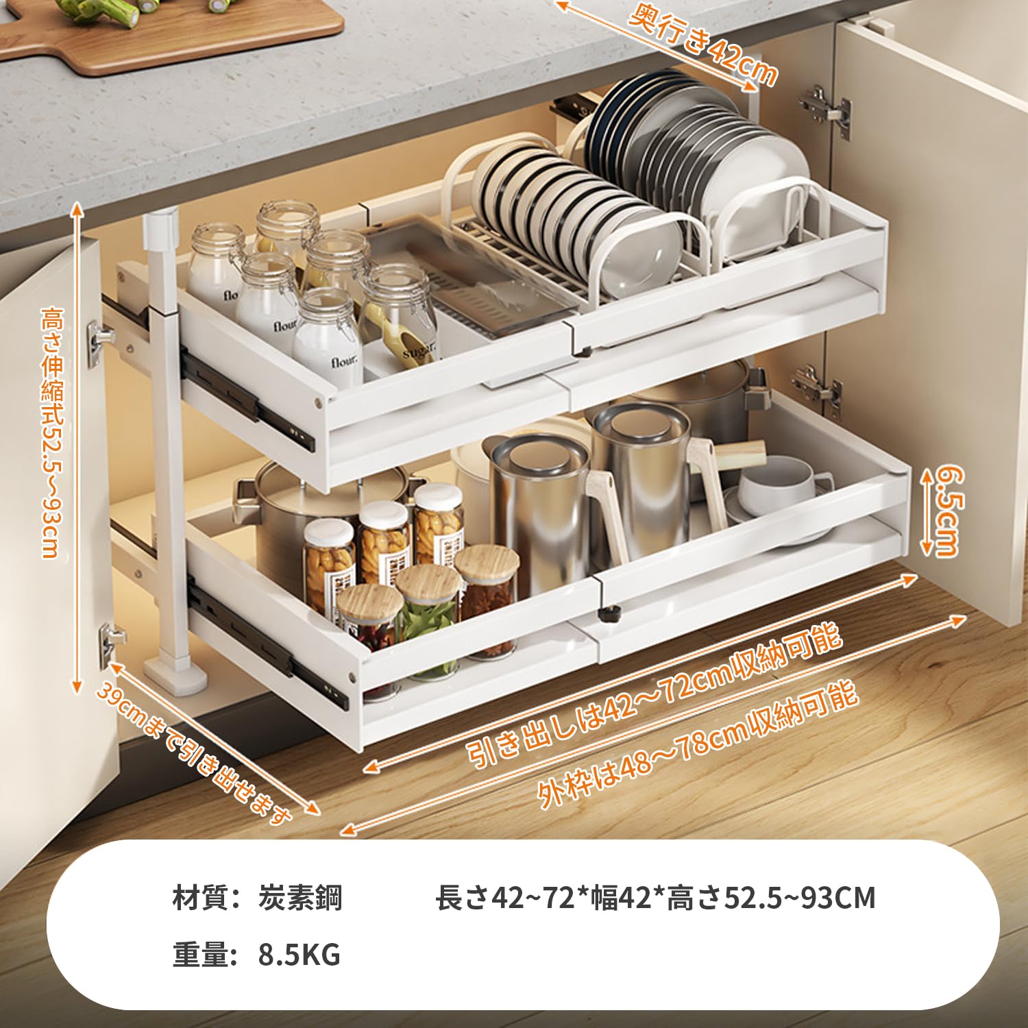 Ouxee シンク下 収納 ラック 伸縮タイプ - 2段 キッチン下収納 伸縮棚 日本語取扱説明書付き 組み立て簡単 横幅・高さ調整可能 幅52.5-88×奥行25×高さ49㎝