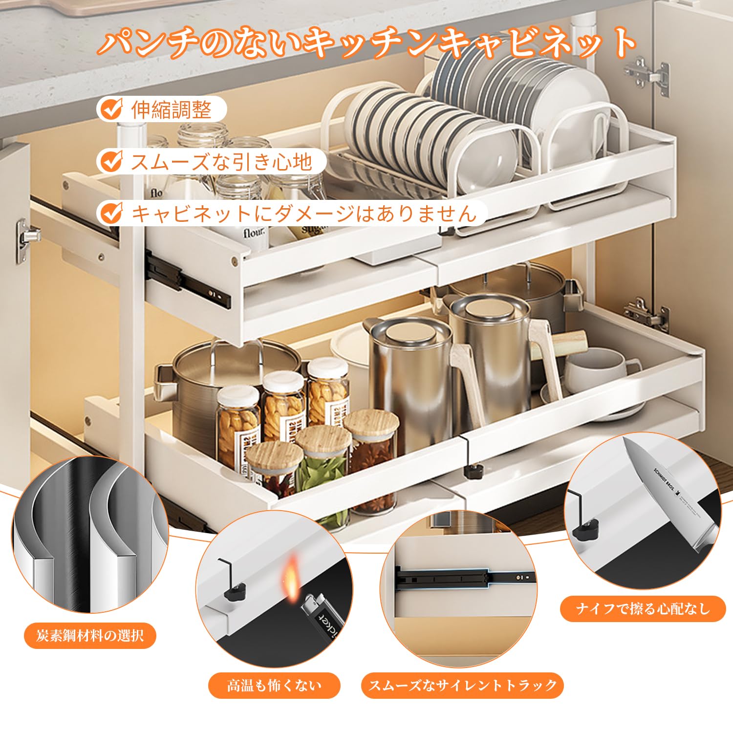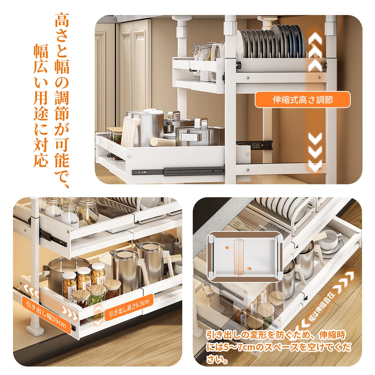 シンク下収納ラック 洗面台下収納 キッチンシンク下収納ラック 収納バスケット付 2段 伸縮 組み立て簡単 省スペース 伸縮棚 横幅調整可能