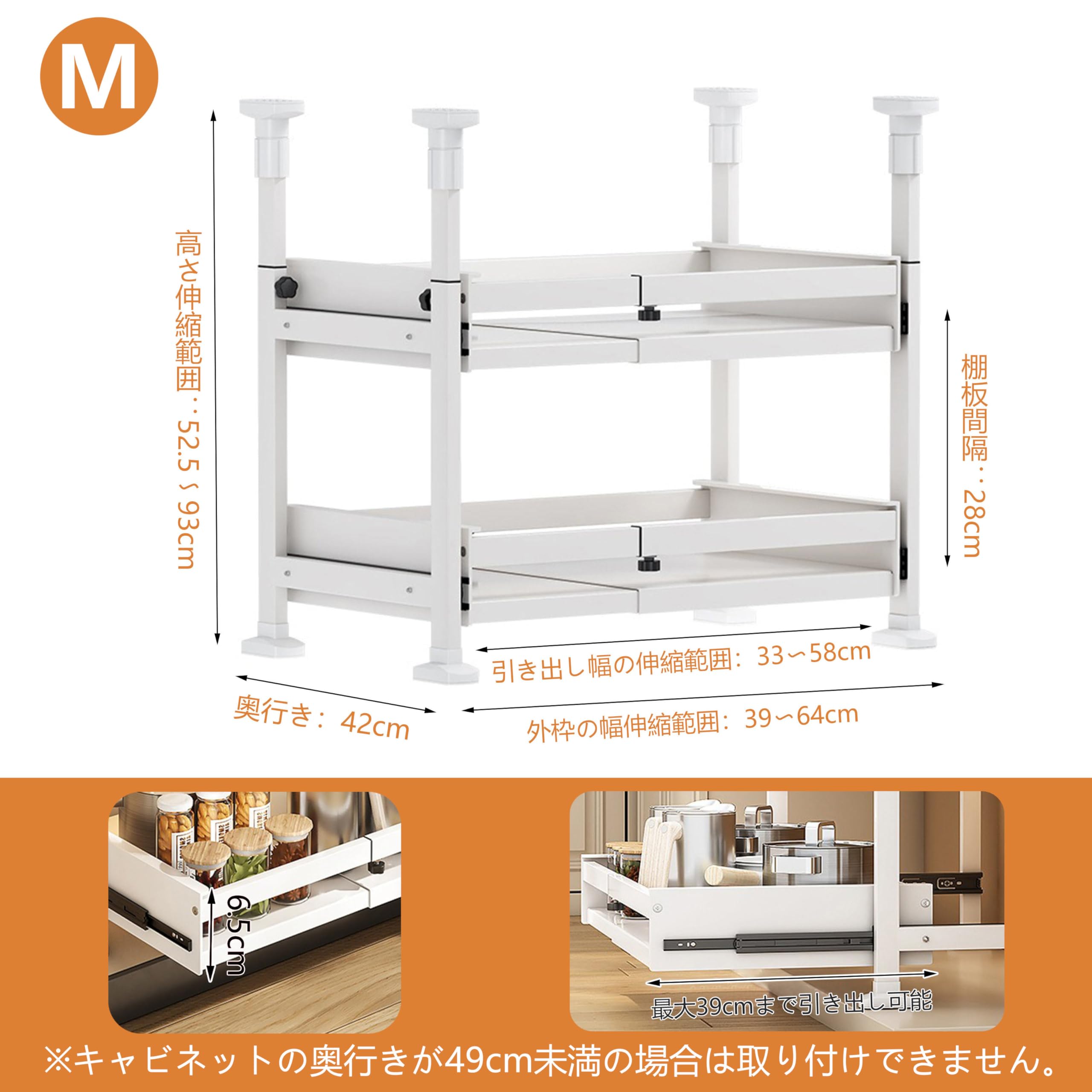 Ouxee シンク下 収納 ラック 伸縮タイプ - 2段 キッチン下収納 伸縮棚 日本語取扱説明書付き 組み立て簡単 横幅・高さ調整可能 幅52.5-88×奥行25×高さ49㎝