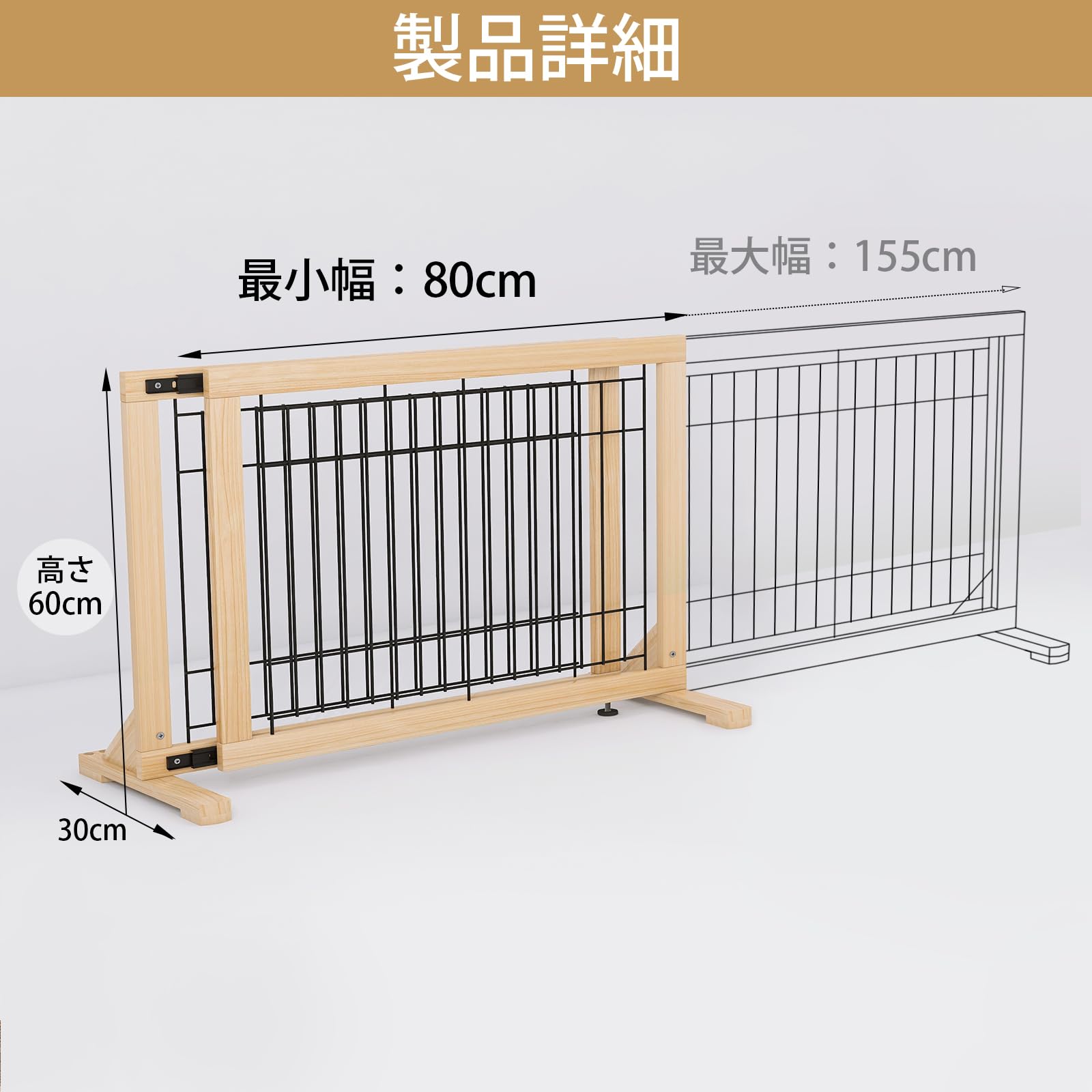 Oapety ペットゲート 犬 高さ60CM 伸縮幅約85~155cm 木製 ベットフェンス 置くだけ 柵 室内 飛び出し防止柵 脱走防止 中小型犬用 スムーズ ガイドレール付き