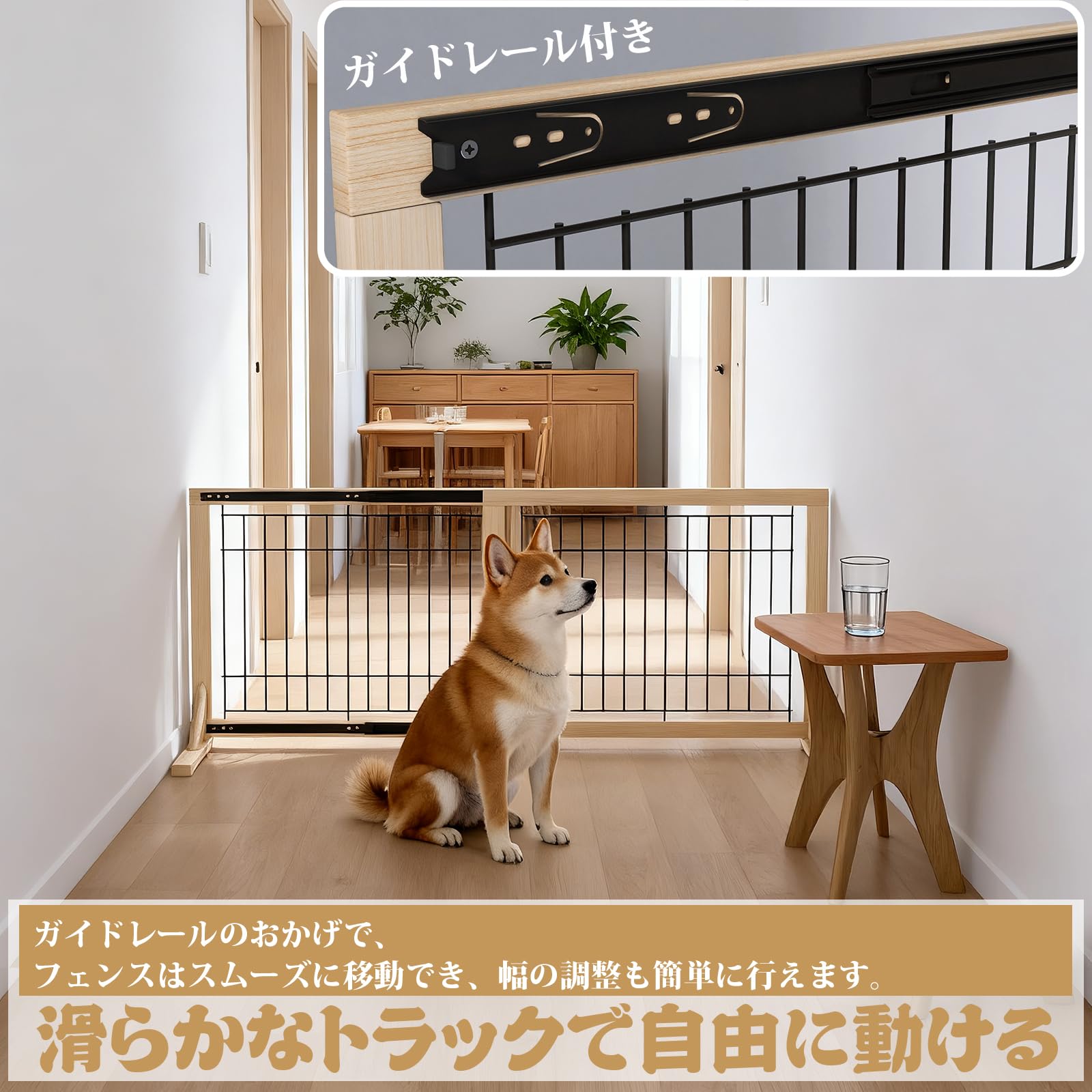 Oapety ペットゲート 犬 柵 高さ50CM 伸縮幅約85~155cm 木製 ベットフェンス 置くだけ柵 室内 飛び出し防止柵 脱走防止 中小型犬用 スムーズ ガイドレール付き