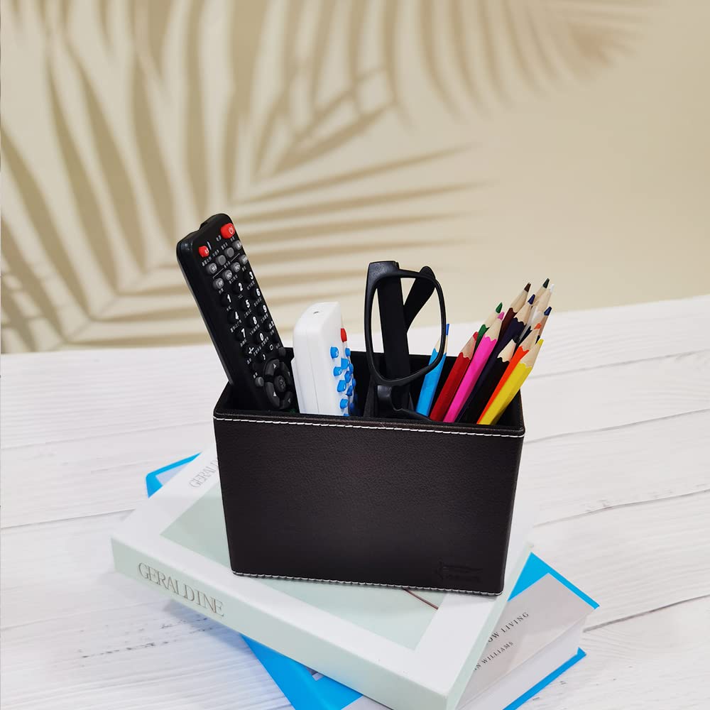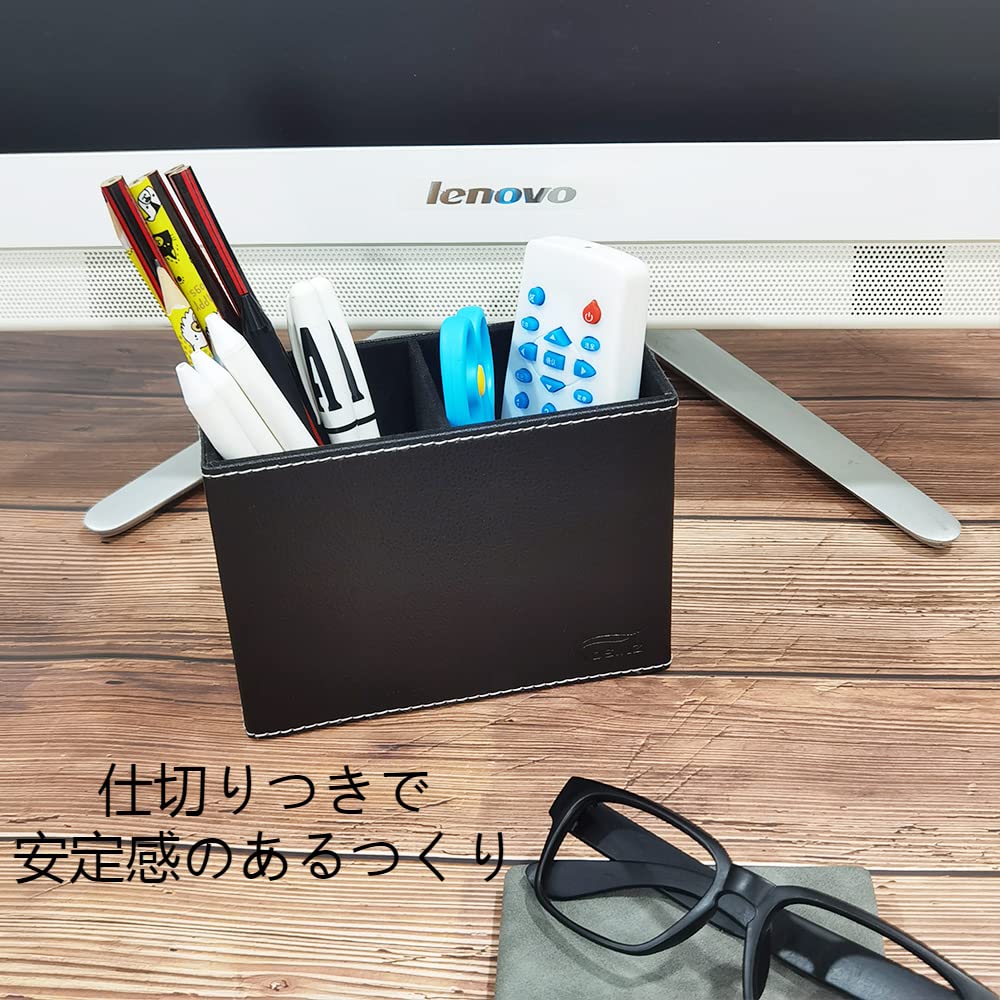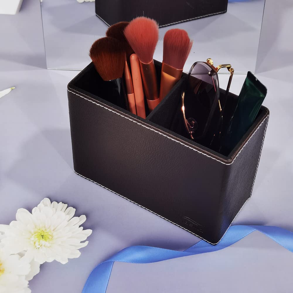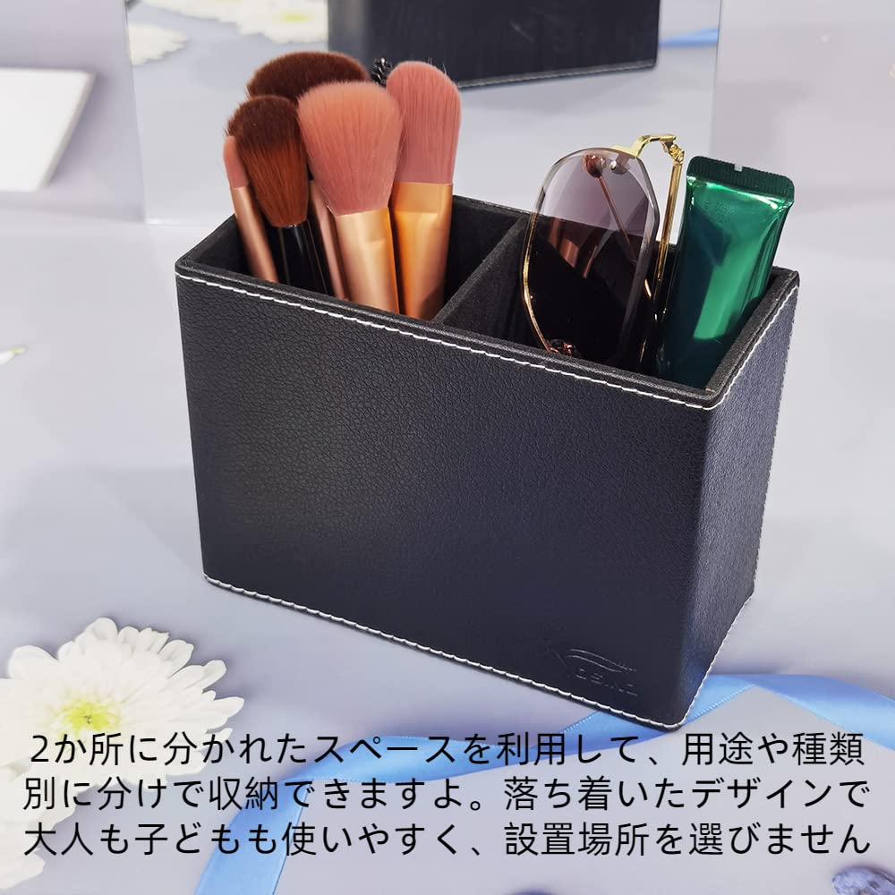 Fosinz ペン立て ペンスタンド 2仕切 PUレザー メガネスタンド 卓上収納 机上用品 小物入れ デスク上収納 子供部屋 書斎 (ブラック)