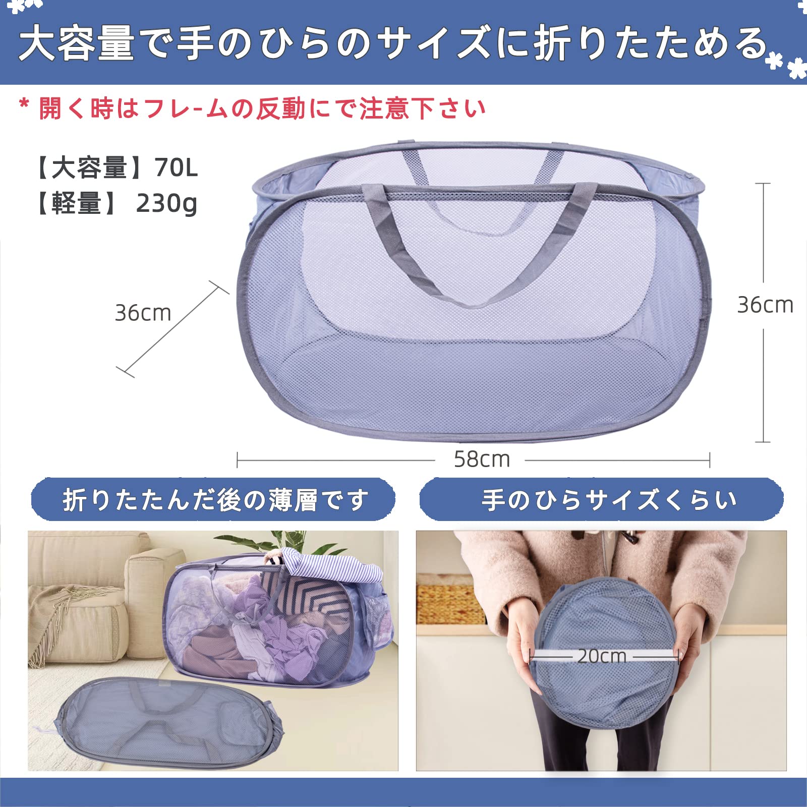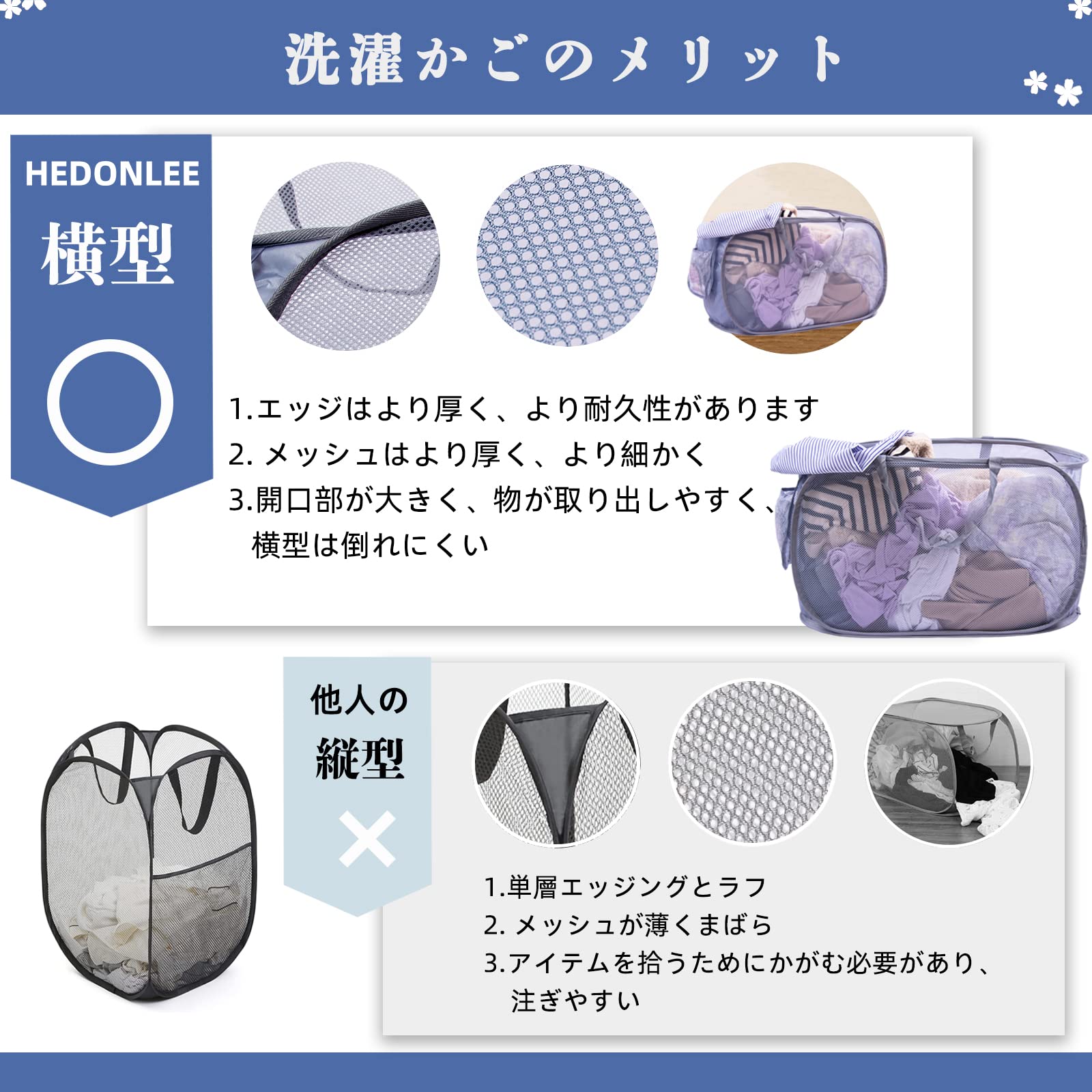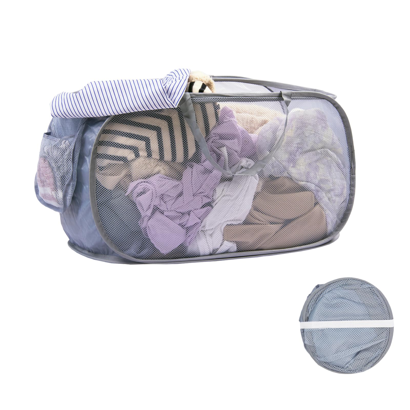 HEDONLEE 洗濯カゴ 洗濯かご 折りたたみ 横型 ランドリーバスケット 70L 大容量 メッシュ ランドリーバッグ ランドリーボックス 洗濯籠 洗濯物入れ 収納 超軽量 旅行 持ち運び可能 (グレー)