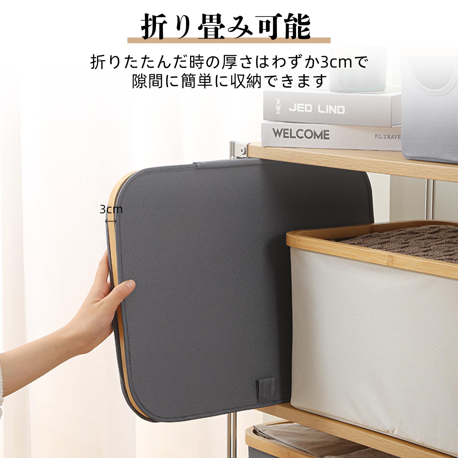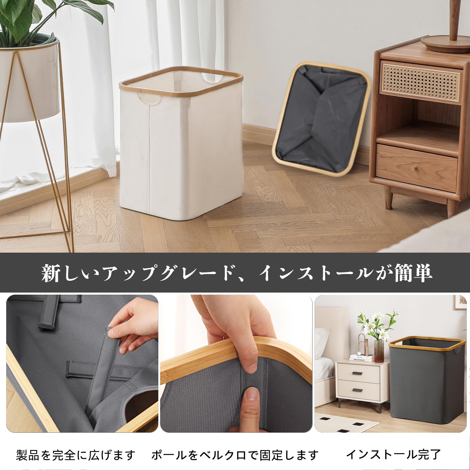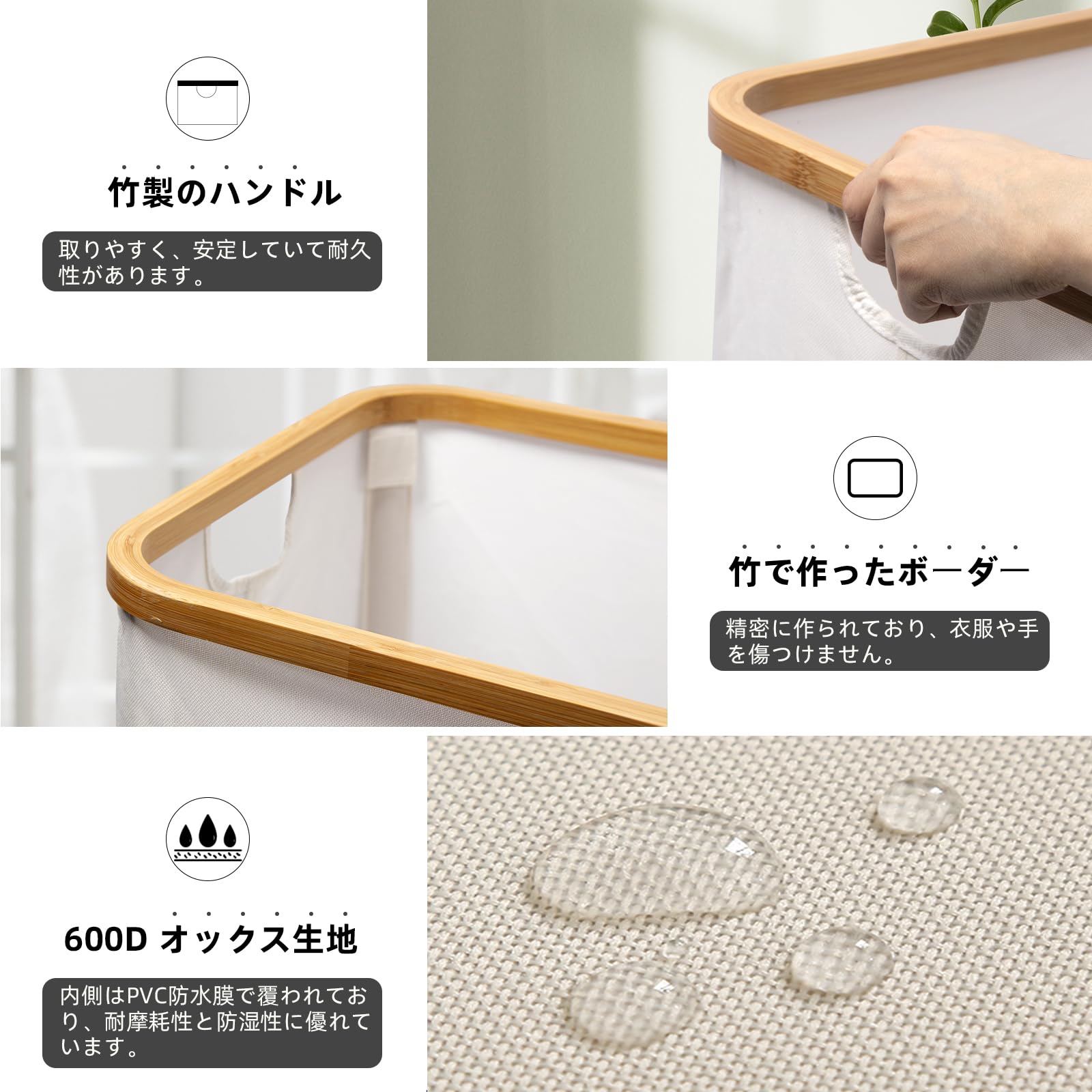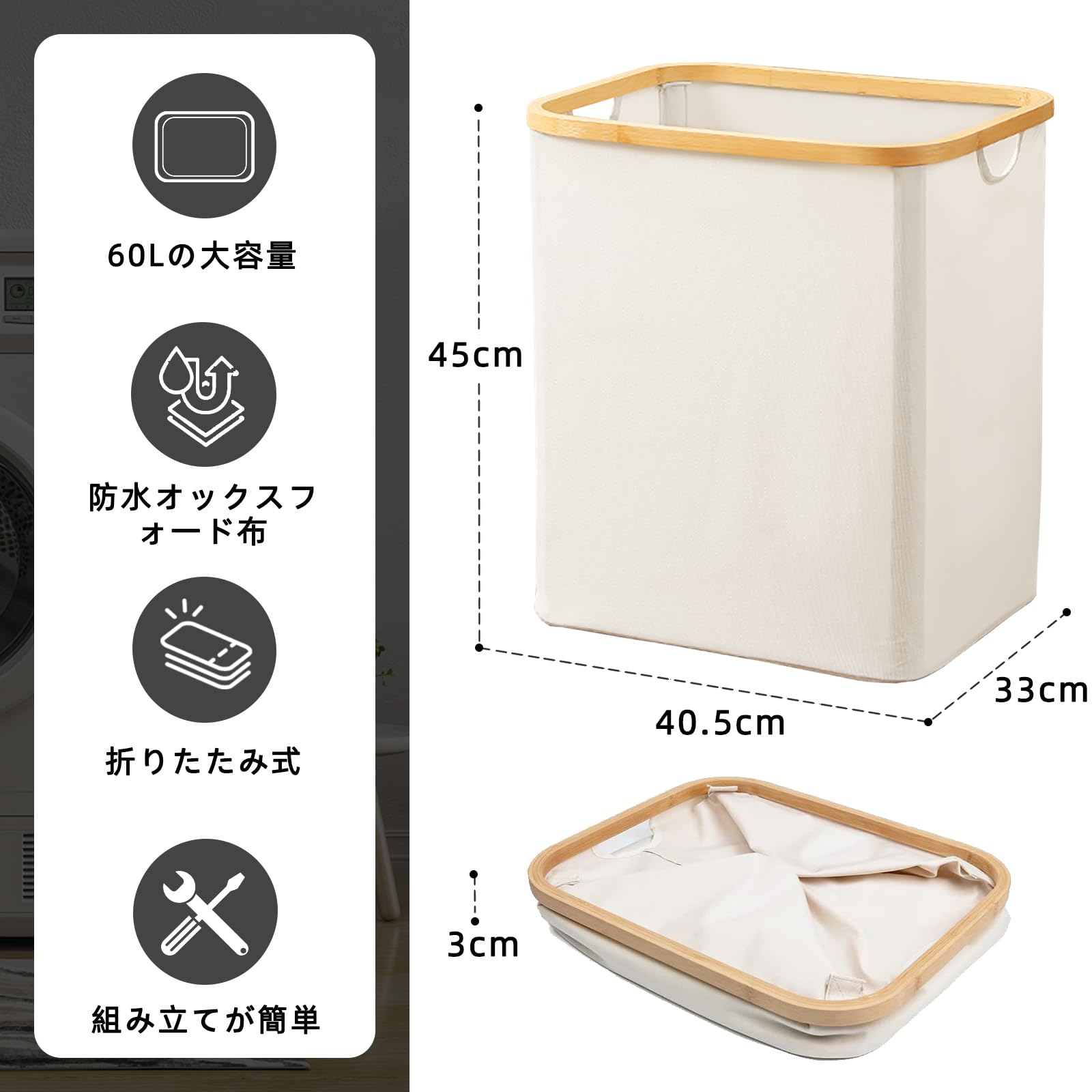 HEDONLEE 洗濯カゴ 洗濯かご 折り畳み式 ランドリーバスケット 60L ランドリーボックス 洗濯籠 洗濯物入れ 収納ボックス 収納バッグ 竹のハンドル付き (オフホワイト)