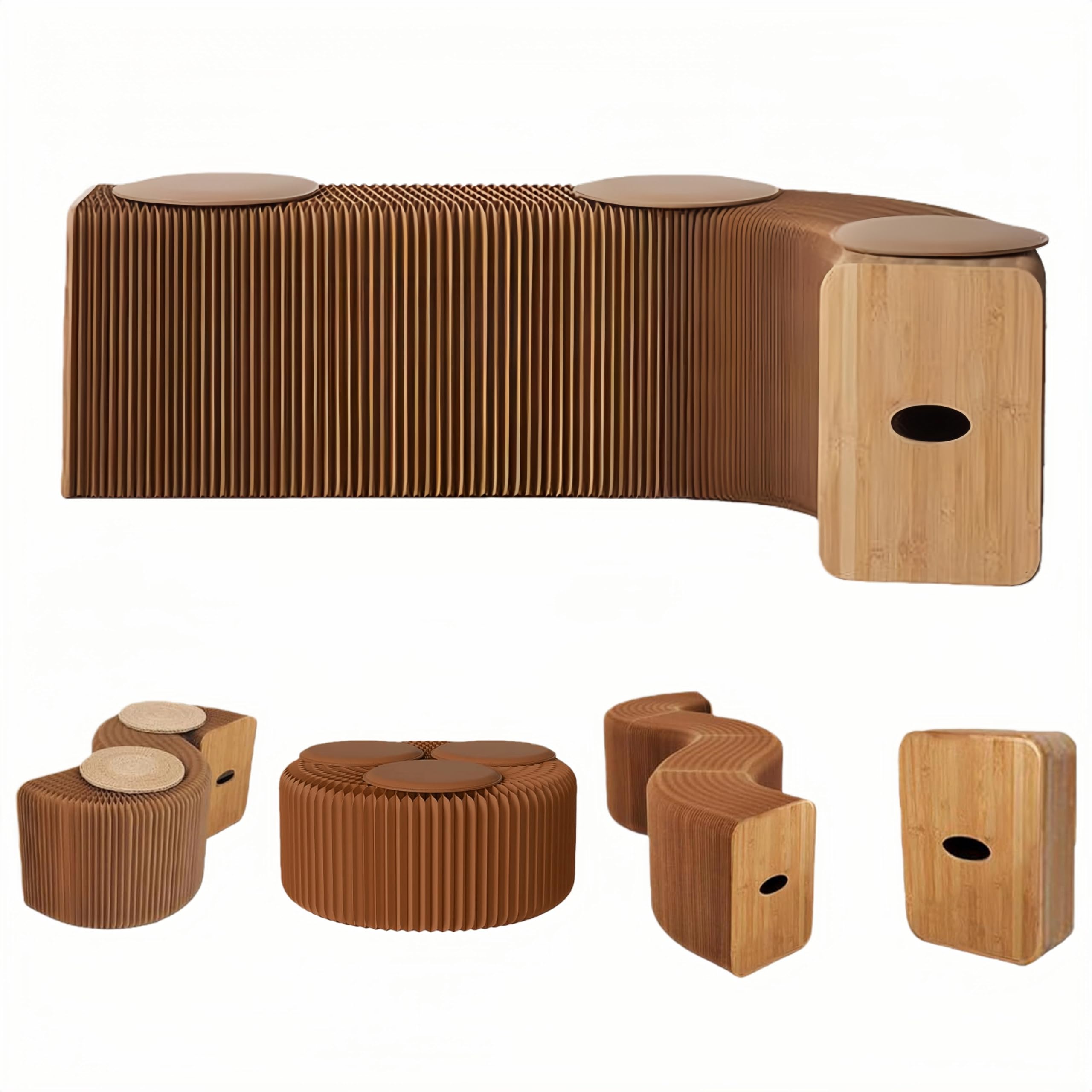 アコーディオン 椅子 紙 折りたたみスツール ペーパーベンチ スツール 折り畳み 伸縮 紙製ベンチ 軽量 コンパクト一屋内やレストランでのくつろぎに最適 省スペース ソファ (茶色, 高さ30cm 長さ1.5m + 革パッド3枚)