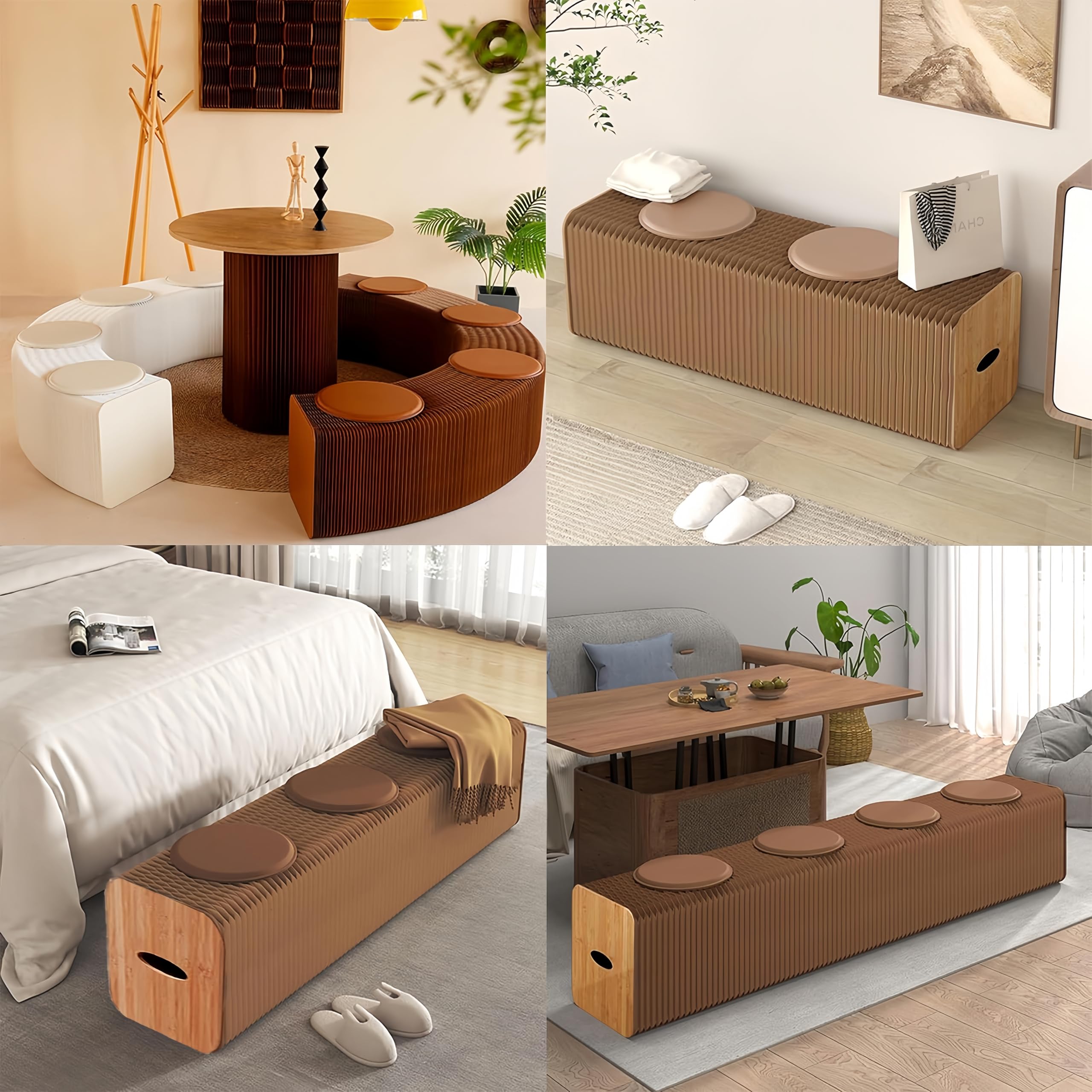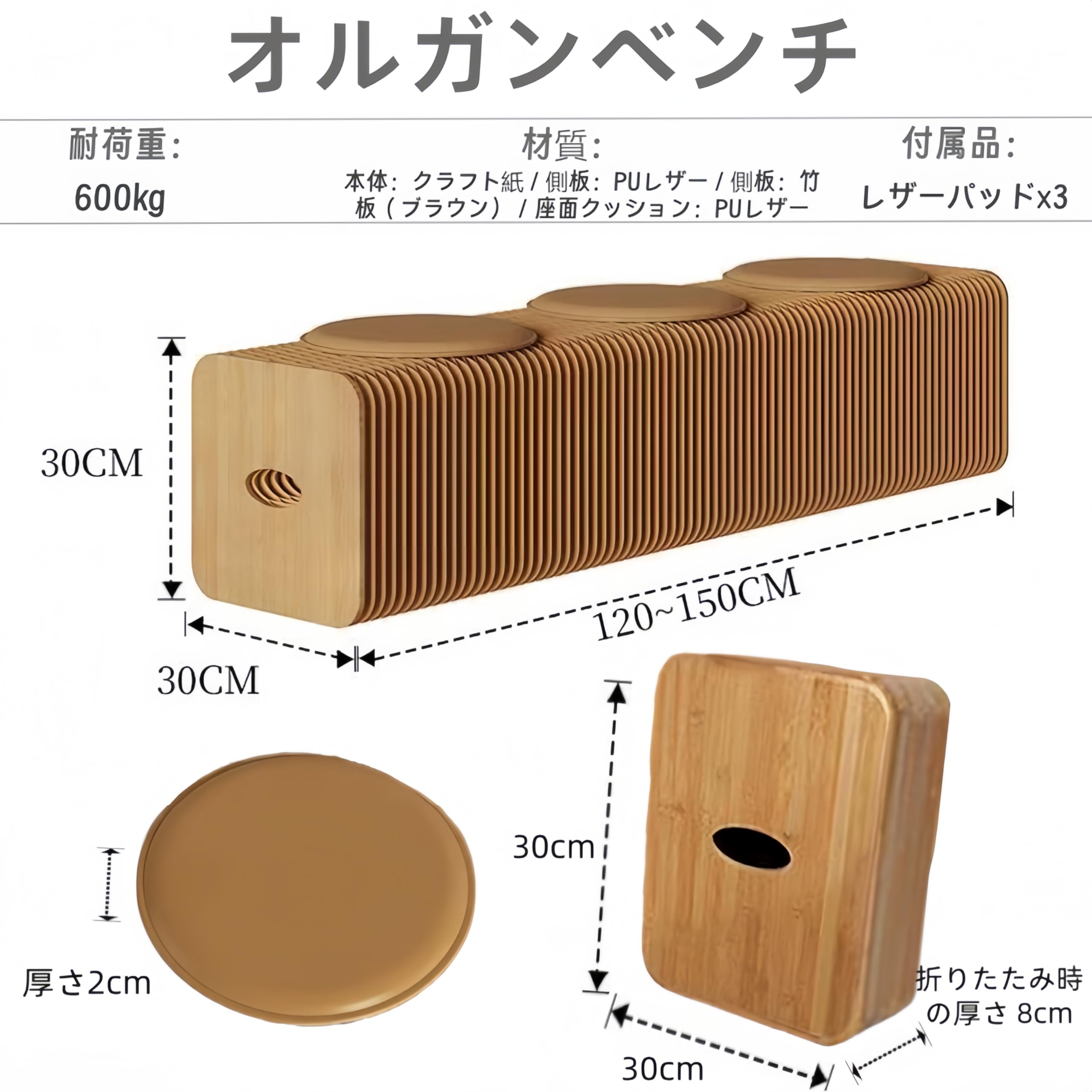YangAera アコーディオン 椅子 折りたたみ紙スツール 座布団付き 長さ調節可能 4色展開 ギャラリー/休憩室/リビングルーム/展示ホール/ビジネスシナリオ用 最大1000kg 耐荷重 スペースを節約 (茶色, 長さ150cm 幅さ30cm 高さ42cm, 革パッド3枚)