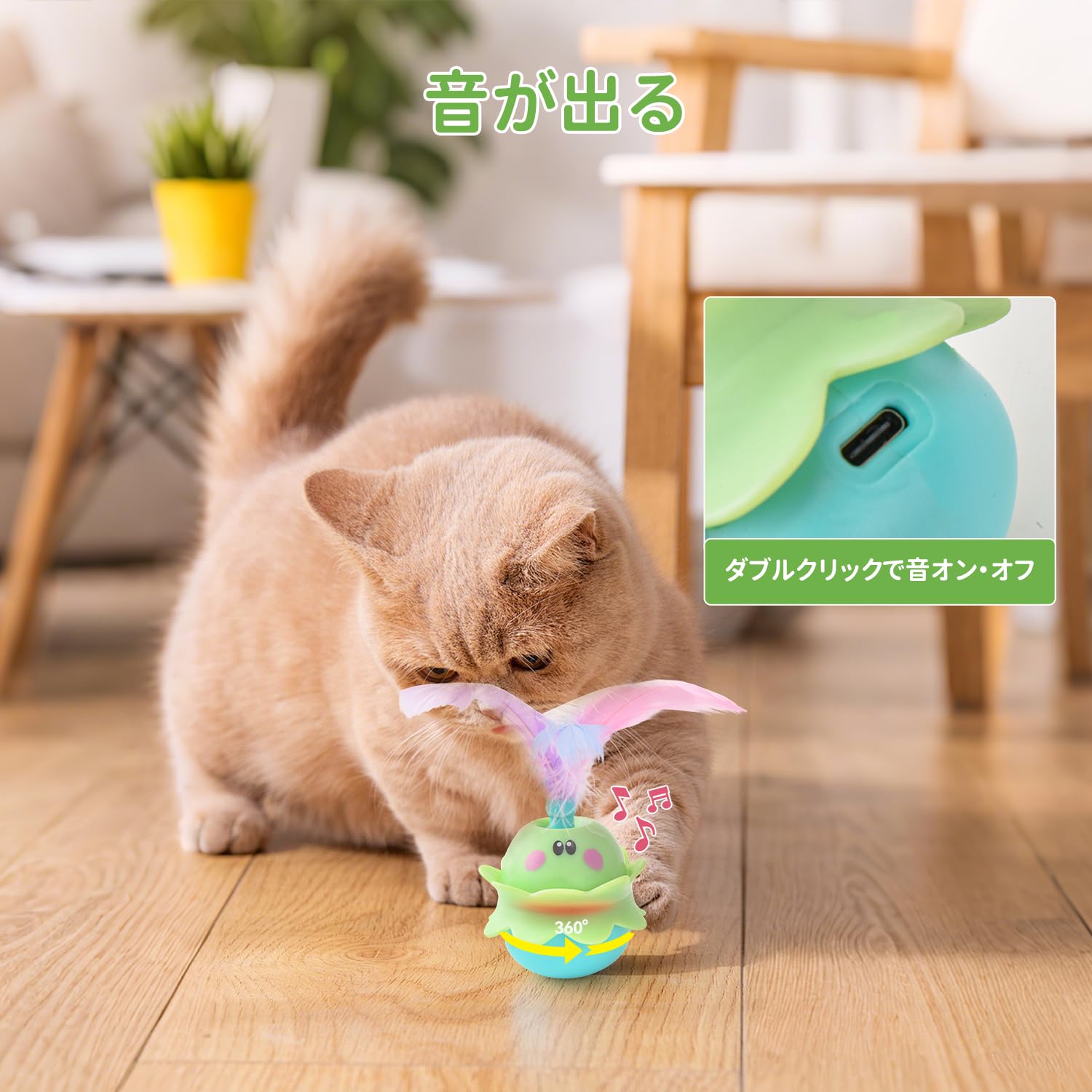 LIFLIX 猫 おもちゃ 一人遊び 猫じゃらし 自動 羽根付き 電動玩具 回転 USB充電式 音が出る 光る グリーン