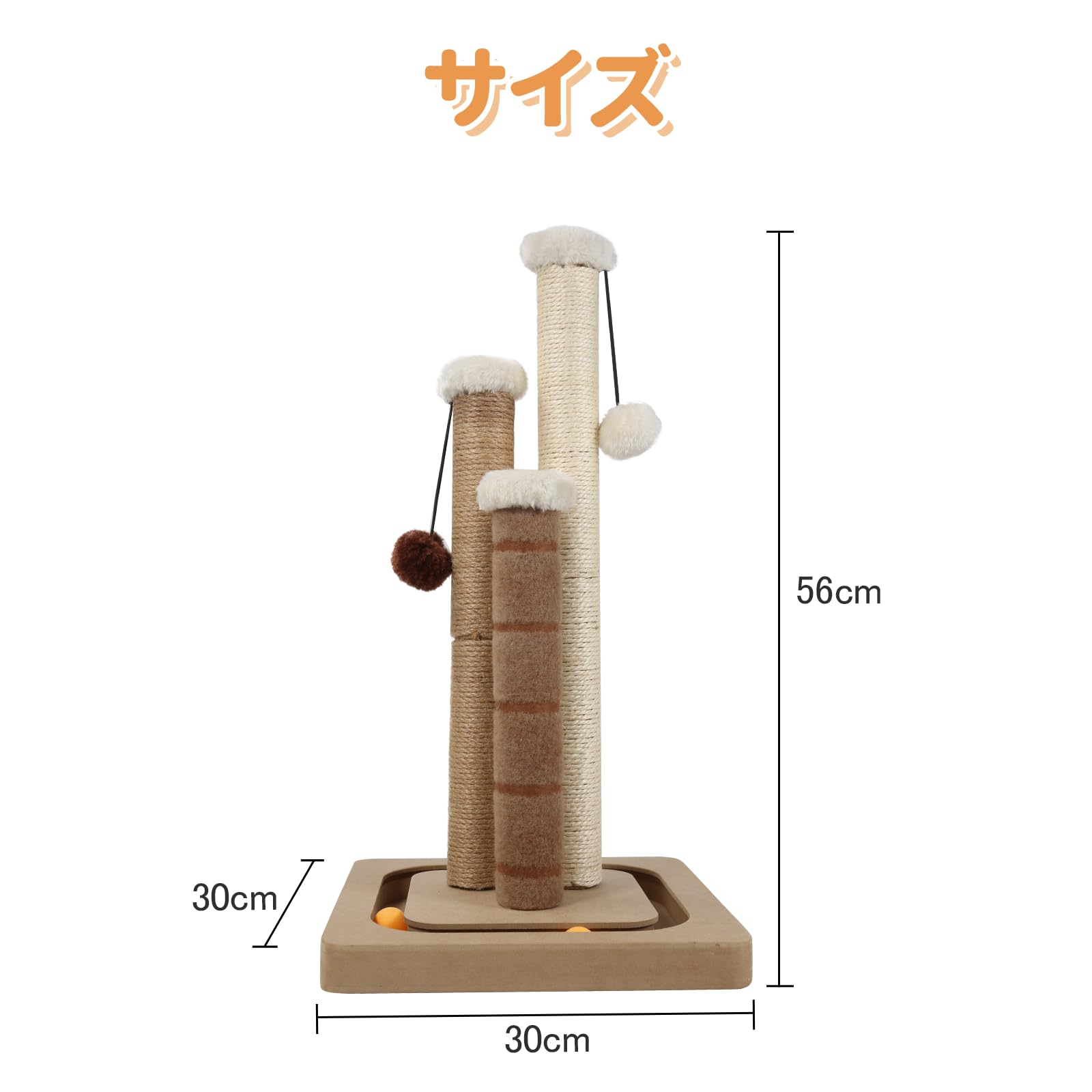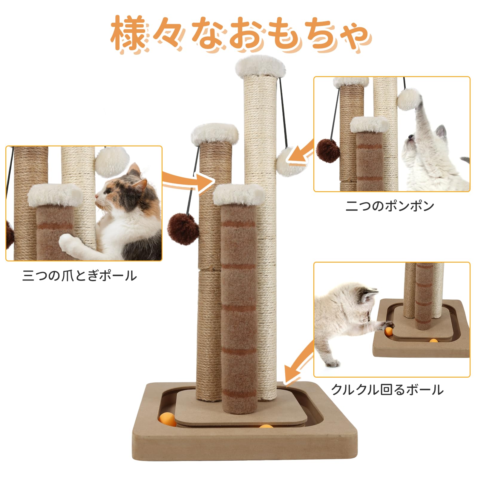 AUSCAT 猫爪研ぎポール おもちゃ付き 3つ猫爪とぎポール 天然サイザル 麻 回転ボールとポンポン付き 長持ち 安定 頑丈 縦置き型 組み立て簡単