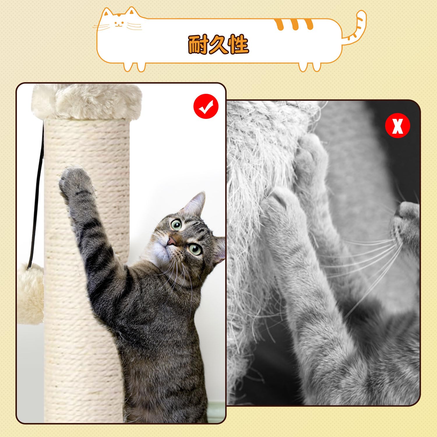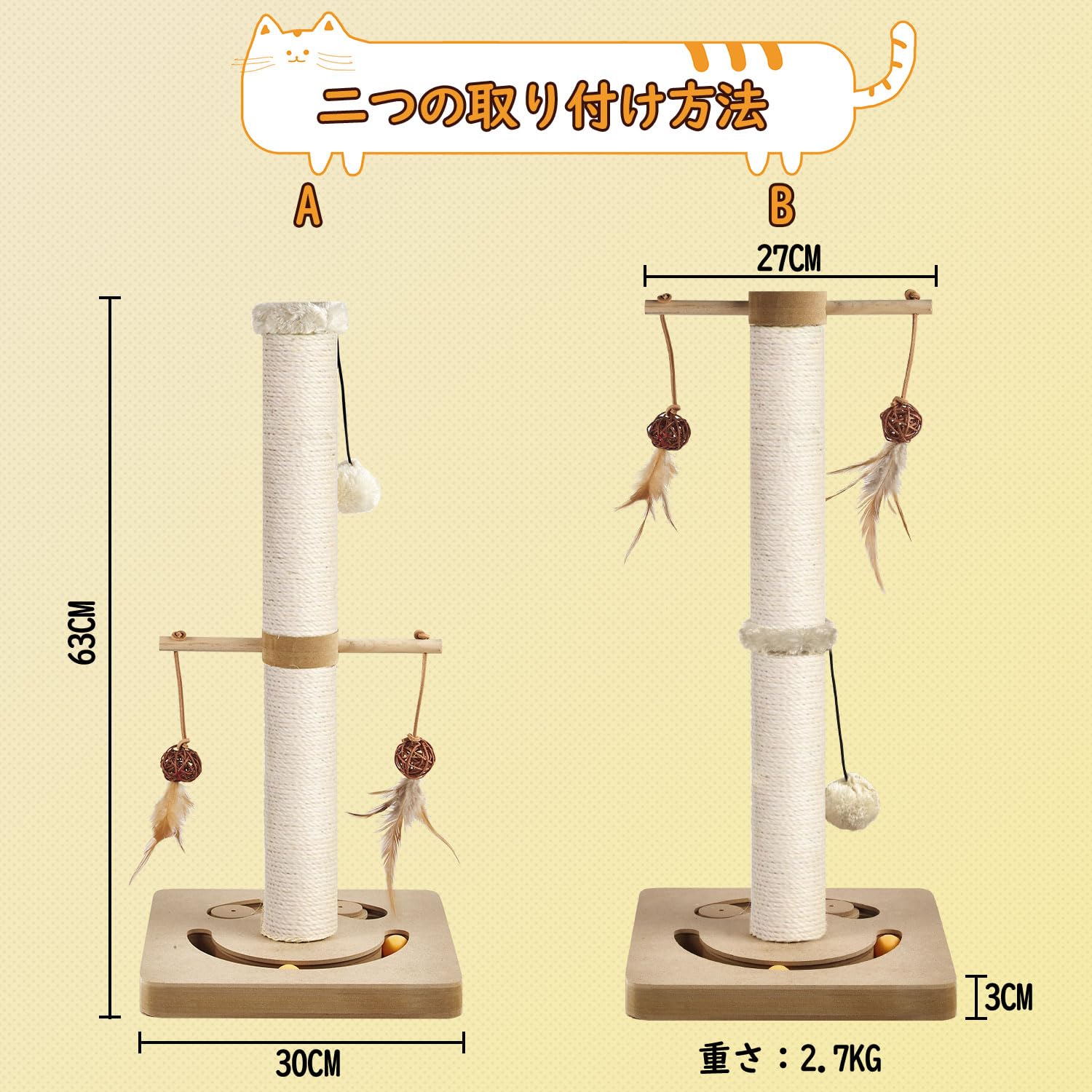 AUSCAT 猫爪とぎポール マルチ猫おもちゃ 遊び放題 猫つめとぎ スクラッチポール 安定 頑丈 長持ち 運動不足やストレス解消 天然サイザル麻 2つ組み立て方法