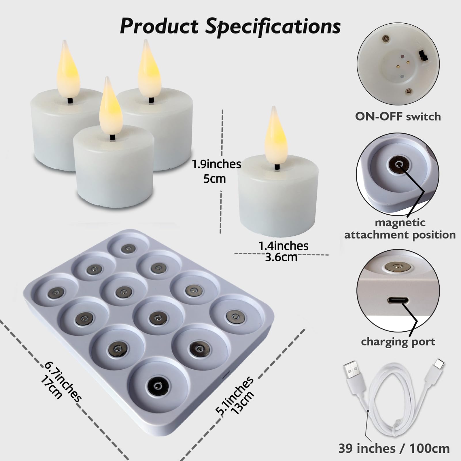 磁気充電フレームレスティーライト リモコン付き - 12個 リアルなLEDキャンドル ちらつきの炎の効果 ホワイト