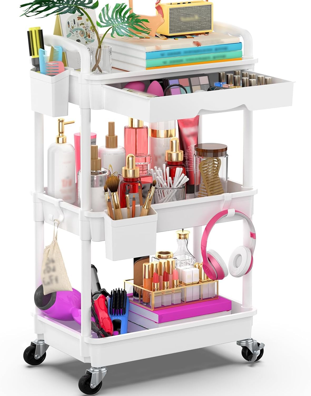 キッチンワゴン ローリング 3段 引き出し付き ハンドル付き オールスチール構造 防錆 ペットボトルラック 収納カップ 仕切板付き 多機能 小物 隙間収納 バスケットラック バスルーム オフィス キッチン用 収納ワゴン