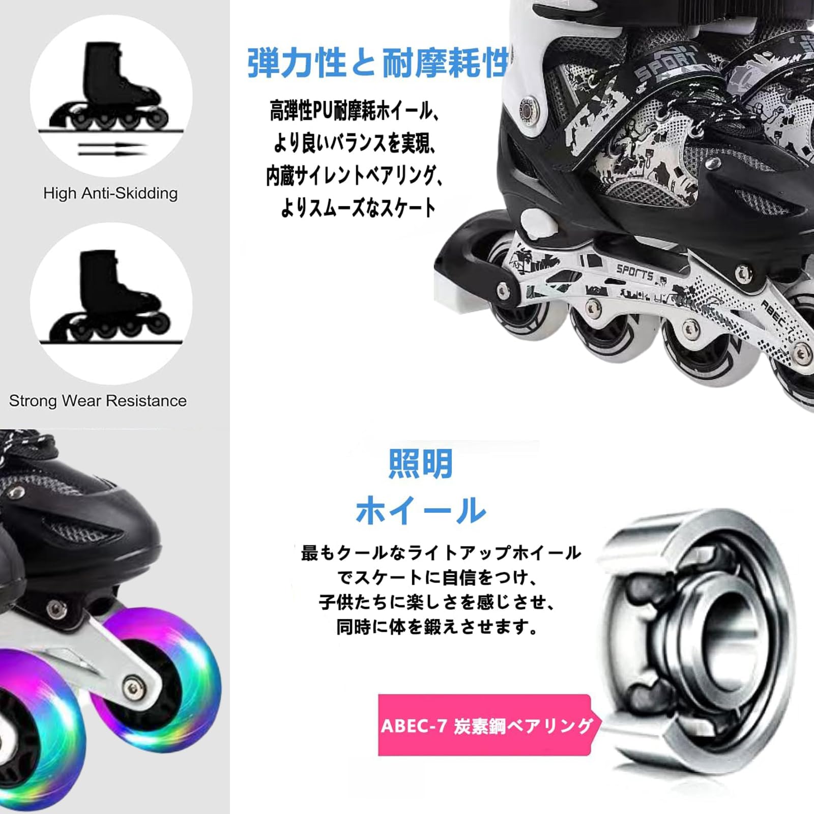 ローラースケート 子供用 インラインスケート rollerskate kid Inlineskate 子供 ローラー スケート 初心者向け 大人用 3段階サイズ調整 ローラーシューズ 発光 静音 通気 安定 フラッシュホイール スポーツ プレゼント