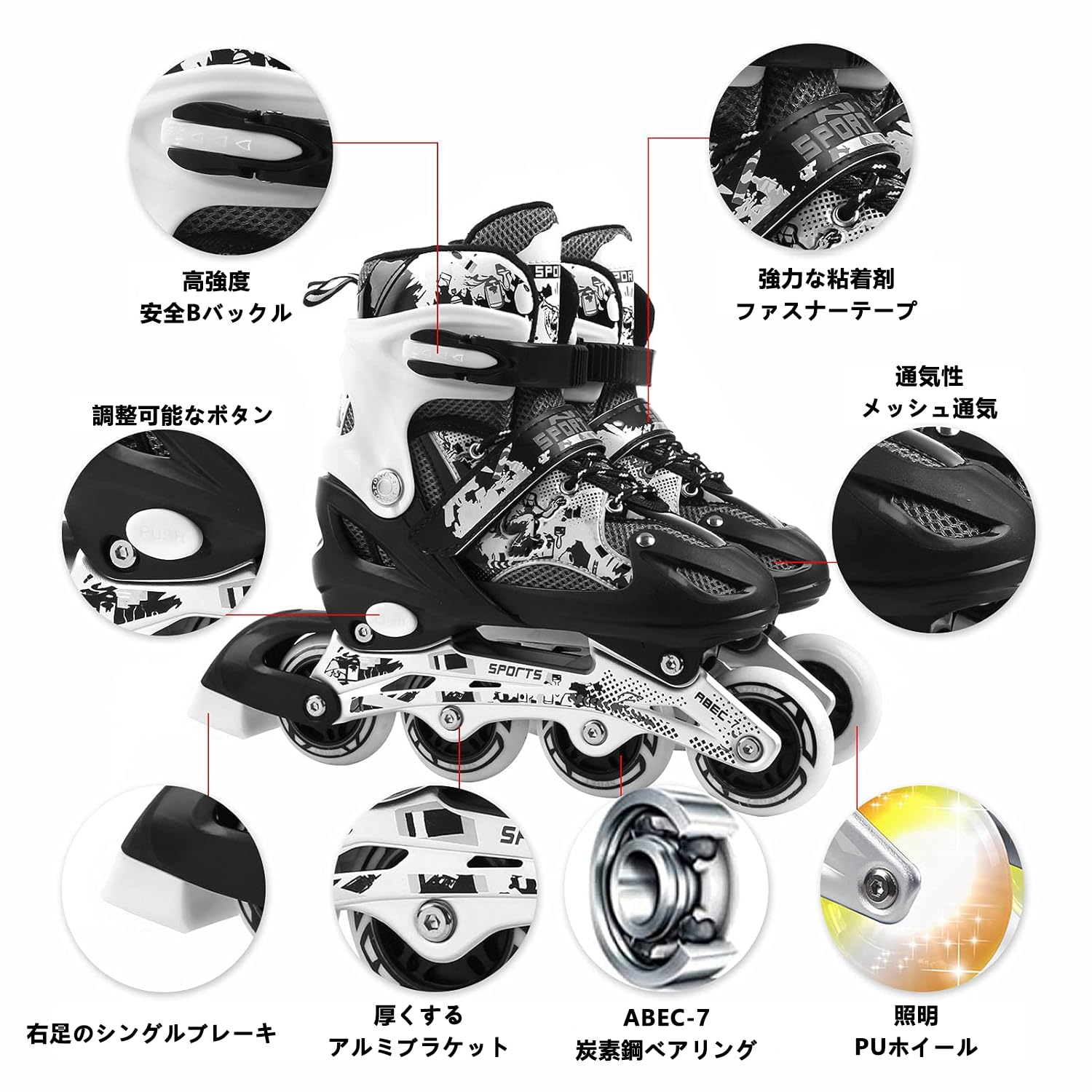 調整可能なインラインスケート:このインラインスケートS(18cm-21cm)、M(21cm-24cm)、L(24cm-27.5cm)。 プッシュボタンを押すことで簡単に調整できます。添付のサイズ表に従ってインラインローラースケートの適切なペアを選択するだけです。8輪のイルミネーション:当社の子供用インラインスケートには、スケートを始めると自動的に点灯する4つの光る車輪が付いています。 このライトはホイールローリングで作動し、交換用バッテリーは不要です。丈夫で滑らか:高反発82Aポリウレタンホイールは耐摩耗性がありよりスムーズで高速の静音ABEC-7ベアリングはプレミアム品質のカーボンスチール製です。 滑らかで静かで自信を持って乗車できます。軽量&通気性:この初心者向けローラースケートは、3Dフライニットのつま革デザインを採用しており、ラッピングとサポート特性を持たせるだけでなく、乗馬の負担を軽減し、ローラーブレードの内部からガスを効果的に輸送します。 厚手の快適なライナーはEVAフォーム製で、足をゆったりと快適に保ちます。 軽くて通気性のある履き心地をお楽しみください。顧客サービスの向上:ローラースケートに100%自信を持っています。インラインスケートについてご質問がありましたら、SWEETDREAMカスタマーサービスチームが心を込めてサービスを提供します。 すべての問題は24時間以内に解決されます。 あなたの満足は私たちの最優先事項です!