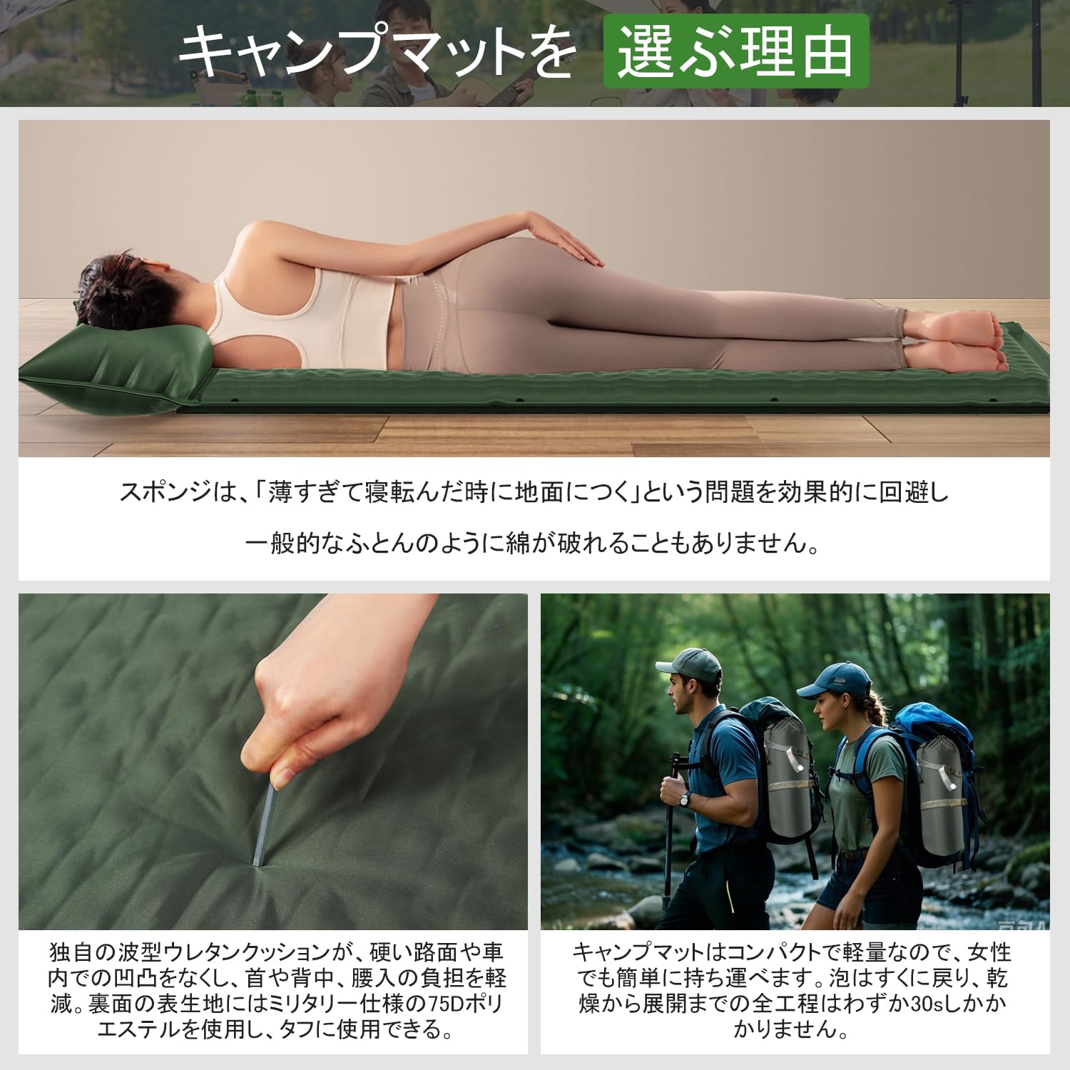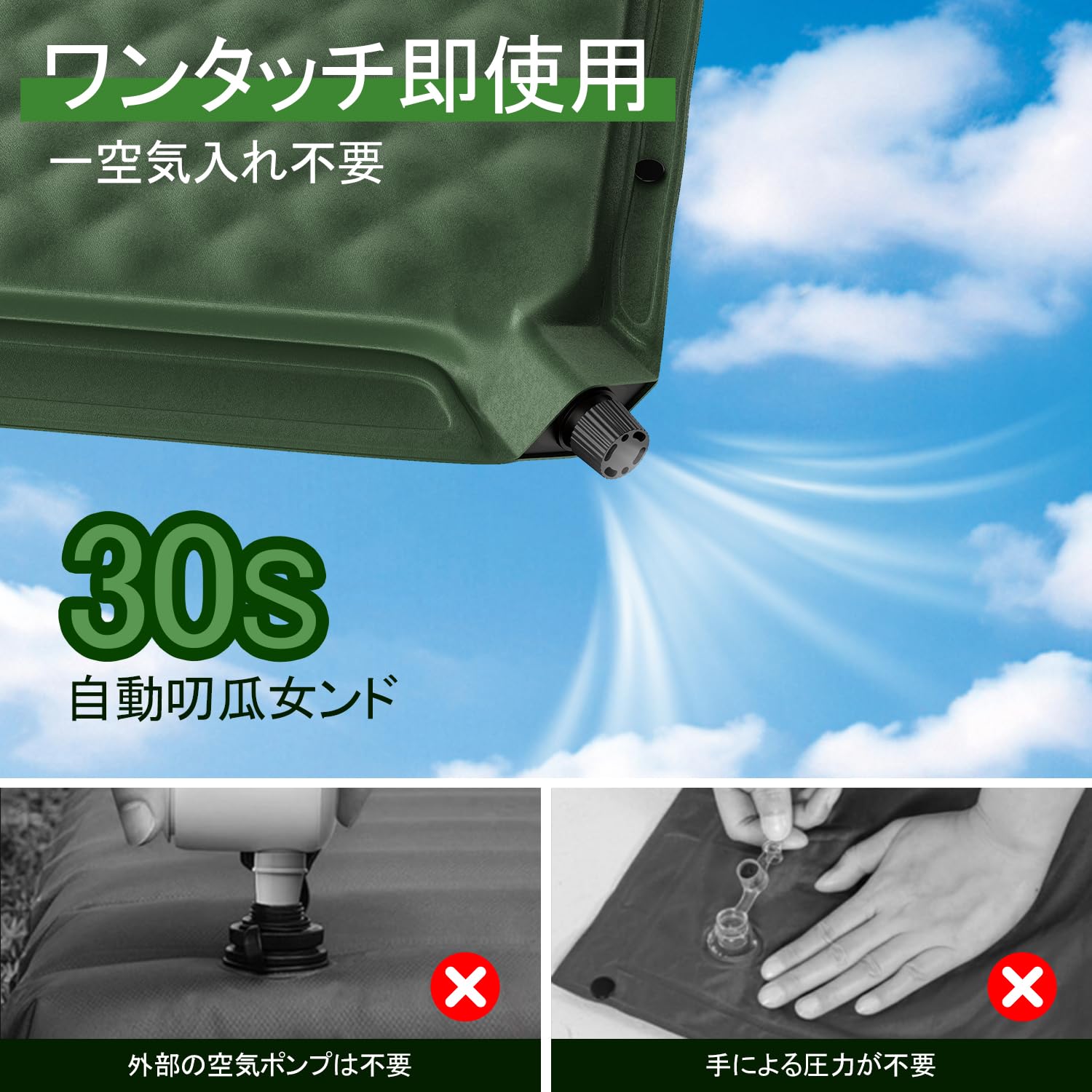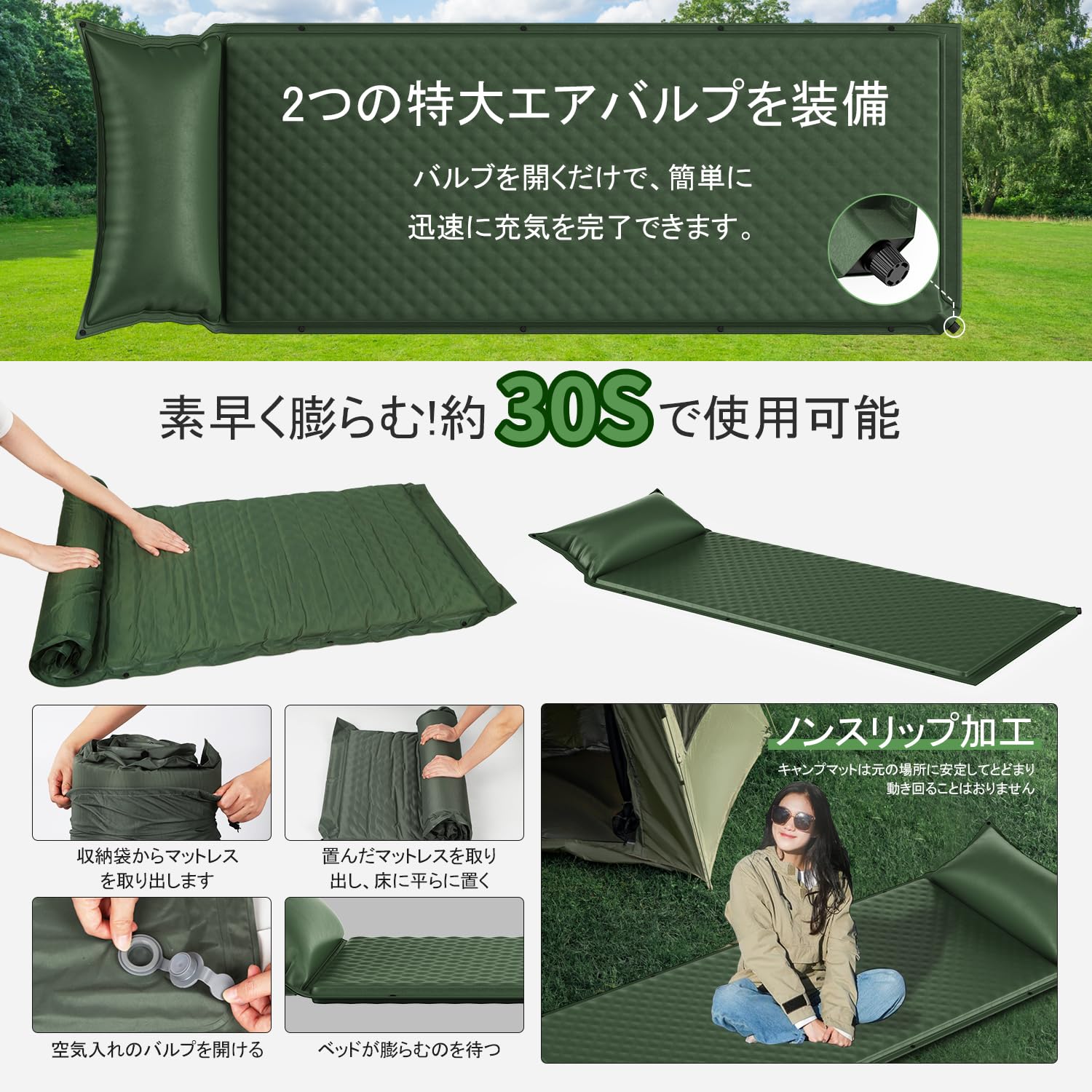 エアーマット キャンプマット【30s膨らむ・5CM厚さ】 高弾性スポンジ エアーベッド R値6.5 超軽量 折り畳 車中泊/防災/テント/持ち運び便利 収納袋付き/キャンプマット/日本語説明書/ゴムバンド2本/補修用シール12枚付き (ふかみどりいろ)
