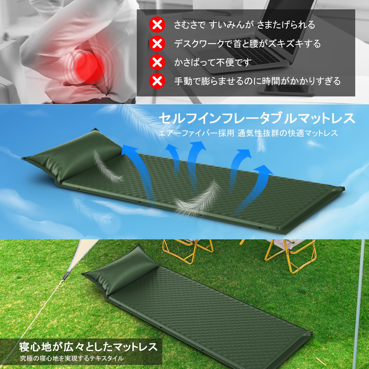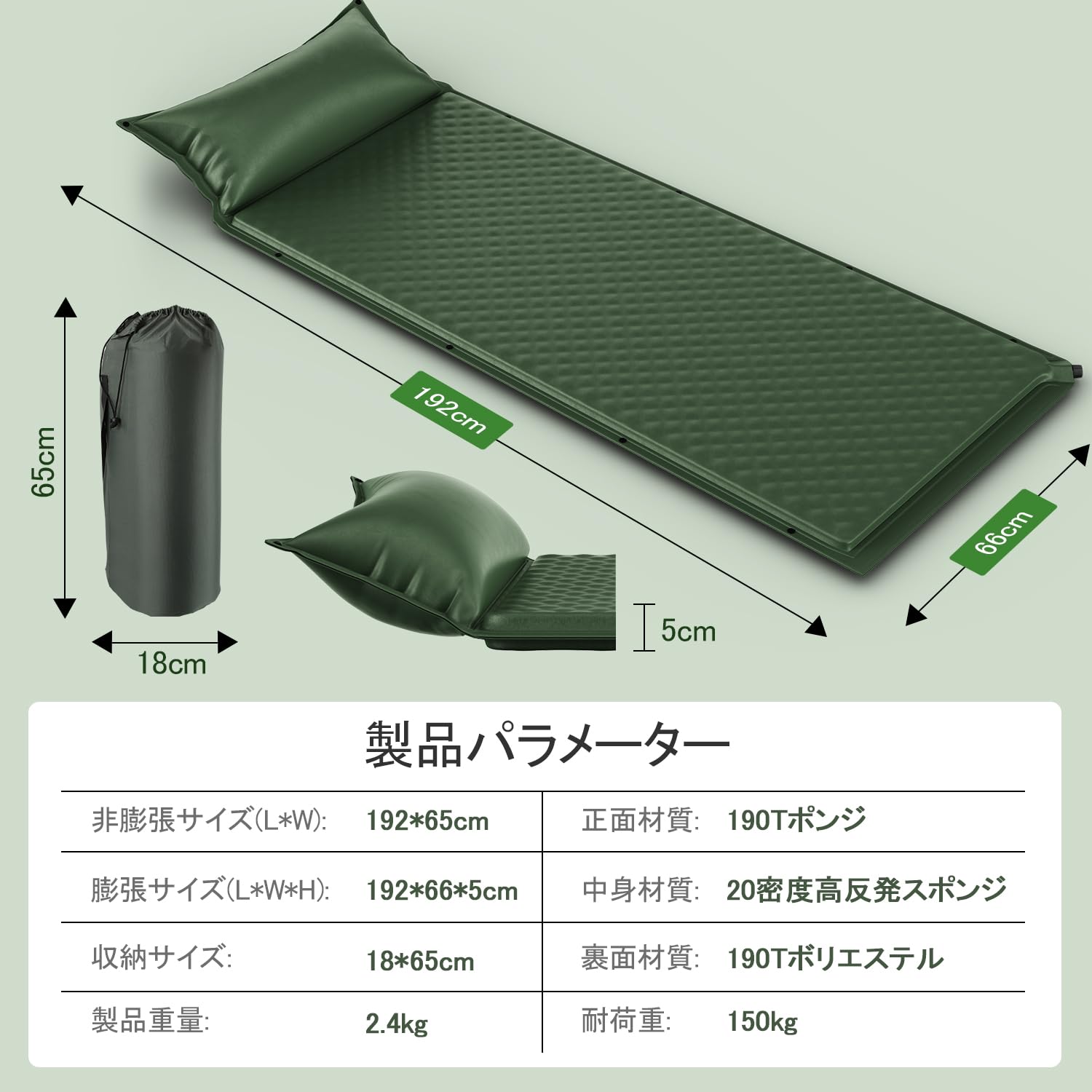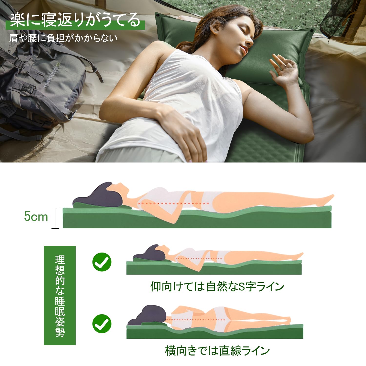 エアーマット キャンプマット【30s膨らむ・5CM厚さ】 高弾性スポンジ エアーベッド R値6.5 超軽量 折り畳 車中泊/防災/テント/持ち運び便利 収納袋付き/キャンプマット/日本語説明書/ゴムバンド2本/補修用シール12枚付き (ふかみどりいろ)