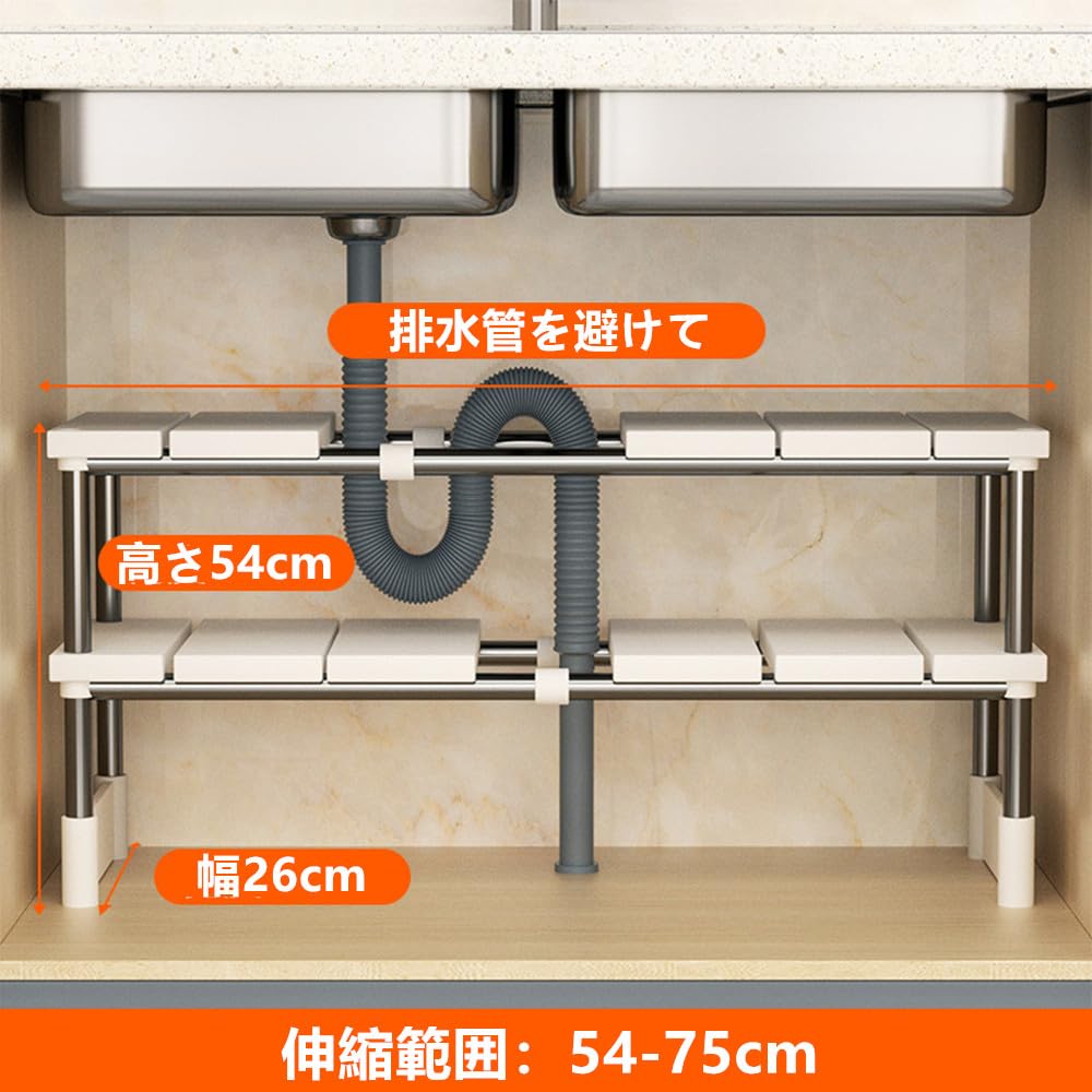 シンク下 収納 キッチンラック 収納ラック 38-70cm 伸縮式の整理ラック シンクした収納 2段 スライド 収納棚 隙間収納 シンク下収納 洗面所 シンク下収納ラック 収納ラック 排水トラップを避けて スペース 有効活用