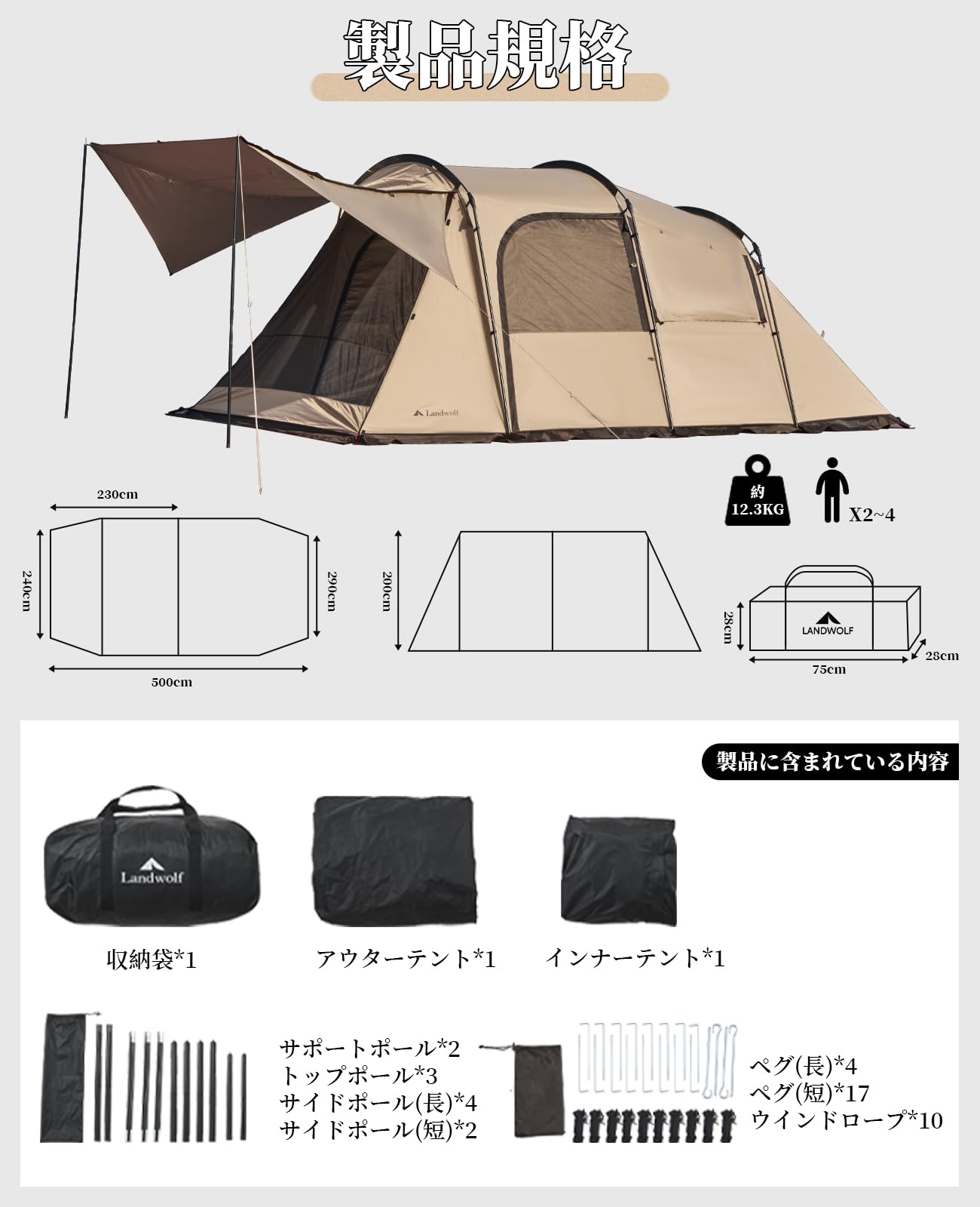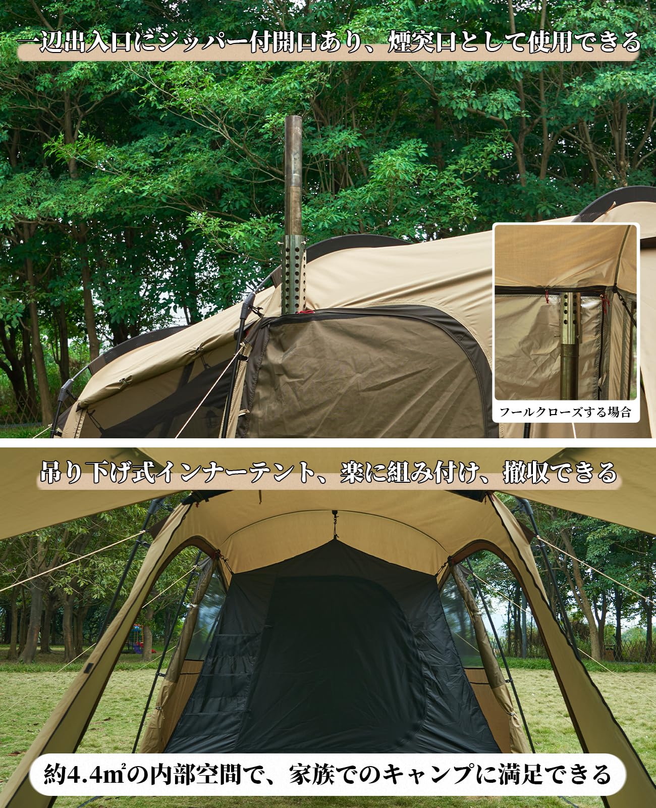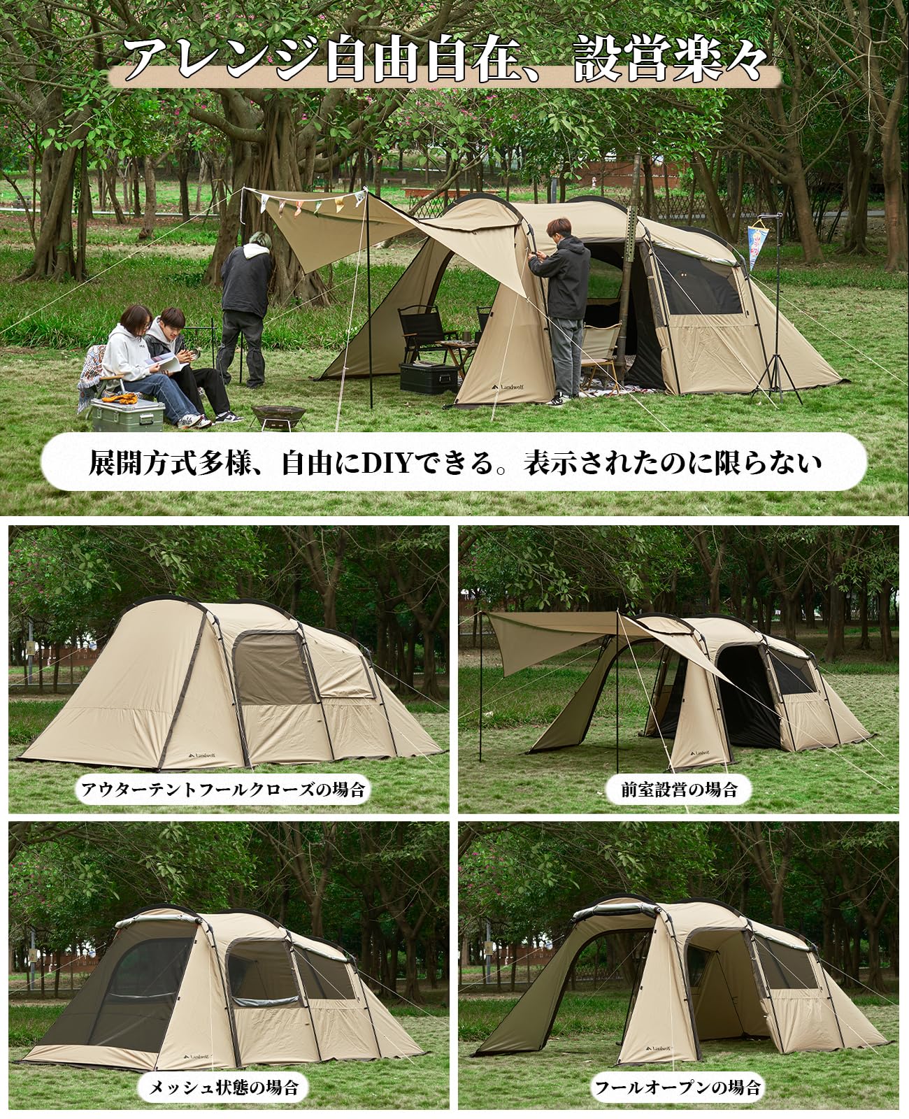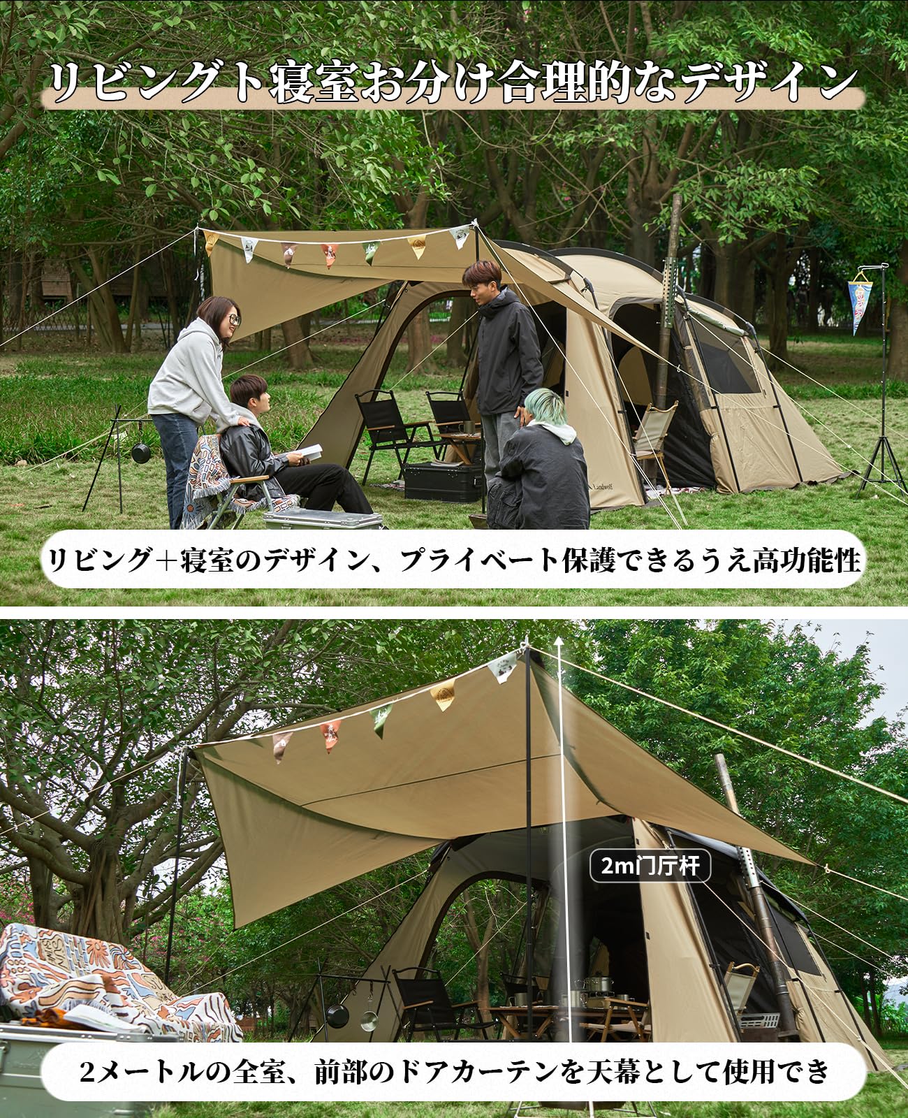 トンネルテント 大型 二室屋敷 2~4人用 ファミリー サポートポール付き キャンプ 遮光 設営簡単 pu3000